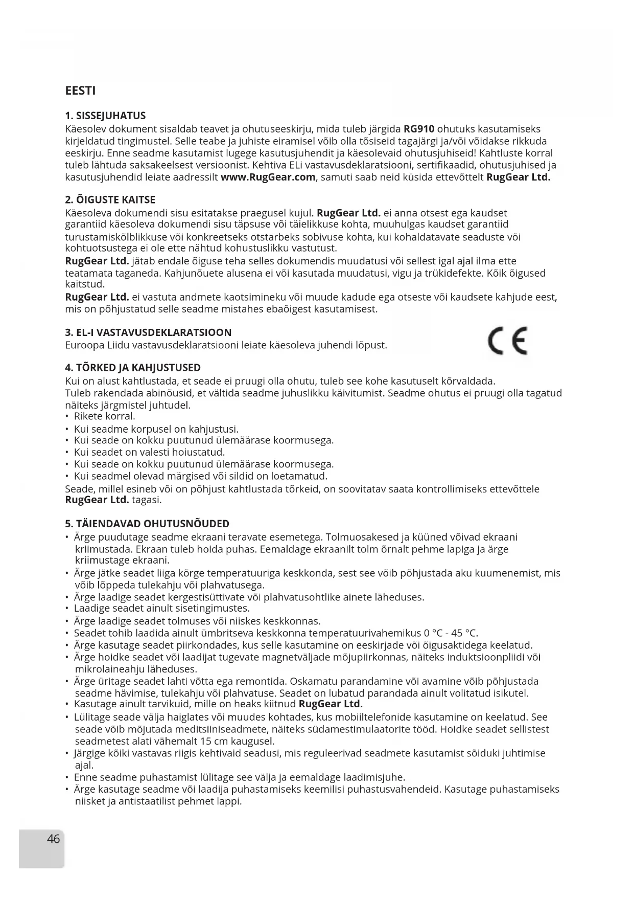 Käesolev dokument sisaldab teavet ja ohutuseeskirju, mida tuleb järgida RG910 ohutuks kasutamiseks kirjeldatud tingimustel. Selle teabe ja juhiste eiramisel võib olla tõsiseid tagajärgi ja/või võidakse rikkuda eeskirju. Enne seadme kasutamist lugege kasutusjuhendit ja käesolevaid ohutusjuhiseid! Kahtluste korral tuleb lähtuda saksakeelsest versioonist. Kehtiva ELi vastavusdeklaratsiooni, sertikaadid, ohutusjuhised ja kasutusjuhendid leiate aadressilt www.RugGear.com, samuti saab neid küsida ettevõttelt RugGear Ltd.
