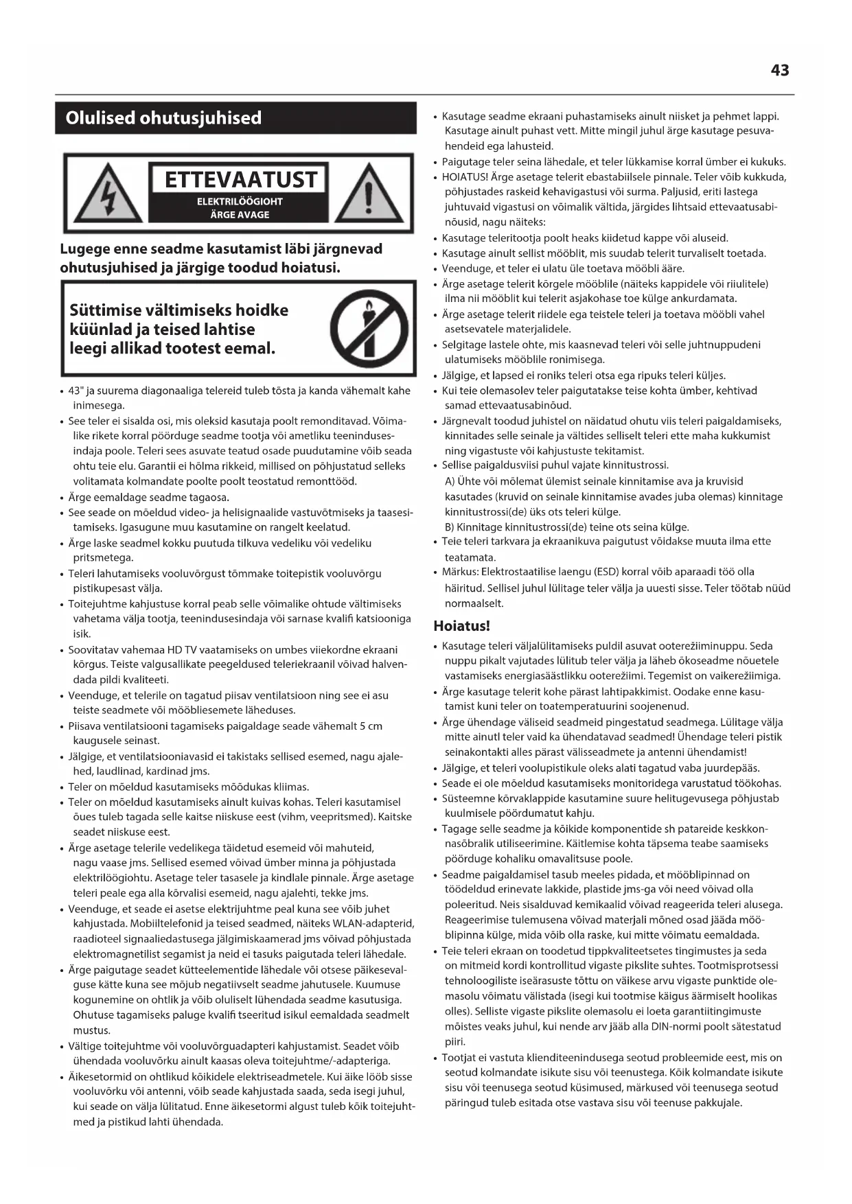 - 43" ja suurema diagonaaliga telereid tuleb tõsta ja kanda vähemalt kahe inimesega.• See teler ei sisalda osi, mis oleksid kasutaja poolt remonditavad. Võima-like rikete korral pöörduge seadme tootja või ametliku teeninduses-indaja poole. Teleri sees asuvate teatud osade puudutamine võib seada ohtu teie elu. Garantii ei hõlma rikkeid, millised on põhjustatud selleks volitamata kolmandate poolte poolt teostatud remonttööd.• Ärge eemaldage seadme tagaosa.• See seade on mõeldud video- ja helisignaalide vastuvõtmiseks ja taasesi-tamiseks. Igasugune muu kasutamine on rangelt keelatud.• Ärge laske seadmel kokku puutuda tilkuva vedeliku või vedeliku pritsmetega.• Teleri lahutamiseks vooluvõrgust tõmmake toitepistik vooluvõrgu pistikupesast välja.• Toitejuhtme kahjustuse korral peab selle võimalike ohtude vältimiseks vahetama välja tootja, teenindusesindaja või sarnase kvali katsiooniga isik.• Soovitatav vahemaa HD TV vaatamiseks on umbes viiekordne ekraani kõrgus. Teiste valgusallikate peegeldused teleriekraanil võivad halven-dada pildi kvaliteeti.• Veenduge, et telerile on tagatud piisav ventilatsioon ning see ei asu teiste seadmete või mööbliesemete läheduses.• Piisava ventilatsiooni tagamiseks paigaldage seade vähemalt 5 cm kaugusele seinast.• Jälgige, et ventilatsiooniavasid ei takistaks sellised esemed, nagu ajale-hed, laudlinad, kardinad jms.• Teler on mõeldud kasutamiseks mõõdukas kliimas.• Teler on mõeldud kasutamiseks ainult kuivas kohas. Teleri kasutamisel õues tuleb tagada selle kaitse niiskuse eest (vihm, veepritsmed). Kaitske seadet niiskuse eest.• Ärge asetage telerile vedelikega täidetud esemeid või mahuteid, nagu vaase jms. Sellised esemed võivad ümber minna ja põhjustada elektrilöögiohtu. Asetage teler tasasele ja kindlale pinnale. Ärge asetage teleri peale ega alla kõrvalisi esemeid, nagu ajalehti, tekke jms.• Veenduge, et seade ei asetse elektrijuhtme peal kuna see võib juhet kahjustada. Mobiiltelefonid ja teised seadmed, näiteks WLAN-adapterid, raadioteel signaaliedastusega jälgimiskaamerad jms võivad põhjustada elektromagnetilist segamist ja neid ei tasuks paigutada teleri lähedale.• Ärge paigutage seadet kütteelementide lähedale või otsese päikeseval-guse kätte kuna see mõjub negatiivselt seadme jahutusele. Kuumuse kogunemine on ohtlik ja võib oluliselt lühendada seadme kasutusiga. Ohutuse tagamiseks paluge kvali tseeritud isikul eemaldada seadmelt mustus.• Vältige toitejuhtme või vooluvõrguadapteri kahjustamist. Seadet võib ühendada vooluvõrku ainult kaasas oleva toitejuhtme/-adapteriga.• Äikesetormid on ohtlikud kõikidele elektriseadmetele. Kui äike lööb sisse vooluvõrku või antenni, võib seade kahjustada saada, seda isegi juhul, kui seade on välja lülitatud. Enne äikesetormi algust tuleb kõik toitejuht-med ja pistikud lahti ühendada.• Kasutage seadme ekraani puhastamiseks ainult niisket ja pehmet lappi. Kasutage ainult puhast vett. Mitte mingil juhul ärge kasutage pesuva-hendeid ega lahusteid.• Paigutage teler seina lähedale, et teler lükkamise korral ümber ei kukuks.• HOIATUS! Ärge asetage telerit ebastabiilsele pinnale. Teler võib kukkuda, põhjustades raskeid kehavigastusi või surma. Paljusid, eriti lastega juhtuvaid vigastusi on võimalik vältida, järgides lihtsaid ettevaatusabi-nõusid, nagu näiteks:• Kasutage teleritootja poolt heaks kiidetud kappe või aluseid.• Kasutage ainult sellist mööblit, mis suudab telerit turvaliselt toetada.• Veenduge, et teler ei ulatu üle toetava mööbli ääre.• Ärge asetage telerit kõrgele mööblile (näiteks kappidele või riiulitele) ilma nii mööblit kui telerit asjakohase toe külge ankurdamata.• Ärge asetage telerit riidele ega teistele teleri ja toetava mööbli vahel asetsevatele materjalidele.• Selgitage lastele ohte, mis kaasnevad teleri või selle juhtnuppudeni ulatumiseks mööblile ronimisega.• Jälgige, et lapsed ei roniks teleri otsa ega ripuks teleri küljes.• Kui teie olemasolev teler paigutatakse teise kohta ümber, kehtivad samad ettevaatusabinõud.• Järgnevalt toodud juhistel on näidatud ohutu viis teleri paigaldamiseks, kinnitades selle seinale ja vältides selliselt teleri ette maha kukkumist ning vigastuste või kahjustuste tekitamist.• Sellise paigaldusviisi puhul vajate kinnitustrossi.A) Ühte või mõlemat ülemist seinale kinnitamise ava ja kruvisid kasutades (kruvid on seinale kinnitamise avades juba olemas) kinnitage kinnitustrossi(de) üks ots teleri külge.B) Kinnitage kinnitustrossi(de) teine ots seina külge.• Teie teleri tarkvara ja ekraanikuva paigutust võidakse muuta ilma ette teatamata.• Märkus: Elektrostaatilise laengu (ESD) korral võib aparaadi töö olla häiritud. Sellisel juhul lülitage teler välja ja uuesti sisse. Teler töötab nüüd normaalselt. Hoiatus!