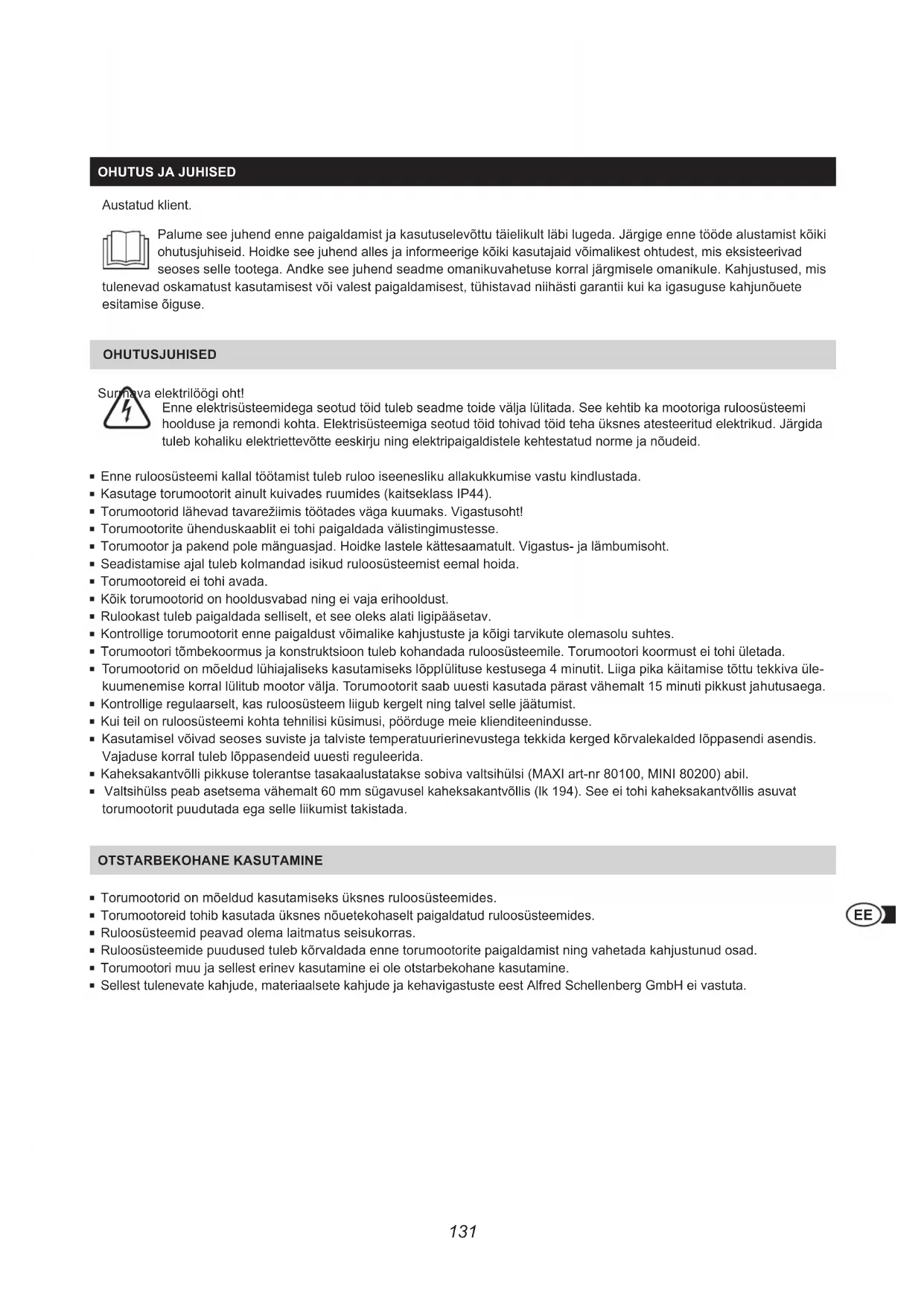 Austatud klient. Palume see juhend enne paigaldamist ja kasutuselevõttu täielikult läbi lugeda. Järgige enne tööde alustamist kõiki ohutusjuhiseid. Hoidke see juhend alles ja informeerige kõiki kasutajaid võimalikest ohtudest, mis eksisteerivad seoses selle tootega. Andke see juhend seadme omanikuvahetuse korral järgmisele omanikule. Kahjustused, mis tulenevad oskamatust kasutamisest või valest paigaldamisest, tühistavad niihästi garantii kui ka igasuguse kahjunõuete esitamise õiguse. OHUTUSJUHISED Surmava elektrilöögi oht! Enne elektrisüsteemidega seotud töid tuleb seadme toide välja lülitada. See kehtib ka mootoriga ruloosüsteemi hoolduse ja remondi kohta. Elektrisüsteemiga seotud töid tohivad töid teha üksnes atesteeritud elektrikud. Järgida tuleb kohaliku elektriettevõtte eeskirju ning elektripaigaldistele kehtestatud norme ja nõudeid. Enne ruloosüsteemi kallal töötamist tuleb ruloo iseenesliku allakukkumise vastu kindlustada. Kasutage torumootorit ainult kuivades ruumides (kaitseklass IP44). Torumootorid lähevad tavarežiimis töötades väga kuumaks. Vigastusoht! Torumootorite ühenduskaablit ei tohi paigaldada välistingimustesse. Torumootor ja pakend pole mänguasjad. Hoidke lastele kättesaamatult. Vigastus- ja lämbumisoht. Seadistamise ajal tuleb kolmandad isikud ruloosüsteemist eemal hoida. Torumootoreid ei tohi avada. Kõik torumootorid on hooldusvabad ning ei vaja erihooldust. Rulookast tuleb paigaldada selliselt, et see oleks alati ligipääsetav. Kontrollige torumootorit enne paigaldust võimalike kahjustuste ja kõigi tarvikute olemasolu suhtes. Torumootori tõmbekoormus ja konstruktsioon tuleb kohandada ruloosüsteemile. Torumootori koormust ei tohi ületada. Torumootorid on mõeldud lühiajaliseks kasutamiseks lõpplülituse kestusega 4 minutit. Liiga pika käitamise tõttu tekkiva üle- kuumenemise korral lülitub mootor välja. Torumootorit saab uuesti kasutada pärast vähemalt 15 minuti pikkust jahutusaega. Kontrollige regulaarselt, kas ruloosüsteem liigub kergelt ning talvel selle jäätumist. Kui teil on ruloosüsteemi kohta tehnilisi küsimusi, pöörduge meie klienditeenindusse. Kasutamisel võivad seoses suviste ja talviste temperatuurierinevustega tekkida kerged kõrvalekalded lõppasendi asendis. Vajaduse korral tuleb lõppasendeid uuesti reguleerida. Kaheksakantvõlli pikkuse tolerantse tasakaalustatakse sobiva valtsihülsi (MAXI art-nr 80100, MINI 80200) abil. Valtsihülss peab asetsema vähemalt 60 mm sügavusel kaheksakantvõllis (lk 194). See ei tohi kaheksakantvõllis asuvat torumootorit puudutada ega selle liikumist takistada. OTSTARBEKOHANE KASUTAmINE Torumootorid on mõeldud kasutamiseks üksnes ruloosüsteemides. Torumootoreid tohib kasutada üksnes nõuetekohaselt paigaldatud ruloosüsteemides. Ruloosüsteemid peavad olema laitmatus seisukorras. Ruloosüsteemide puudused tuleb kõrvaldada enne torumootorite paigaldamist ning vahetada kahjustunud osad. Torumootori muu ja sellest erinev kasutamine ei ole otstarbekohane kasutamine. Sellest tulenevate kahjude, materiaalsete kahjude ja kehavigastuste eest Alfred Schellenberg GmbH ei vastuta.132