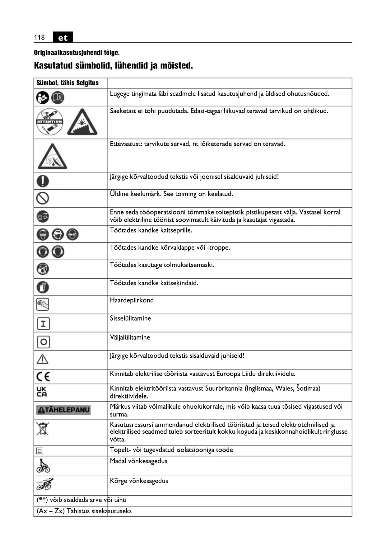 Originaalkasutusjuhendi tõlge. Kasutatud sümbolid, lühendid ja mõisted. Sümbol, tähis Selgitus Lugege tingimata läbi seadmele lisatud kasutusjuhend ja üldised ohutusnõuded. Saeketast ei tohi puudutada. Edasi-tagasi liikuvad teravad tarvikud on ohtlikud. Ettevaatust: tarvikute servad, nt lõiketerade servad on teravad. Järgige kõrvaltoodud tekstis või joonisel sisalduvaid juhiseid! Üldine keelumärk. See toiming on keelatud. Enne seda tööoperatsiooni tõmmake toitepistik pistikupesast välja. Vastasel korral võib elektriline tööriist soovimatult käivituda ja kasutajat vigastada. Töötades kandke kaitseprille. Töötades kandke kõrvaklappe või -troppe. Töötades kasutage tolmukaitsemaski. Töötades kandke kaitsekindaid. Haardepiirkond Sisselülitamine Väljalülitamine Järgige kõrvaltoodud tekstis sisalduvaid juhiseid! Kinnitab elektrilise tööriista vastavust Euroopa Liidu direktiividele. Kinnitab elektritööriista vastavust Suurbritannia (Inglismaa, Wales, Šotimaa) direktiividele. Märkus viitab võimalikule ohuolukorrale, mis võib kaasa tuua tõsised vigastused või surma. Kasutusressursi ammendanud elektrilised tööriistad ja teised elektrotehnilised ja elektrilised seadmed tuleb sorteeritult kokku koguda ja keskkonnahoidlikult ringlusse võtta. Topelt- või tugevdatud isolatsiooniga toode Madal võnkesagedus Kõrge võnkesagedus (**) võib sisaldada arve või tähti (Ax – Zx) Tähistus sisekasutuseks119