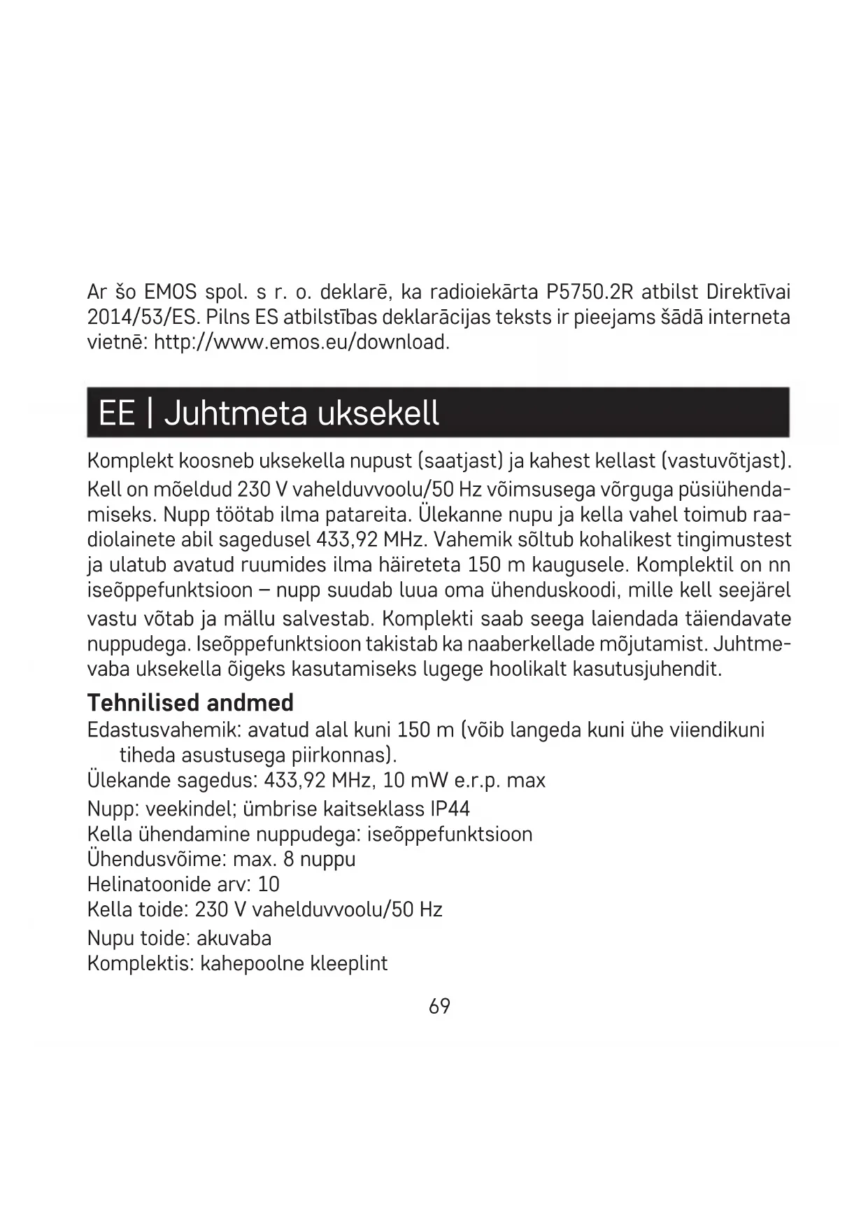 - Šī ierīce nav paredzēta izmantošanai personām (tostarp bērniem), kuru ziskā, uztveres vai garīgā nespēja vai pieredzes un zināšanu trūkums neļauj to droši lietot, ja vien šīs personas neuzrauga vai norādījumus par ierīces lietošanu tām nesniedz par viņu drošību atbildīgā persona. Bērni vienmēr ir jāuzrauga, lai tie nespēlētos ar izstrādājumu.69 Ar šo EMOS spol. s r. o. deklarē, ka radioiekārta P5750.2R atbilst Direktīvai 2014/53/ES. Pilns ES atbilstības deklarācijas teksts ir pieejams šādā interneta vietnē: http://www.emos.eu/download. EE | Juhtmeta uksekell Komplekt koosneb uksekella nupust (saatjast) ja kahest kellast (vastuvõtjast). Kell on mõeldud 230 V vahelduvvoolu/50 Hz võimsusega võrguga püsiühenda- miseks. Nupp töötab ilma patareita. Ülekanne nupu ja kella vahel toimub raa- diolainete abil sagedusel 433,92 MHz. Vahemik sõltub kohalikest tingimustest ja ulatub avatud ruumides ilma häireteta 150 m kaugusele. Komplektil on nn iseõppefunktsioon – nupp suudab luua oma ühenduskoodi, mille kell seejärel vastu võtab ja mällu salvestab. Komplekti saab seega laiendada täiendavate nuppudega. Iseõppefunktsioon takistab ka naaberkellade mõjutamist. Juhtme- vaba uksekella õigeks kasutamiseks lugege hoolikalt kasutusjuhendit. Tehnilised andmed Edastusvahemik: avatud alal kuni 150 m (võib langeda kuni ühe viiendikuni tiheda asustusega piirkonnas). Ülekande sagedus: 433,92 MHz, 10 mW e.r.p. max Nupp: veekindel; ümbrise kaitseklass IP44 Kella ühendamine nuppudega: iseõppefunktsioon Ühendusvõime: max. 8 nuppu Helinatoonide arv: 10 Kella toide: 230 V vahelduvvoolu/50 Hz Nupu toide: akuvaba Komplektis: kahepoolne kleeplint70 Kella kirjeldus (vt joonist 1) 1 – kella LED 2 – ühendamise/helitugevuse seadistamise nupp 3 – helinatooni vahetamine 4 – kõlar Nuppude kirjeldus (vt joonist 2) 1 – nupu LED 2 – helinanupp 3 – avaus patareipesa kaane avamiseks 4 – avad seinale kinnitamiseks Nupu ühendamine kellaga
