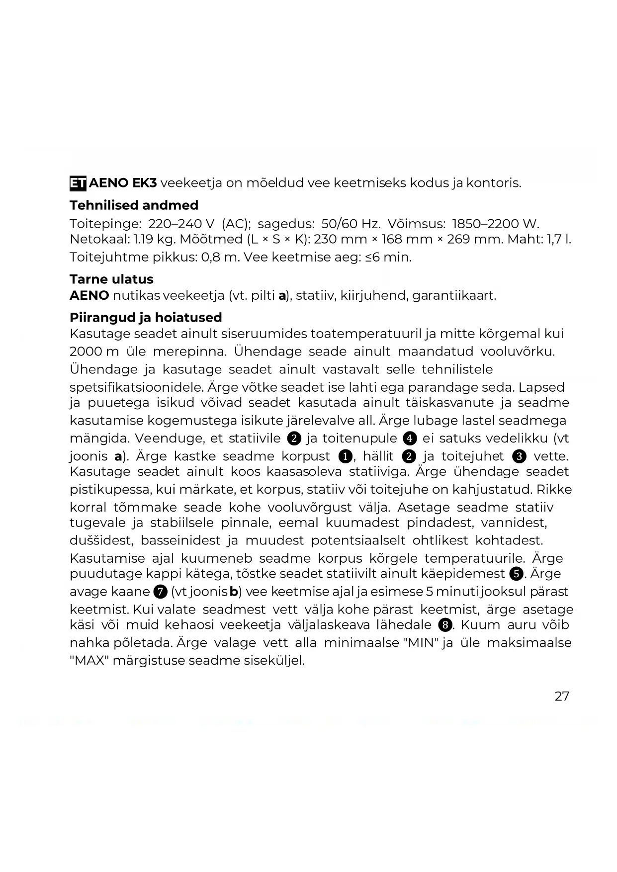 Diese Symbole weisen darauf hin, dass Sie bei der Entsorgung des Geräts, seiner Batterien und Akkus sowie seines elektrischen und elektronischen Zubehörs Elektro- und Elektronikgeräte-Abfall (WEEE) und Entsorgungsvorschriften für Batterien und Akkumulatoren befolgen müssen. Gemäß den Vorschriften müssen diese Geräte am Ende ihrer Nutzungsdauer getrennt entsorgt werden. Entsorgen Sie das Gerät, seine Batterien und Akkus sowie sein elektrisches und elektronisches Zubehör nie zusammen mit unsortiertem Siedlungsabfall, da dies umweltschädlich ist. Um dieses Gerät zu entsorgen, muss es im Geschäft zurückgegeben oder bei einem örtlichen Recyclingzentrum abgegeben werden. Nähere Informationen zum örtlichen Müllentsorgungssystem erhalten Sie auch direkt beim zuständigen Gemeindeamt. Die Garantiezeit und Lebensdauer beträgt 2 Jahre ab dem Kaufdatum des Produkts. Herstellerangaben: ASBISc Enterprises PLC, Agios Athanasios, Diamond Court, 43 Colonakiou Street, 4103 Limassol, Zypern. Hergestellt in China. Aktuelle Informationen und detaillierte Gerätebeschreibungen sowie Anschlussanleitungen, Zertifikate, Qualitätsansprüche und Garantieinformationen stehen unter aeno.com/documents zum Download bereit. Alle Warenzeichen und Markennamen sind Eigentum der jeweiligen Inhaber.27 ET AENO EK3 veekeetja on mõeldud vee keetmiseks kodus ja kontoris. Tehnilised andmed Toitepinge: 220–240 V (AC); sagedus: 50/60 Hz. Võimsus: 1850–2200 W. Netokaal: 1.19 kg. Mõõtmed (L × S × K): 230 mm × 168 mm × 269 mm. Maht: 1,7 l. Toitejuhtme pikkus: 0,8 m. Vee keetmise aeg: ≤6 min. Tarne ulatus AENO nutikas veekeetja (vt. pilti a), statiiv, kiirjuhend, garantiikaart. Piirangud ja hoiatused Kasutage seadet ainult siseruumides toatemperatuuril ja mitte kõrgemal kui 2000 m üle merepinna. Ühendage seade ainult maandatud vooluvõrku. Ühendage ja kasutage seadet ainult vastavalt selle tehnilistele spetsifikatsioonidele. Ärge võtke seadet ise lahti ega parandage seda. Lapsed ja puuetega isikud võivad seadet kasutada ainult täiskasvanute ja seadme kasutamise kogemustega isikute järelevalve all. Ärge lubage lastel seadmega mängida. Veenduge, et statiivile ❷ ja toitenupule ❹ ei satuks vedelikku (vt joonis a). Ärge kastke seadme korpust ❶, hällit ❷ ja toitejuhet ❸ vette. Kasutage seadet ainult koos kaasasoleva statiiviga. Ärge ühendage seadet pistikupessa, kui märkate, et korpus, statiiv või toitejuhe on kahjustatud. Rikke korral tõmmake seade kohe vooluvõrgust välja. Asetage seadme statiiv tugevale ja stabiilsele pinnale, eemal kuumadest pindadest, vannidest, duššidest, basseinidest ja muudest potentsiaalselt ohtlikest kohtadest. Kasutamise ajal kuumeneb seadme korpus kõrgele temperatuurile. Ärge puudutage kappi kätega, tõstke seadet statiivilt ainult käepidemest ❺. Ärge avage kaane ❼ (vt joonis b) vee keetmise ajal ja esimese 5 minuti jooksul pärast keetmist. Kui valate seadmest vett välja kohe pärast keetmist, ärge asetage käsi või muid kehaosi veekeetja väljalaskeava lähedale ❽. Kuum auru võib nahka põletada. Ärge valage vett alla minimaalse "MIN" ja üle maksimaalse "MAX" märgistuse seadme siseküljel.28 Seadme ettevalmistamine tööks Enne esmakordset kasutamist täitke veekeetja märgini "MAX", keetke ja tühjendage vesi. Seadme kasutamine Ühendage voolujuhe ❸ veekeetja alusele ❷ pistikupessa (vt joonis c). Avage kaas ❻ ja valage veekeetjasse vett ❶, kuid ärge ületage taset "MAX". Lülitage sisse lüliti ❹ ja lülitil olev kontroll-LED süttib. Kui vesi veekeetjas keeb, lülitub seade automaatselt välja. Lüliti ❹ valgusdiood kustub. Eemaldage toitejuhtme pistik pistikupesast, kui olete selle kasutamise lõpetanud. Hooldus Eemaldage regulaarselt veekeetja sisemusest lubjakivi. Kui veekeetjat kasutatakse (3–5 korda päevas), on soovitatav seda kord kuus katlakivist puhastada, kui teie piirkonna vesi on kõva või väga kõva. Kui vesi on pehme või keskmiselt kõva, võite seda iga 2–3 kuu tagant katlakivist puhastada. Katlakivieemaldamiseks võite kasutada 8 % äädika või sidrunhappe lahust (30 g sidrunhapet 0,5 l vee kohta). Valage 0,5 l äädika või sidrunhappe lahust veekeetjale ja jätke 2 tunniks keetmata. Seejärel valage veekeetja sisu välja ja keetke selles vett 4–5 korda enne järgmist kasutamist. Veekeetja välispinda võib puhastada kuiva lapiga või neutraalse pesuvahendi lahusega niisutatud lapiga. Pärast puhastusvahendi kasutamist pühkige veekeetja pind puhta, kergelt niisutatud lapiga ja seejärel pühkige kuivaks. Statiivi saab puhastada ainult kuiva lapiga. Ärge kunagi kasutage veekeetja ja aluse puhastamiseks abrasiivseid puhastusvahendeid, bensiini, lahjendit jne. Võimalike rikete tõrkeotsing Seade ei lülitu sisse. Võimalik põhjus: puudub vahelduvvoolu võrgupinge. Lahendus: Kontrollige teise seadme ühendamise teel, kas toide on olemas. Võrgupinge on olemas, kuid veekeetja ei lülitu sisse. Võimalik põhjus: veepuudus veekeetjas või ebapiisav veekogus. Lahendus: Valage vesi veekeetjasse seadme korpuse siseküljel olevast märgist "Min" kõrgemale.29 Võrgupinge ja vesi on veekeetjas olemas, kuid seade ei lülitu sisse. Võimalik põhjus: lühis seadme vooluahelas. Lahendus: võtke ühendust teeninduskeskusega. HOIATUS! Kui ükski võimalikest lahendustest ei lahenda teie probleemi, võtke ühendust oma tarnija või teeninduskeskusega. Ärge võtke seadet lahti ega üritage seda ise parandada.