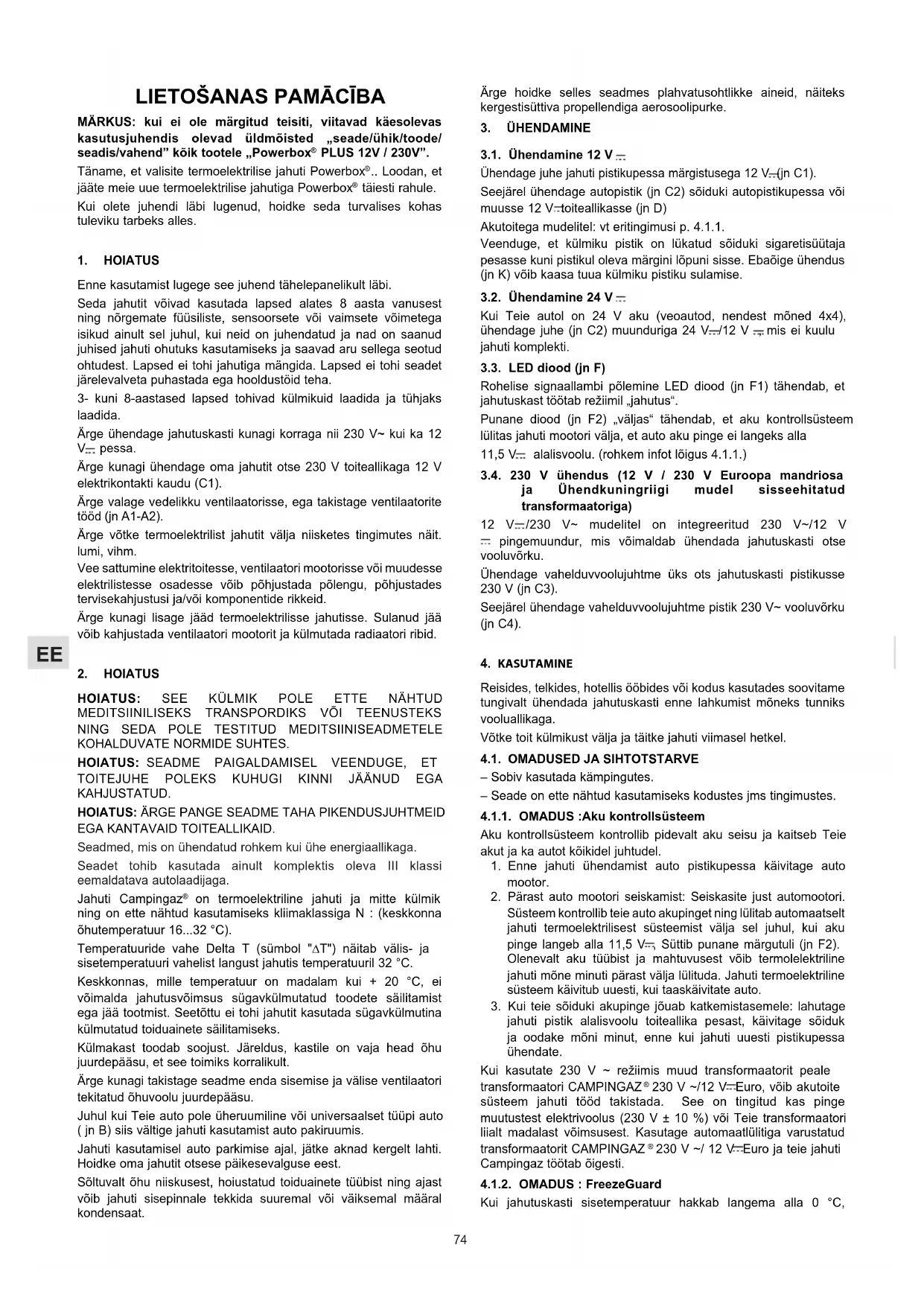 230 V ~/12 V Euro, võib akutoite süsteem jahuti tööd takistada. See on tingitud kas pinge muutustest elektrivoolus (230 V ± 10 %) või Teie transformaatori liialt madalast võimsusest. Kasutage automaatlülitiga varustatud transformaatorit CAMPINGAZ