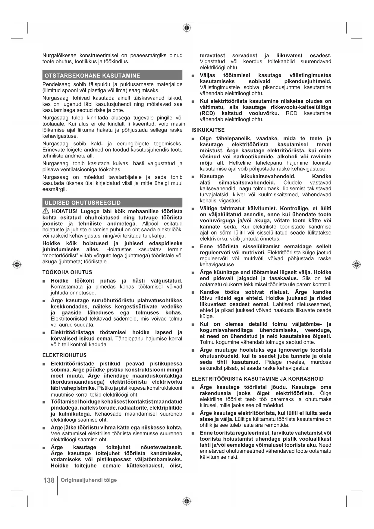 Originaaljuhendi tõlge■ Hoidke kasutuses mitteolevaid elektritööriistu lastele kättesaamatus kohas ja ärge lubage elektritööriista mittetundvaid või kasutusjuhendiga mittetutvunud isikuid elektritööriista kasutada. Oskamatu kasutaja käes olev elektritööriist on ohtlik. ■ Hooldage elektritööriistu ja tarvikuid. Kontrollige liikuvate osade nihkumist või kinnikiilumist, osade purunemist ja muid tingimusi, mis võivad elektritööriista tööd mõjutada. Kui mõni osa on vigastatud, siis laske seade enne kasutamist ära parandada. Paljud õnnetused on põhjustatud halvasti hooldatud elektritööriistadest. ■ Hoidke lõiketerad teravad ja puhtad. Hästi hooldatud teravate lõikeservadega lõikeriistad kiiluvad kinni väiksema tõenäosusega ja neid on lihtsam juhtida. ■ Kasutage elektrilist tööriista, tarvikuid, otsakuid jms kooskõlas nende juhistega ning võttes arvesse töötingimusi ja teostatavat tööd. Tööoperatsiooniks mitte ettenähtud elektritööriista kasutamine võib tekitada ohtliku olukorra. ■ Hoidke käepidemed ja haardepinnad kuivad, puhtad ning õli- ja määrdevabad. Ootamatutes olukordades ei saa libedate käepidemete ja haardepindadega tööriista ohutult käsitseda ega kontrollida.