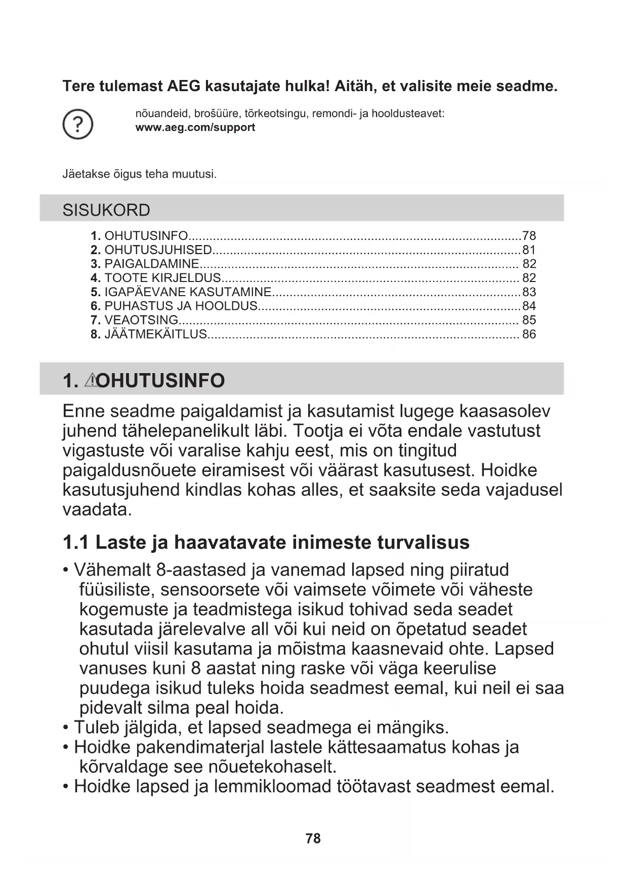- Vähemalt 8-aastased ja vanemad lapsed ning piiratud füüsiliste, sensoorsete või vaimsete võimete või väheste kogemuste ja teadmistega isikud tohivad seda seadet kasutada järelevalve all või kui neid on õpetatud seadet ohutul viisil kasutama ja mõistma kaasnevaid ohte. Lapsed vanuses kuni 8 aastat ning raske või väga keerulise puudega isikud tuleks hoida seadmest eemal, kui neil ei saa pidevalt silma peal hoida.