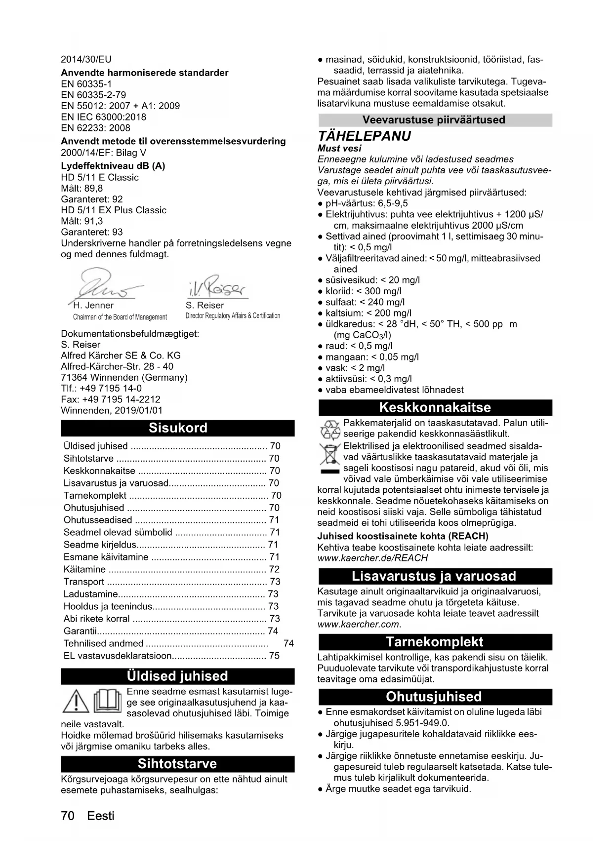 dB(A) 91 9170 Eesti 2014/30/EU Anvendte harmoniserede standarder EN 60335-1 EN 60335-2-79 EN 55012: 2007 + A1: 2009 EN IEC 63000:2018 EN 62233: 2008 Anvendt metode til overensstemmelsesvurdering 2000/14/EF: Bilag V Lydeffektniveau dB (A) HD 5/11 E Classic Målt: 89,8 Garanteret: 92 HD 5/11 EX Plus Classic Målt: 91,3 Garanteret: 93 Underskriverne handler på forretningsledelsens vegne og med dennes fuldmagt. Dokumentationsbefuldmægtiget: S. Reiser Alfred Kärcher SE & Co. KG Alfred-Kärcher-Str. 28 - 40 71364 Winnenden (Germany) Tlf.: +49 7195 14-0 Fax: +49 7195 14-2212 Winnenden, 2019/01/01 Sisukord Üldised juhised Enne seadme esmast kasutamist luge- ge see originaalkasutusjuhend ja kaa- sasolevad ohutusjuhised läbi. Toimige neile vastavalt. Hoidke mõlemad brošüürid hilisemaks kasutamiseks või järgmise omaniku tarbeks alles. Sihtotstarve Kõrgsurvejoaga kõrgsurvepesur on ette nähtud ainult esemete puhastamiseks, sealhulgas: ● masinad, sõidukid, konstruktsioonid, tööriistad, fas- saadid, terrassid ja aiatehnika. Pesuainet saab lisada valikuliste tarvikutega. Tugeva- ma määrdumise korral soovitame kasutada spetsiaalse lisatarvikuna mustuse eemaldamise otsakut. Veevarustuse piirväärtused TÄHELEPANU Must vesi Enneaegne kulumine või ladestused seadmes Varustage seadet ainult puhta vee või taaskasutusvee- ga, mis ei ületa piirväärtusi. Veevarustusele kehtivad järgmised piirväärtused: ● pH-väärtus: 6,5-9,5 ● Elektrijuhtivus: puhta vee elektrijuhtivus + 1200 µS/ cm, maksimaalne elektrijuhtivus 2000 µS/cm ● Settivad ained (proovimaht 1 l, settimisaeg 30 minu- tit): < 0,5 mg/l ● Väljafiltreeritavad ained: < 50 mg/l, mitteabrasiivsed ained ● süsivesikud: < 20 mg/l ● kloriid: < 300 mg/l ● sulfaat: < 240 mg/l ● kaltsium: < 200 mg/l ● üldkaredus: < 28 °dH, < 50° TH, < 500 pp