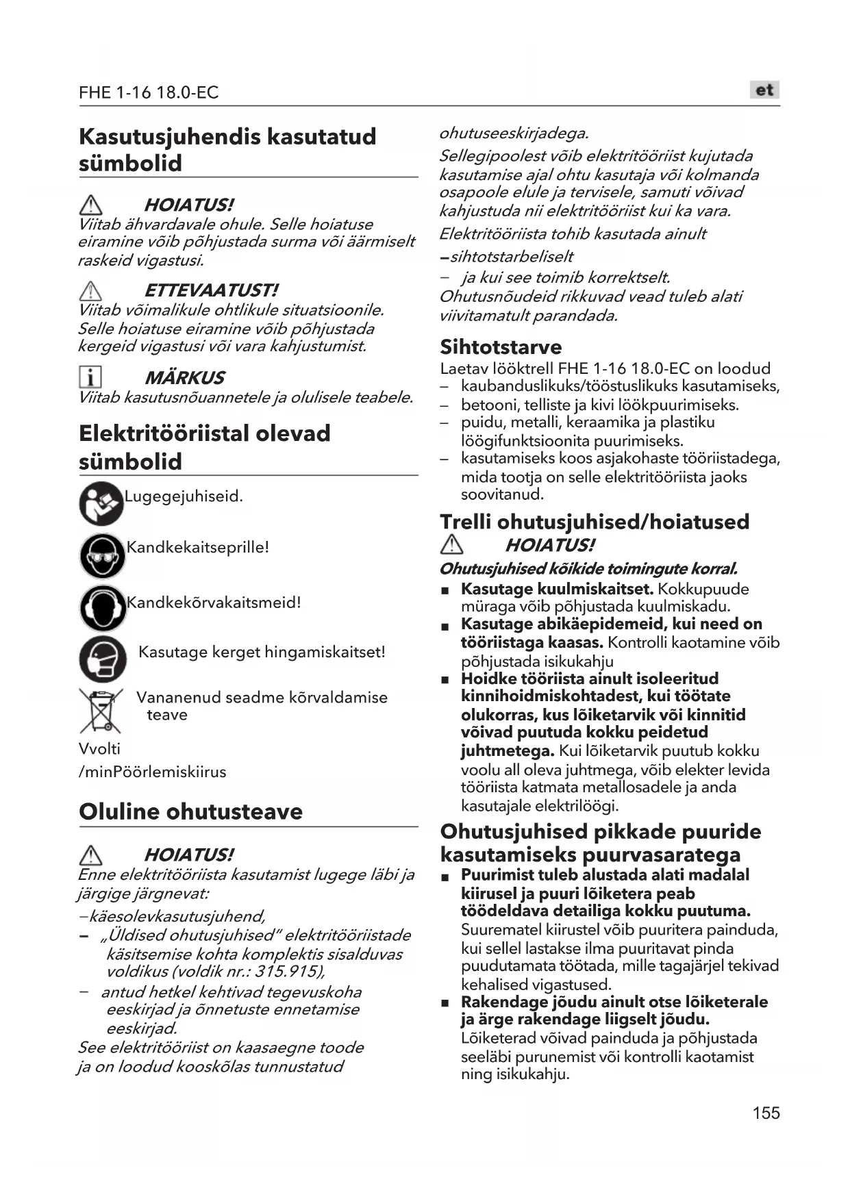 Kasutusjuhendis kasutatud sümbolid HOIATUS! Viitab ähvardavale ohule. Selle hoiatuse eiramine võib põhjustada surma või äärmiselt raskeid vigastusi. ETTEVAATUST! Viitab võimalikule ohtlikule situatsioonile. Selle hoiatuse eiramine võib põhjustada kergeid vigastusi või vara kahjustumist. MÄRKUS Viitab kasutusnõuannetele ja olulisele teabele. Elektritööriistal olevad sümbolid Lugege juhiseid. Kandke kaitseprille! Kandke kõrvakaitsmeid! Kasutage kerget hingamiskaitset! Vananenud seadme kõrvaldamise teave V volti /min Pöörlemiskiirus Oluline ohutusteave HOIATUS! Enne elektritööriista kasutamist lugege läbi ja järgige järgnevat: käesolev kasutusjuhend, „Üldised ohutusjuhised“ elektritööriistade käsitsemise kohta komplektis sisalduvas voldikus (voldik nr.: 315.915), antud hetkel kehtivad tegevuskoha eeskirjad ja õnnetuste ennetamise eeskirjad. See elektritööriist on kaasaegne toode ja on loodud kooskõlas tunnustatud ohutuseeskirjadega. Sellegipoolest võib elektritööriist kujutada kasutamise ajal ohtu kasutaja või kolmanda osapoole elule ja tervisele, samuti võivad kahjustuda nii elektritööriist kui ka vara. Elektritööriista tohib kasutada ainult sihtotstarbeliselt ja kui see toimib korrektselt. Ohutusnõudeid rikkuvad vead tuleb alati viivitamatult parandada. Sihtotstarve Laetav lööktrell FHE 1-16 18.0-EC on loodud