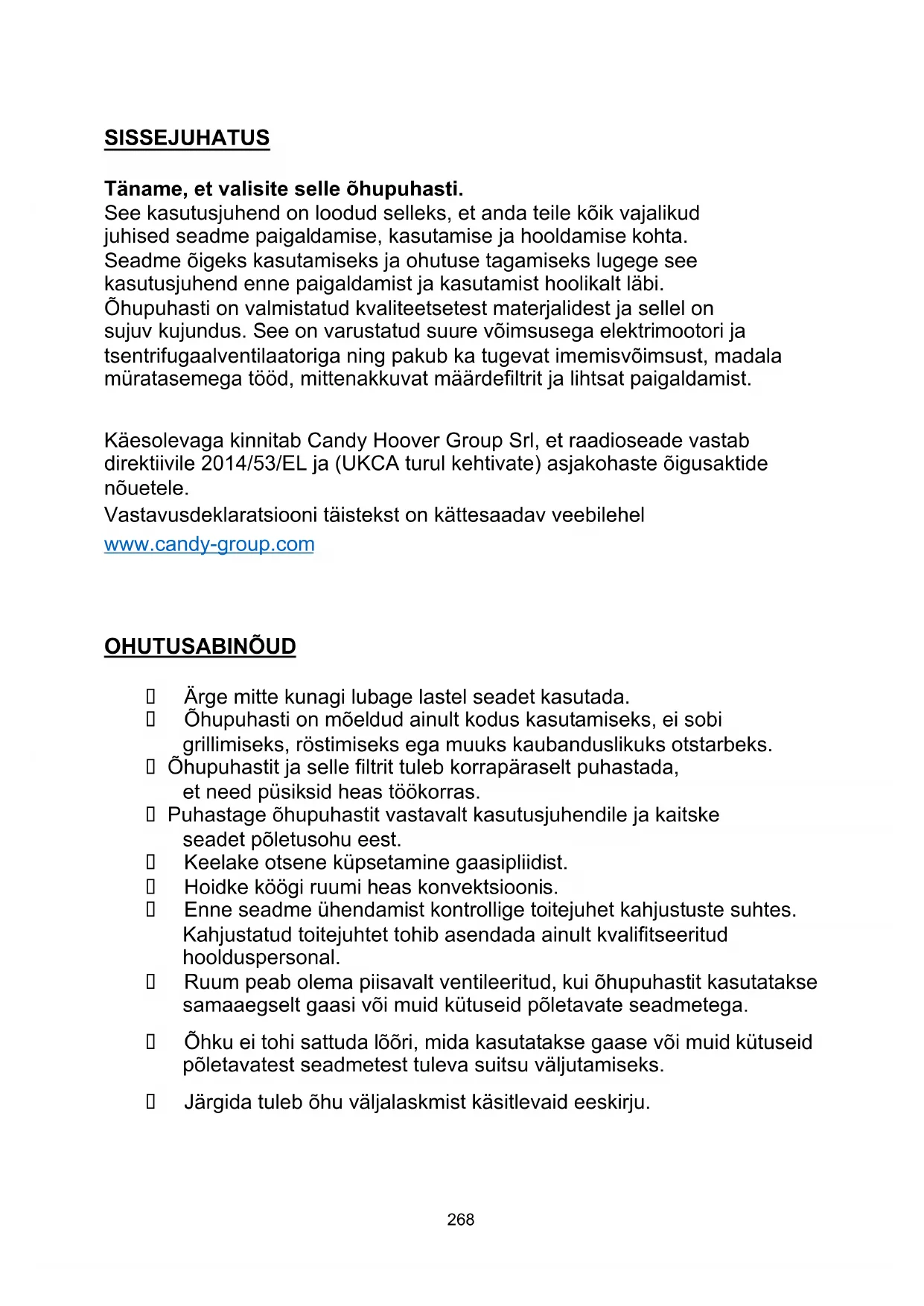 RKEOTSING DIREKTIIVIDE VASTAVUS KESKK ONNAKAITSE 267SISSEJUHATUS Täname, et valisite selle õhupuhasti. See kasutusjuhend on loodud selleks, et anda teile kõik vajalikud juhised seadme paigaldamise, kasutamise ja hooldamise kohta. Seadme õigeks kasutamiseks ja ohutuse tagamiseks lugege see kasutusjuhend enne paigaldamist ja kasutamist hoolikalt läbi. Õhupuhasti on valmistatud kvaliteetsetest materjalidest ja sellel on sujuv kujundus. See on varustatud suure võimsusega elektrimootori ja tsentrifugaalventilaatoriga ning pakub ka tugevat imemisvõimsust, madala müratasemega tööd, mittenakkuvat määrdefiltrit ja lihtsat paigaldamist. Käesolevaga kinnitab Candy Hoover Group Srl, et raadioseade vastab direktiivile 2014/53/EL ja (UKCA turul kehtivate) asjakohaste õigusaktide nõuetele. Vastavusdeklaratsiooni täistekst on kättesaadav veebilehel www.candy-group.com OHUTUSABINÕUD Ärge mitte kunagi lubage lastel seadet kasutada. Õhupuhasti on mõeldud ainult kodus kasutamiseks, ei sobi grillimiseks, röstimiseks ega muuks kaubanduslikuks otstarbeks. Õhupuhastit ja selle filtrit tuleb korrapäraselt puhastada, et need püsiksid heas töökorras. Puhastage õhupuhastit vastavalt kasutusjuhendile ja kaitske seadet põletusohu eest. Keelake otsene küpsetamine gaasipliidist. Hoidke köögi ruumi heas konvektsioonis. Enne seadme ühendamist kontrollige toitejuhet kahjustuste suhtes. Kahjustatud toitejuhtet tohib asendada ainult kvalifitseeritud hoolduspersonal. Ruum peab olema piisavalt ventileeritud, kui õhupuhastit kasutatakse samaaegselt gaasi või muid kütuseid põletavate seadmetega. Õhku ei tohi sattuda lõõri, mida kasutatakse gaase või muid kütuseid põletavatest seadmetest tuleva suitsu väljutamiseks. Järgida tuleb õhu väljalaskmist käsitlevaid eeskirju.