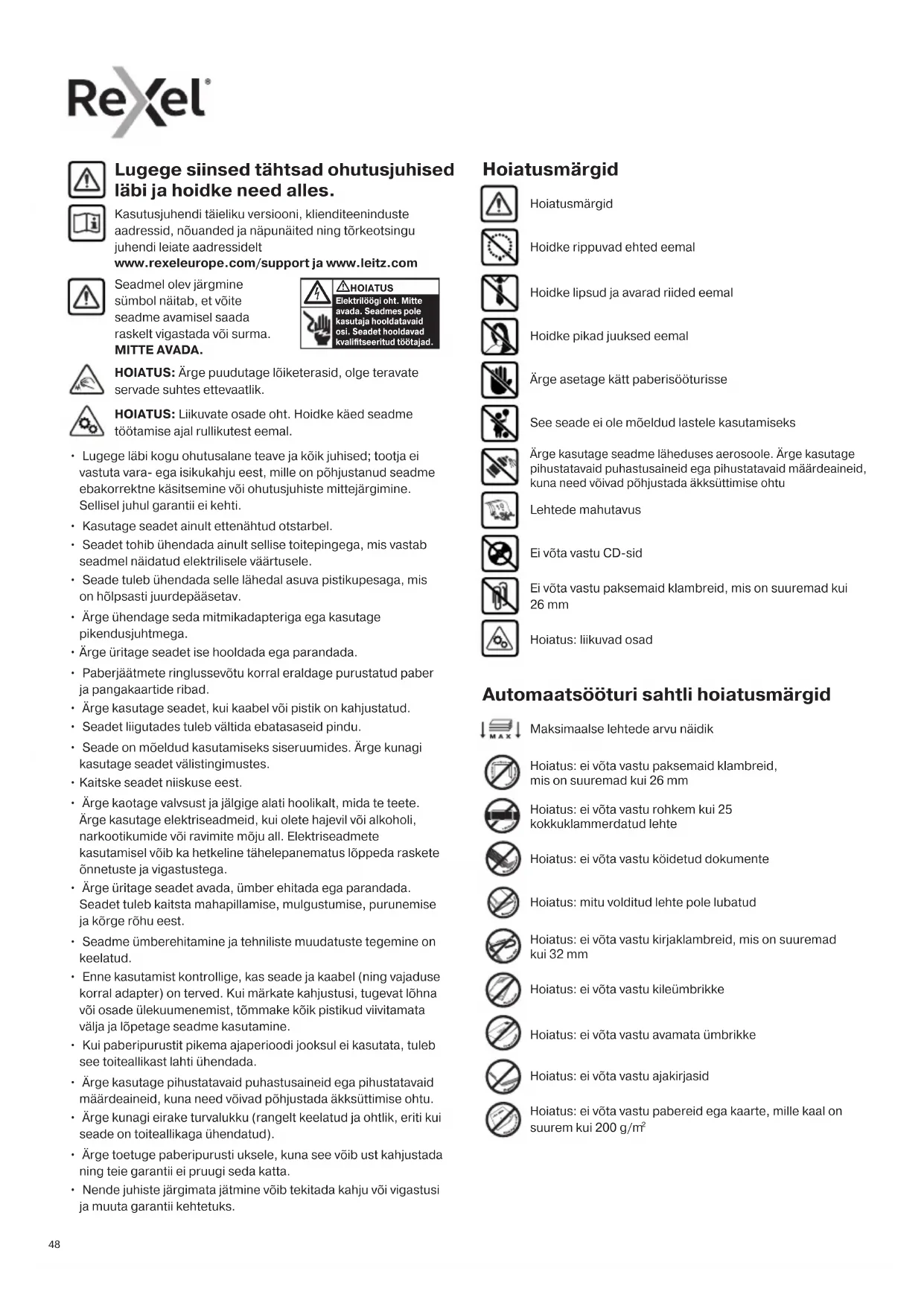 - Nende juhiste järgimata jätmine võib tekitada kahju või vigastusi ja muuta garantii kehtetuks. Lugege siinsed tähtsad ohutusjuhised läbi ja hoidke need alles. Kasutusjuhendi täieliku versiooni, klienditeeninduste aadressid, nõuanded ja näpunäited ning tõrkeotsingu juhendi leiate aadressidelt www.rexeleurope.com/support ja www.leitz.com Hoidke rippuvad ehted eemal Hoidke lipsud ja avarad riided eemal Hoiatusmärgid Hoidke pikad juuksed eemal Ärge asetage kätt paberisööturisse Hoiatusmärgid Lehtede mahutavus Ei võta vastu CD-sid Ei võta vastu paksemaid klambreid, mis on suuremad kui 26 mm Hoiatus: liikuvad osad HOIATUS: Ärge puudutage lõiketerasid, olge teravate servade suhtes ettevaatlik. HOIATUS: Liikuvate osade oht. Hoidke käed seadme töötamise ajal rullikutest eemal. See seade ei ole mõeldud lastele kasutamiseks Ärge kasutage seadme läheduses aerosoole. Ärge kasutage pihustatavaid puhastusaineid ega pihustatavaid määrdeaineid, kuna need võivad põhjustada äkksüttimise ohtu Hoiatus: ei võta vastu paksemaid klambreid, mis on suuremad kui 26 mm Hoiatus: ei võta vastu köidetud dokumente Hoiatus: ei võta vastu rohkem kui 25 kokkuklammerdatud lehte Automaatsööturi sahtli hoiatusmärgid Hoiatus: mitu volditud lehte pole lubatud Hoiatus: ei võta vastu kirjaklambreid, mis on suuremad kui 32 mm Maksimaalse lehtede arvu näidik Hoiatus: ei võta vastu ajakirjasid Hoiatus: ei võta vastu pabereid ega kaarte, mille kaal on suurem kui 200 g/m