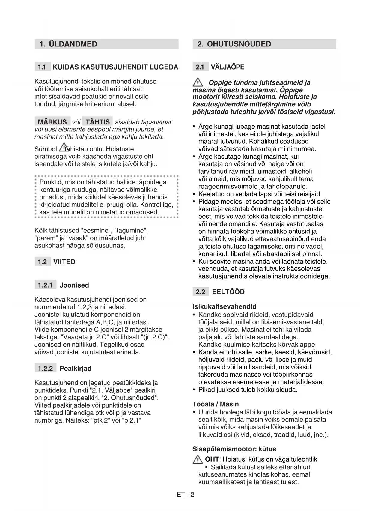 - Tuleohutuse eesmärgil ei tohi töötava mootoriga masinat jätta kõrge rohu sisse. Purunemiste või õnnetuste korral töö ajal seisata koheselt mootor ja eemaldada masin, et vältida lisakahjustusi; õnnetuste puhul vigastustega endale või teistele alustada koheselt olukorrale vastavate esmaabivõtetega ja pöörduda vajaliku ravi saamiseks tervishoiuasutuse poole. Eemaldada hoolikalt võimalikud jäägid, mis võiksid põhjustada tähelepanuta jäämise korral kahjustusi või vigastusi inimestele või loomadele.ET - 4 Kasutuspiirangud