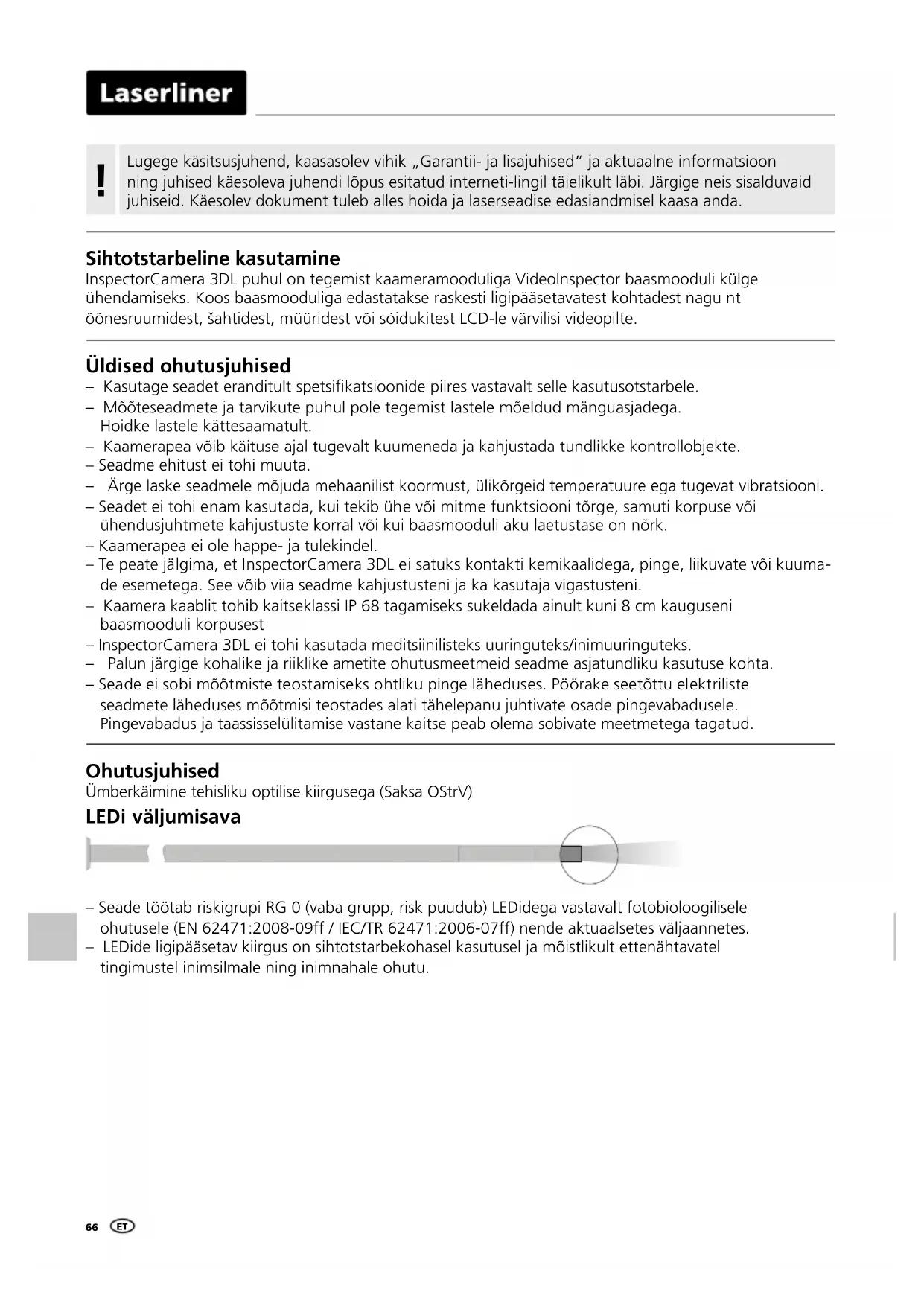 Sihtotstarbeline kasutamine InspectorCamera 3DL puhul on tegemist kaameramooduliga VideoInspector baasmooduli külge ühendamiseks. Koos baasmooduliga edastatakse raskesti ligipääsetavatest kohtadest nagu nt õõnesruumidest, šahtidest, müüridest või sõidukitest LCD-le värvilisi videopilte. Üldised ohutusjuhised – Kasutage seadet eranditult spetsikatsioonide piires vastavalt selle kasutusotstarbele. – Mõõteseadmete ja tarvikute puhul pole tegemist lastele mõeldud mänguasjadega. Hoidke lastele kättesaamatult. – Kaamerapea võib käituse ajal tugevalt kuumeneda ja kahjustada tundlikke kontrollobjekte. – Seadme ehitust ei tohi muuta. – Ärge laske seadmele mõjuda mehaanilist koormust, ülikõrgeid temperatuure ega tugevat vibratsiooni. – Seadet ei tohi enam kasutada, kui tekib ühe või mitme funktsiooni tõrge, samuti korpuse või ühendusjuhtmete kahjustuste korral või kui baasmooduli aku laetustase on nõrk. – Kaamerapea ei ole happe- ja tulekindel. – Te peate jälgima, et InspectorCamera 3DL ei satuks kontakti kemikaalidega, pinge, liikuvate või kuuma- de esemetega. See võib viia seadme kahjustusteni ja ka kasutaja vigastusteni. – Kaamera kaablit tohib kaitseklassi IP 68 tagamiseks sukeldada ainult kuni 8 cm kauguseni baasmooduli korpusest – InspectorCamera 3DL ei tohi kasutada meditsiinilisteks uuringuteks/inimuuringuteks. – Palun järgige kohalike ja riiklike ametite ohutusmeetmeid seadme asjatundliku kasutuse kohta. – Seade ei sobi mõõtmiste teostamiseks ohtliku pinge läheduses. Pöörake seetõttu elektriliste seadmete läheduses mõõtmisi teostades alati tähelepanu juhtivate osade pingevabadusele. Pingevabadus ja taassisselülitamise vastane kaitse peab olema sobivate meetmetega tagatud. Ohutusjuhised Ümberkäimine tehisliku optilise kiirgusega (Saksa OStrV) LEDi väljumisava – Seade töötab riskigrupi RG 0 (vaba grupp, risk puudub) LEDidega vastavalt fotobioloogilisele ohutusele (EN 62471:2008-09ff / IEC/TR 62471:2006-07ff) nende aktuaalsetes väljaannetes. – LEDide ligipääsetav kiirgus on sihtotstarbekohasel kasutusel ja mõistlikult ettenähtavatel tingimustel inimsilmale ning inimnahale ohutu. Lugege käsitsusjuhend, kaasasolev vihik „Garantii- ja lisajuhised“ ja aktuaalne informatsioon ning juhised käesoleva juhendi lõpus esitatud interneti-lingil täielikult läbi. Järgige neis sisalduvaid juhiseid. Käesolev dokument tuleb alles hoida ja laserseadise edasiandmisel kaasa anda. !InspectorCamera 3DL