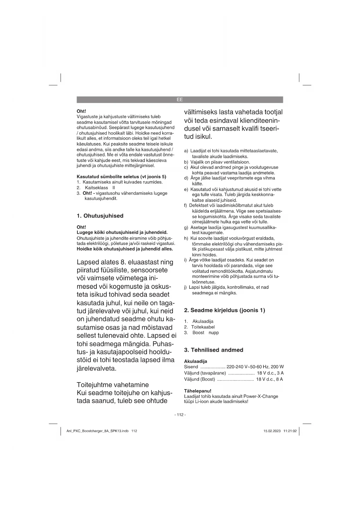 Transpordikahjustuste vältimiseks on seade pakendis. See pakend on toormaterjal ja seega taaskasutatav ning selle saab toorainetöötlusse tagasi toimetada. Seade ja selle tarvikud koosne- vad mitmesugustest materjalidest nagu nt metall ja plast. Viige katkised detailid spetsiaalsesse kogumiskohta. Küsige lisateavet erialakauplusest või kohalikust omavalitsusest! Anl_PXC_Boostcharger_8A_SPK13.indb 113Anl_PXC_Boostcharger_8A_SPK13.indb 113 15.02.2023 11:21:0315.02.2023 11:21:03EE