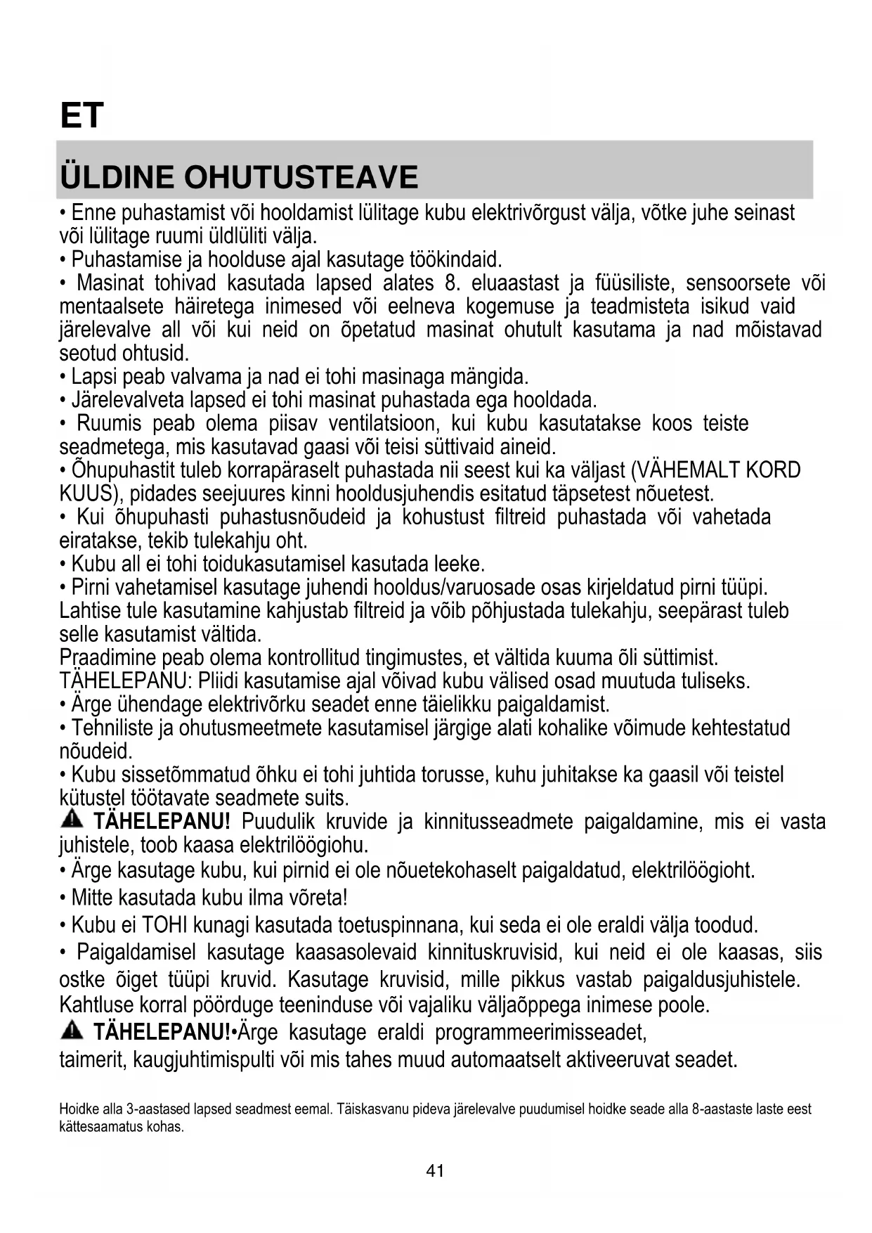 - Paigaldamisel kasutage kaasasolevaid kinnituskruvisid, kui neid ei ole kaasas, siis ostke õiget tüüpi kruvid. Kasutage kruvisid, mille pikkus vastab paigaldusjuhistele. Kahtluse korral pöörduge teeninduse või vajaliku väljaõppega inimese poole. TÄHELEPANU!•Ärge kasutage eraldi programmeerimisseadet, taimerit, kaugjuhtimispulti või mis tahes muud automaatselt aktiveeruvat seadet. Hoidke alla 3-aastased lapsed seadmest eemal. Täiskasvanu pideva järelevalve puudumisel hoidke seade alla 8-aastaste laste eest kättesaamatus kohas.42 TÄHELEPANU! Seade ei ole projekteeritud nii, et seda saaks sisse lülitada välise seadme või eraldiseisva kaugjuhtimissüsteemiga. Seadme kasutamine ei eelda eriväljaõpet. Ärge kasutage seadet õues. Vigastuste vältimiseks peaks seadet teisaldama ja paigaldama vähemalt kahekesi. Seadme peaks paigaldama, sh looma vajaduse korral vee- (kui see on ettenähtud) ja elektriühenduse ning tegema parandustöid sobiva väljaõppega tehnik. Kui seade on paigaldatud, hoidke pakkematerjali (plastkotid, vahtplast jne) lastele kättesaamatus kohas, sest need võivad kaasa tuua lämbumisohu. . Ärge kasutage seadet märgade kätega ega paljajalu. Keelatud on kasutada seadet auruga puhastamiseks – elektrilöögioht. Pakkematerjal on 100% taaskasutatav ja märgistatud taaskasutamise sümboliga Õhupuhasti kujundus võib olla teistsugune kui selles brošüüris toodud joonistel, kuid kasutus-, hooldus- ja paigaldusjuhendid on samad. Järgige täpselt käesolevas juhendis antud juhiseid. Seadme valmistaja keeldub igasugusest vastutusest seadmega seotud võimalike ebameeldivuste, rikete või tulekahjude eest, mis tulenevad selles juhendis antud juhiste eiramisest. Õhupuhasti on ette nähtud küpsetuslõhnade ja -aurude eemaldamiseks üksnes koduses majapidamises.