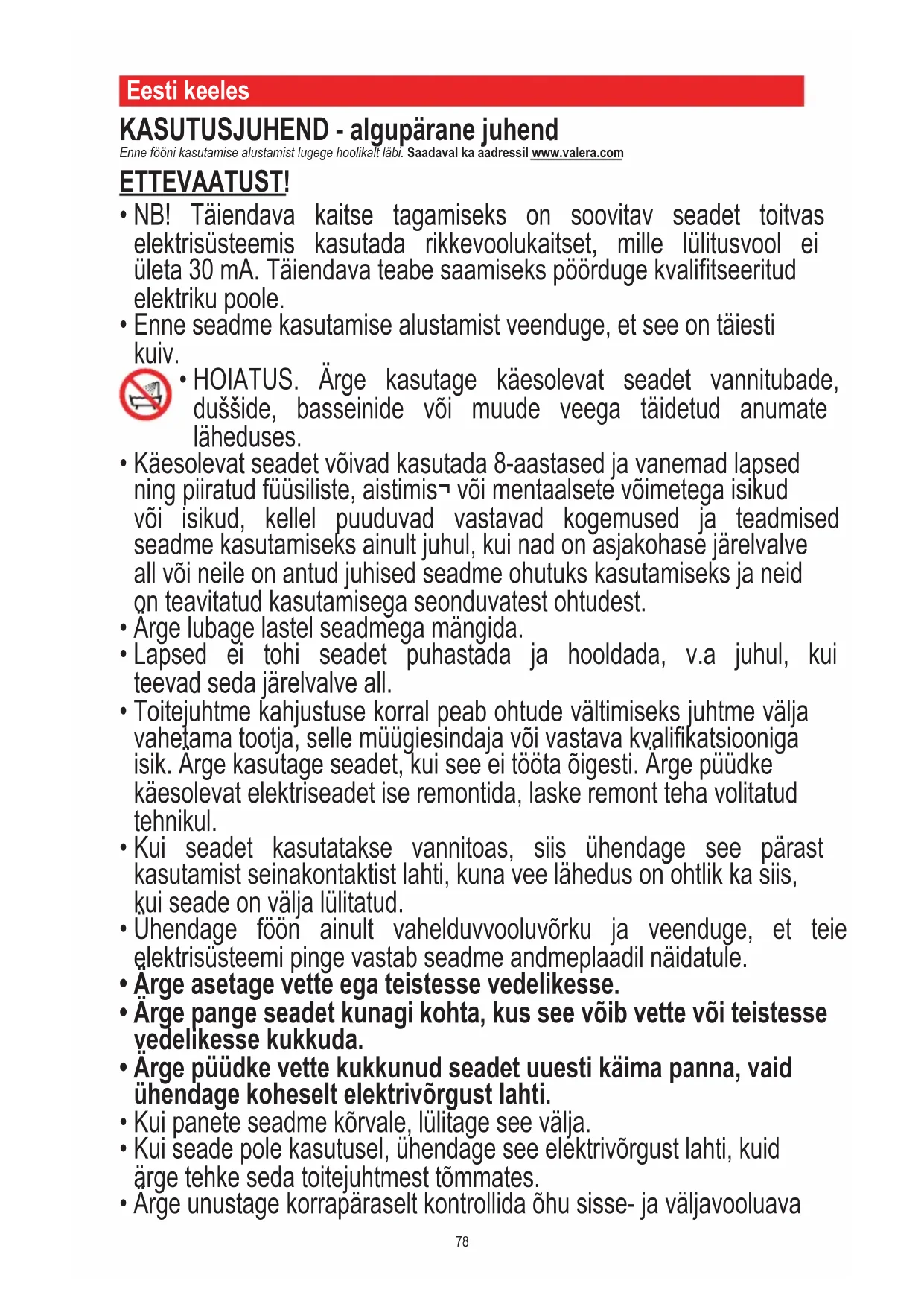 - HOIATUS. Ärge kasutage käesolevat seadet vannitubade, duššide, basseinide või muude veega täidetud anumate läheduses.