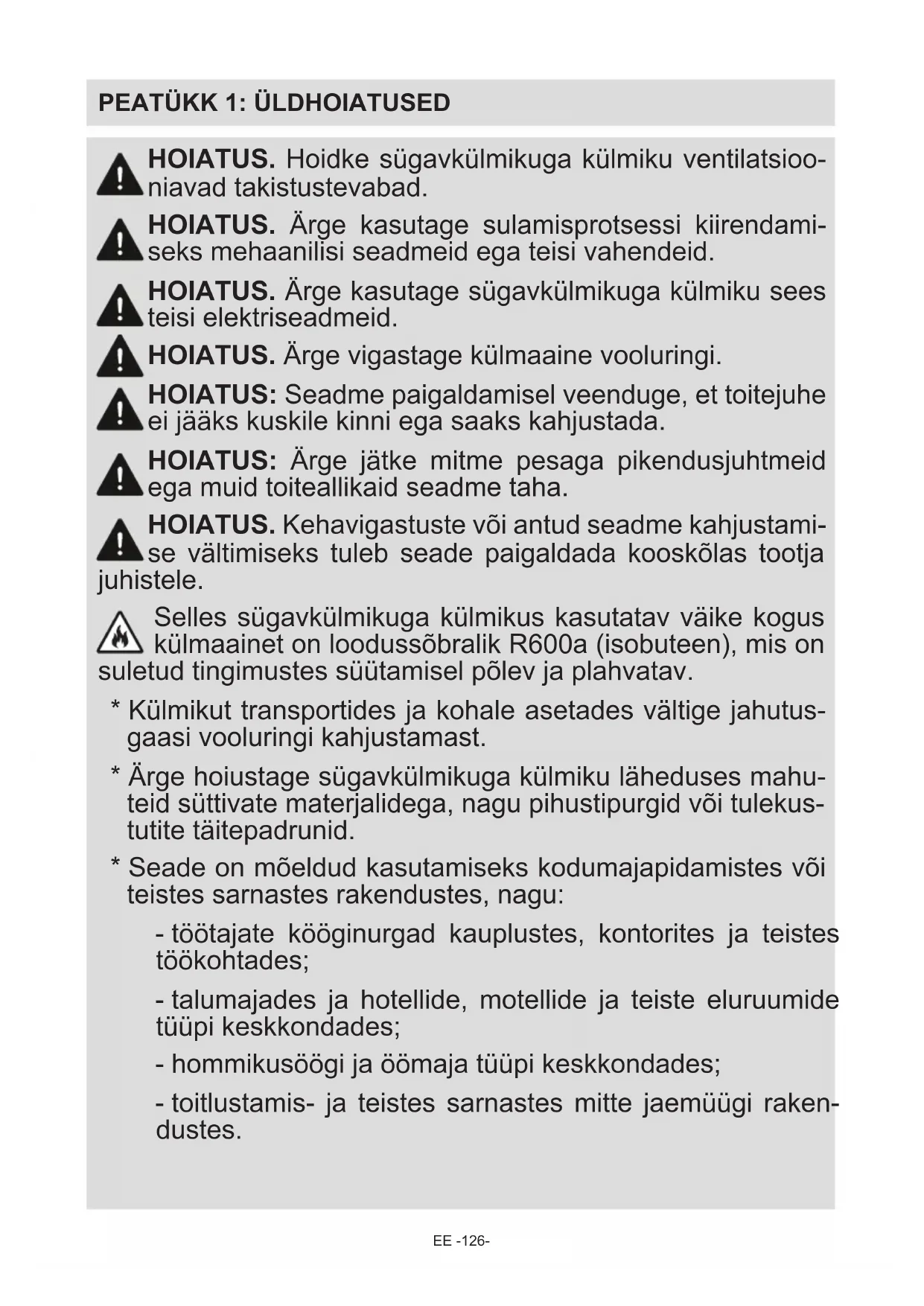 Teie sügavkülmikuga külmik vastab kehtivatele ohutusnõuetele. Vale kasutamine võib tuua kaasa kehavigastusi ja varalist kahju. Kahjustuste vältimiseks lugege käesolev juhend enne oma sügavkülmikuga külmiku esmakordset kasutamist hoolikalt läbi. Juhend sisaldab sügavkülmikuga külmiku paigaldamise, ohutuse, kasutamise ja hooldamise kohta olulist ohutusteavet. Hoidke juhend hilisemaks uuesti läbivaatamiseks alles. TULEKAHJU Hoiatus; Tuleohtlik / tuleohtlikud materjalidEE -126-