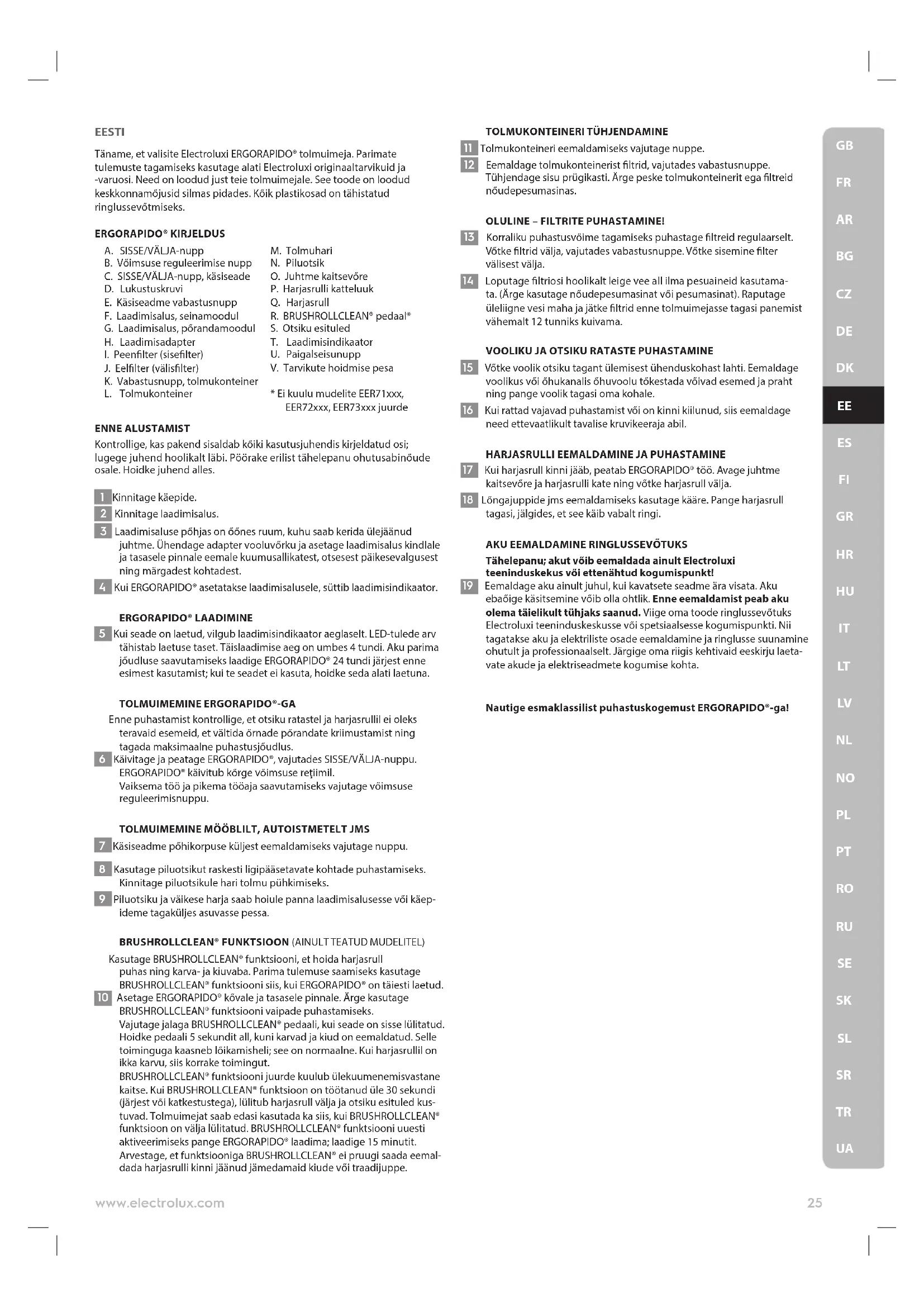 Tähelepanu; akut vőib eemaldada ainult Electroluxi teeninduskekus vői ettenähtud kogumispunkt! 19 Eemaldage aku ainult juhul, kui kavatsete seadme ära visata. Aku ebaőige käsitsemine vőib olla ohtlik. Enne eemaldamist peab aku olema täielikult tühjaks saanud. Viige oma toode ringlussevőtuks Electroluxi teeninduskeskusse vői spetsiaalsesse kogumispunkti. Nii tagatakse aku ja elektriliste osade eemaldamine ja ringlusse suunamine ohutult ja professionaalselt. Järgige oma riigis kehtivaid eeskirju laeta- vate akude ja elektriseadmete kogumise kohta. Nautige esmaklassilist puhastuskogemust ERGORAPIDO®-ga! 25www.electrolux.com