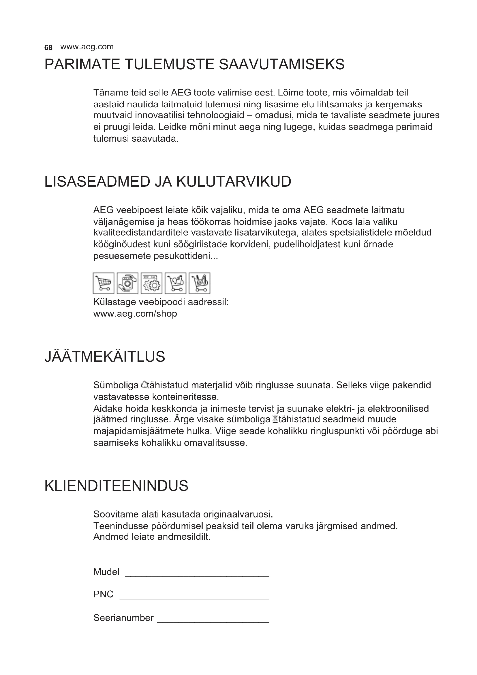 AEG veebipoest leiate kõik vajaliku, mida te oma AEG seadmete laitmatu väljanägemise ja heas töökorras hoidmise jaoks vajate. Koos laia valiku kvaliteedistandarditele vastavate lisatarvikutega, alates spetsialistidele mõeldud kööginõudest kuni söögiriistade korvideni, pudelihoidjatest kuni õrnade pesuesemete pesukottideni... Külastage veebipoodi aadressil: www.aeg.com/shop