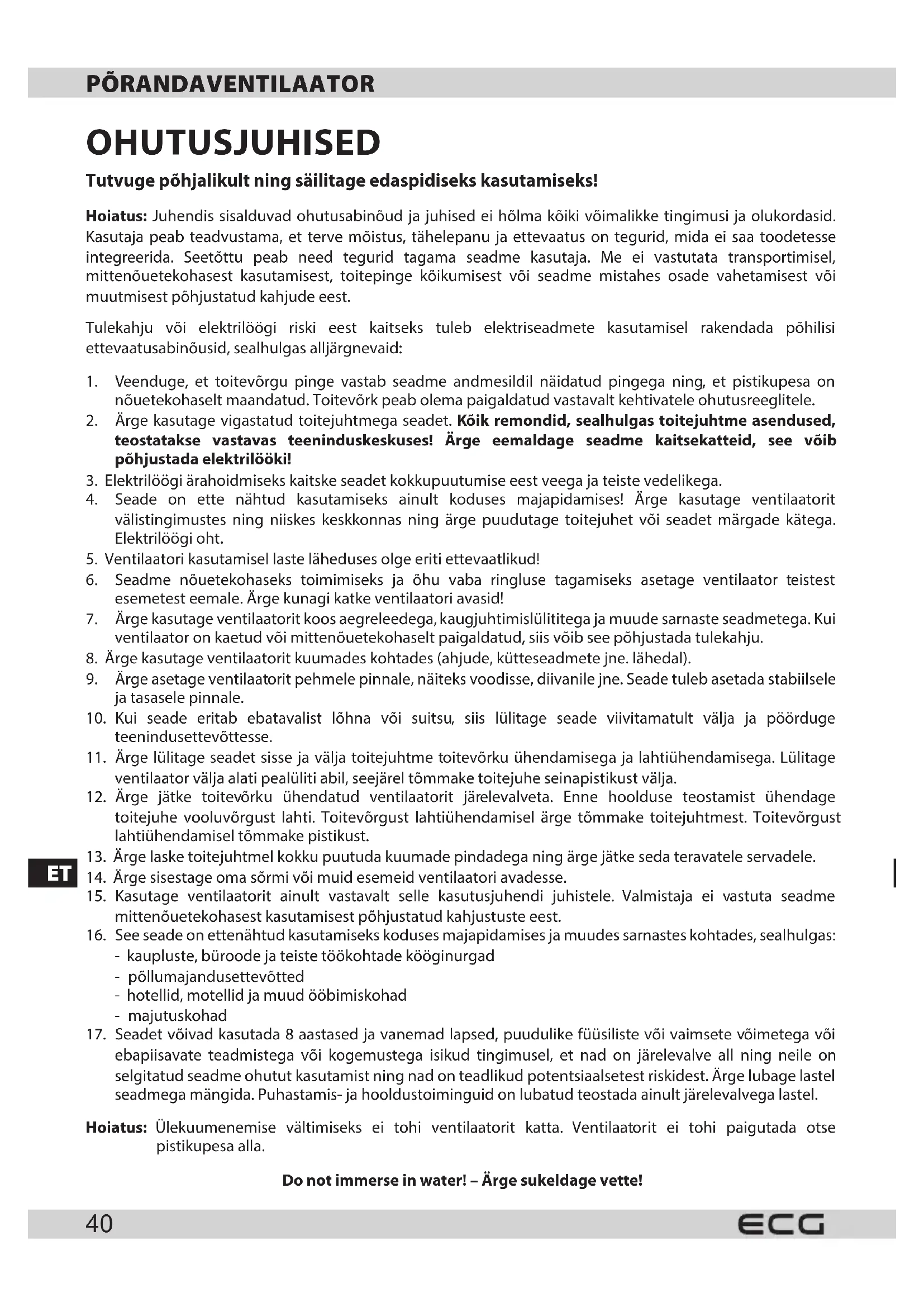ebapiisavate teadmistega või kogemustega isikud tingimusel, et nad on järelevalve all ning neile on selgitatud seadme ohutut kasutamist ning nad on teadlikud potentsiaalsetest riskidest. Ärge lubage lastel seadmega mängida. Puhastamis- ja hooldustoiminguid on lubatud teostada ainult järelevalvega lastel. Hoiatus: Ülekuumenemise vältimiseks ei tohi ventilaatorit katta. Ventilaatorit ei tohi paigutada otse pistikupesa alla. Do not immerse in water! – Ärge sukeldage vette!ET