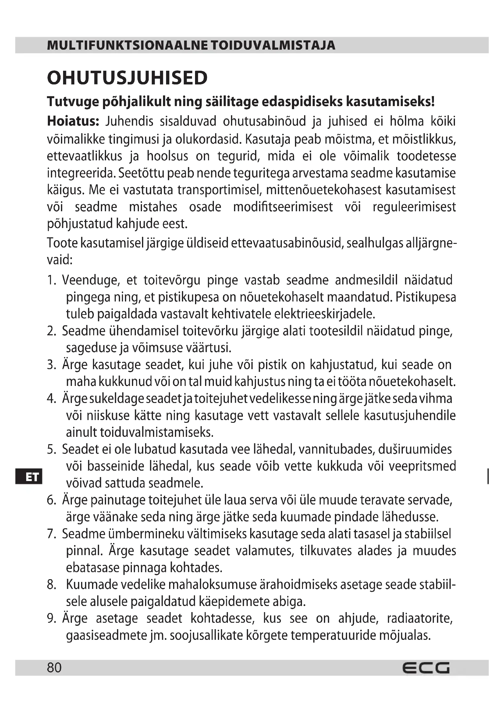 Pakkepaber ja lainepapp – viige jäätmejaama. Pakkekiled, PE kotid, plastist osad – visake plasti ringlussevõtu konteineritesse. TOOTE KASUTUSEST KÕRVALDAMINE TÖÖEA LÕPUS Elektri- ja elektroonikaseadmete kasutusest kõrvaldamine (kehtib EL-i liikmesriikides ja teistes Euroopa riikides, kus rakendatakse ringlussevõtusüsteemi)Näidatud sümbol tootel või pakett tähendab, et toodet ei tohiks käidelda nagu olmejäätmeid. Viige toode elektri-ja elektroonikaseadmetele ettenähtud ringlussevõtupunkti. Vältige võimalikke negatiivseid mõjusid inimese tervisele ja keskkonnale, tagades oma toote korraliku ringlussevõtu. Ringlussevõtt aitab säilitada loodusvarasid. Lisateavet selle toote ringlussevõtu kohta saate oma kohalikust omavalitsusest, olmejäätmete käitlemise ettevõttest või poest, kust te toote ostsite. See toode vastab Euroopa Liidu elektromagnetilise ühilduvuse ja elektriohutuse direktiivi nõuetele. Teksti ja tehniliste parameetrite muutmise õigused on reserveeritud. 08/05 Výrobce neručí za tiskové chyby obsažené v návodu k použití výrobku. Dovozca neručí za tlačové chyby obsiahnuté v návode na použitie výrobku. Producent nie ponosi odpowiedzialności za błędy drukarskie w instrukcji obsługi produktu. A gyártó nem felel a termék használati útmutatójában fellelhető nyomdahibákért. Der Importeur haftet nicht für Druckfehler in der Bedienungsanleitung des Produkts. The manufacturer takes no responsibility for printing errors contained in the product’s user’s manual. Proizvođač ne snosi odgovornost za tiskarske greške uuputama. Proizvajalec ne jamči za morebitne tiskovne napake v navodilih za uporabo izdelka. Le fabricant ne peut être tenu responsable des erreurs d'impression contenues dans le mode d'emploi du produit. Il produttore non sarà ritenuto responsabile per eventuali errori di stampa contenuti nel manuale d’uso del prodotto. El fabricante no asume ninguna responsabilidad por errores de impresión en el manual del usuario del producto. Ražotājs neuzņemas atbildību par drukas kļūdām ierīces rokasgrāmatā. Tootja ei vastuta toote kasutusjuhendis leiduvate trükivigade eest. © GVS.cz 2017 www.ecg-e lectro.eu