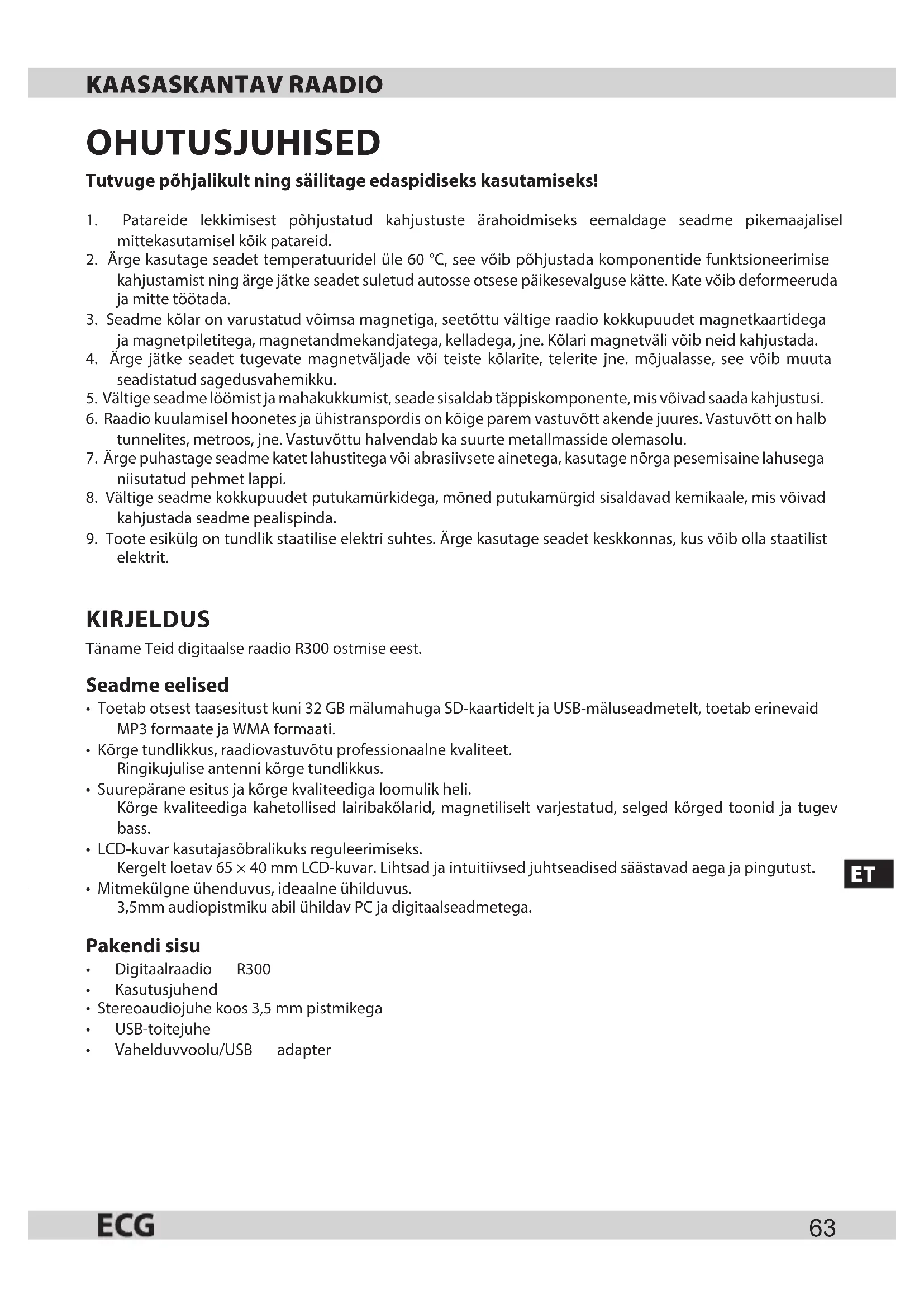 OHUTUSJUHISED Tutvuge põhjalikult ning säilitage edaspidiseks kasutamiseks! 1. Patareide lekkimisest põhjustatud kahjustuste ärahoidmiseks eemaldage seadme pikemaajalisel mittekasutamisel kõik patareid.2. Ärge kasutage seadet temperatuuridel üle 60 °C, see võib põhjustada komponentide funktsioneerimise kahjustamist ning ärge jätke seadet suletud autosse otsese päikesevalguse kätte. Kate võib deformeeruda ja mitte töötada.3. Seadme kõlar on varustatud võimsa magnetiga, seetõttu vältige raadio kokkupuudet magnetkaartidega ja magnetpiletitega, magnetandmekandjatega, kelladega, jne. Kõlari magnetväli võib neid kahjustada.4. Ärge jätke seadet tugevate magnetväljade või teiste kõlarite, telerite jne. mõjualasse, see võib muuta seadistatud sagedusvahemikku.5. Vältige seadme löömist ja mahakukkumist, seade sisaldab täppiskomponente, mis võivad saada kahjustusi.6. Raadio kuulamisel hoonetes ja ühistranspordis on kõige parem vastuvõtt akende juures. Vastuvõtt on halb tunnelites, metroos, jne. Vastuvõttu halvendab ka suurte metallmasside olemasolu.7. Ärge puhastage seadme katet lahustitega või abrasiivsete ainetega, kasutage nõrga pesemisaine lahusega niisutatud pehmet lappi.8. Vältige seadme kokkupuudet putukamürkidega, mõned putukamürgid sisaldavad kemikaale, mis võivad kahjustada seadme pealispinda.9. Toote esikülg on tundlik staatilise elektri suhtes. Ärge kasutage seadet keskkonnas, kus võib olla staatilist elektrit. KIRJELDUS Täname Teid digitaalse raadio R300 ostmise eest. Seadme eelised