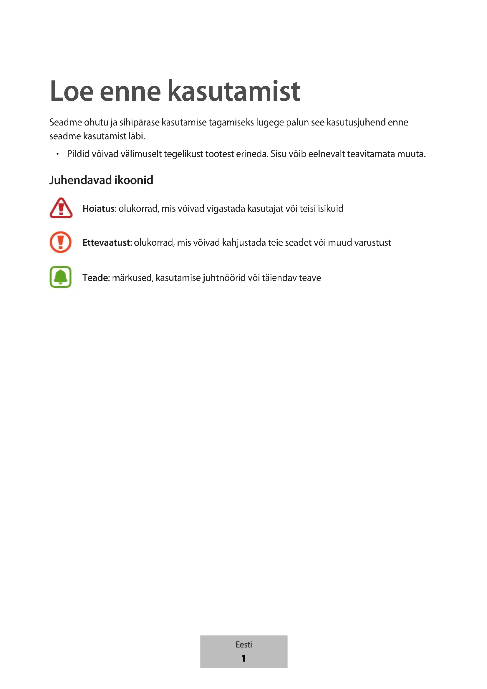 Pildid võivad välimuselt tegelikust tootest erineda. Sisu võib eelnevalt teavitamata muuta. Juhendavad ikoonid Hoiatus: olukorrad, mis võivad vigastada kasutajat või teisi isikuid Ettevaatust: olukorrad, mis võivad kahjustada teie seadet või muud varustust Teade: märkused, kasutamise juhtnöörid või täiendav teave Eesti