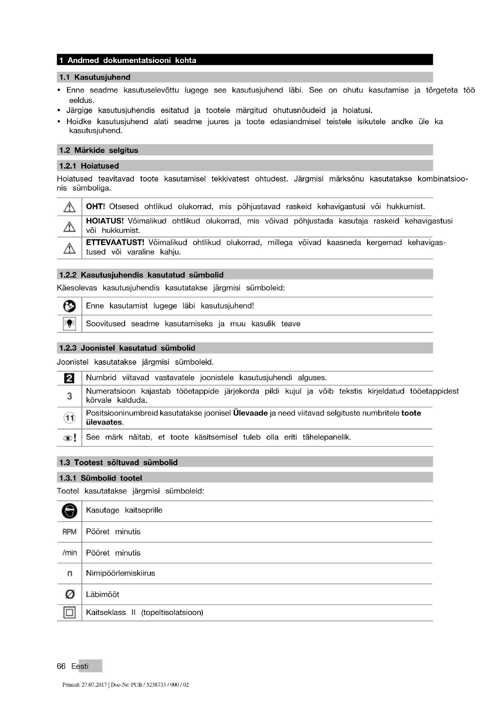 Tootel kasutatakse järgmisi sümboleid: Kasutage kaitseprille Pööret minutis Pööret minutis Nimipöörlemiskiirus Läbimõõt Kaitseklass II (topeltisolatsioon) Printed: 27.07.2017 | Doc-Nr: PUB / 5238733 / 000 / 02Eesti 67