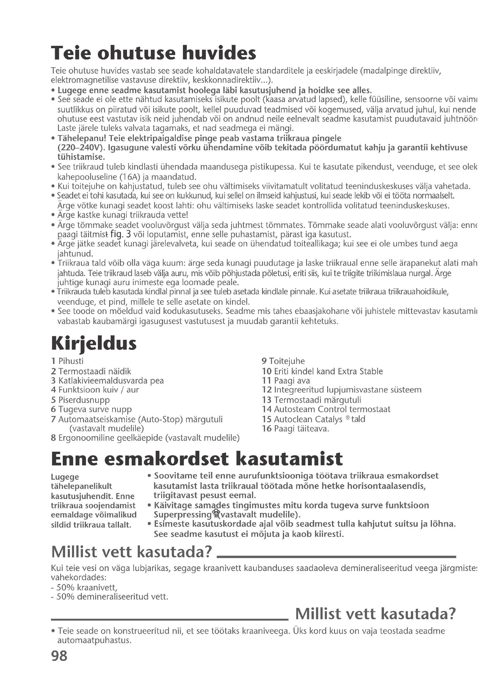 - Triikrauda tuleb kasutada kindlal pinnal ja see tuleb asetada kindlale pinnale. Kui asetate triikraua triikrauahoidikule, veenduge, et pind, millele te selle asetate on kindel.• See toode on mõeldud vaid kodukasutuseks. Seadme mis tahes ebaasjakohane või juhistele mittevastav kasutaminevabastab kaubamärgi igasugusest vastutusest ja muudab garantii kehtetuks. Kirjeldus UltimateAutoclean-1800113015-110x154:Mise en page 1 23/07/08 9:18 Page 9899