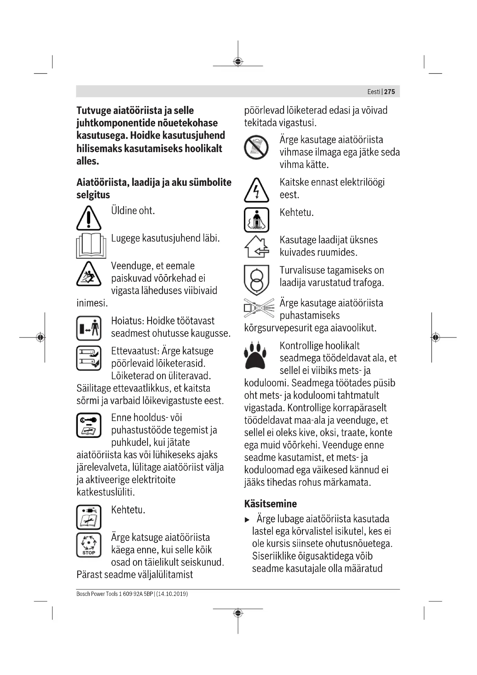 Kako bi se produljilo vrijeme rada, moguće je nabaviti dodatan akumulator od ovlaštene servisne službe za vrtne uređaje tvrtke Bosch. Otklanjanje pogrešaka Simptom Mogući uzrok Rješenje Motor se ne pokreće Unutarnje ožičenje vrtnog uređaja je neispravno Obratite se servisnoj službi tvrtke Bosch Akumulator je ispražnjen Napunite akumulator Akumulator je suviše hladan/topao Pustite akumulator da se zagrije/ohladi Trava je preduga Maksimalno dopuštena visina trave je 30 cm s najvišom postavkom visine rezanja Motorna zaštita se aktivirala Pustite motor da se ohladi i namjestite veću visinu rezanja Prekidač strujnog kruga nije ispravno/potpuno umetnut Ispravno umetnite Vrtni uređaj radi s prekidima Unutarnje ožičenje vrtnog uređaja je neispravno Obratite se servisnoj službi tvrtke Bosch Motorna zaštita se aktivirala Pustite motor da se ohladi i namjestite veću visinu rezanja Vrtni uređaj ostavlja nepravilan uzorak rezanja i/ili motor radi teško Visina rezanja je premala Namjestite veću visinu rezanja Nož je tup Zamijenite nož (vidi sliku J) Moguća su blokiranja Isključite vrtni uređaj i otpustite prekidač strujnog kruga Provjerite donju stranu vrtnog uređaja i po potrebi je oslobodite (uvijek nosite vrtne rukavice) Nož je pogrešno montiran Ispravno montirajte nož Nakon uključivanja vrtnog uređaja nož se ne vrti Trava ometa nož Isključite vrtni uređaj i otpustite prekidač strujnog kruga Uklonite začepljenje (uvijek nosite vrtne rukavice) Matica/vijak noža su otpušteni Pritegnite maticu/vijak noža (27Nm) Jake vibracije/buka Matica/vijak noža su otpušteni Pritegnite maticu/vijak noža (27Nm) Nož je oštećen Zamijenite nož (vidi sliku J) Akumulator i punjač Bosch Power Tools 1 609 92A 5BP | (14.10.2019)274 | Eesti Simptomi Mogući uzrok Rješenje Na punjaču treperi crveni pokazivač punjenja akumulatora Postupak punjenja nije moguć Akumulator nije (ispravno) umetnut Ispravno stavite akumulator na punjač Kontakti akumulatora su onečišćeni Očistite kontakte akumulatora, npr. višekratnim umetanjem i vađenjem akumulatora, po potrebi zamijenite akumulator Akumulator je neispravan Zamijenite akumulator Na punjaču ne svijetle pokazivači punjenja akumulatora Mrežni utikač punjača nije (ispravno) utaknut Utaknite mrežni utikač (potpuno) u utičnicu Utičnica, mrežni kabel ili punjač su neispravni Provjerite mrežni napon, po potrebi zatražite od ovlaštenog servisnog centra za električne alate tvrtke Bosch da obavi provjeru Održavanje i servisiranje Njegovanje akumulatora u Pozor! Prije obavljanja radova održavanja ili čišćenja isključite vrtni uređaj, otpustite prekidač strujnog kruga i izvadite akumulator te sabirnu košaru za travu. u Kada rukujete ili radite na području oštrih noževa uvijek nosite vrtne rukavice. Kako bi se zajamčilo optimalno iskorištavanje akumulatora, pridržavajte se sljedećih napomena i mjera: – Zaštitite akumulator od vlage i vode. – Skladištite vrtni uređaj i akumulator samo u rasponu temperature od –20 °C do 50 °C. Ne ostavljajte akumulator npr. ljeti u automobilu. – Skladištite akumulator odvojeno i ne u vrtnom uređaju. – U slučaju izravnog sunčanog zračenja ne ostavljajte akumulator u vrtnom uređaju. – Optimalna temperatura za čuvanje akumulatora je 5 °C. – Povremeno čistite ventilacijske proreze akumulatora mekim, čistim i suhim kistom. Znatno skraćeno vrijeme rada nakon punjenja ukazuje na to da je akumulator istrošen i da ga je potrebno zamijeniti. Servisna služba i savjeti o uporabi www.bosch-garden.com Prilikom naručivanja rezervnih dijelova i kod svih upita molimo svakako navedite 10-znamenkasti broj artikla prema označnoj pločici proizvoda. Hrvatski Robert Bosch d.o.o PT/SHR-BSC Kneza Branimira 22 10040 Zagreb Tel.: +385 12 958 051 Fax: +385 12 958 050 E-Mail: RBKN-bsc@hr.bosch.com www.bosch.hr Bosnia Elektro-Servis Vl. Mehmed Nalić Dzemala Bijedića bb 71000 Sarajevo Tel./Fax: +387 33454089 E-Mail: bosch@bih.net.ba Transport Li-ionske aku-baterije ugrađene u električnom alatu podliježu zakonu o transportu opasnih tvari. Aku-baterije korisnik može bez ikakvih preduvjeta transportirati cestovnim transportom. Kod transporta na neki drugi način (npr.: zrakoplovom ili špedicijom) treba se pridržavati posebnih zahtjeva na ambalažu i označavanje. Kod pripreme pošiljke za transport treba zatražiti savjet stručnjaka za transport opasnih tvari. Aku-baterije transportirajte ako njihovo kućište nije oštećeno. Oblijepite otvorene kontakte i zapakirajte aku- bateriju tako da se ne može pomicati u ambalaži. Molimo pridržavajte se i eventualnih dodatnih nacionalnih propisa. Zbrinjavanje Vrtne uređaje, akumulatore, pribor i pakiranja potrebno je odnijeti na ekološko recikliranje. Ne bacajte vrtne uređaje i akumulatore/baterije u kućni otpad! Samo za zemljeEU: U skladu s Europskom direktivom 2012/19/EU električne i elektroničke uređaje, a u skladu s Europskom direktivom 2006/66/EZ neispravne ili iskorištene akumulatore/baterije potrebno je odvojeno prikupiti i odnijeti na ekološko recikliranje. Aku-baterije/baterije: Li-Ion: Molimo pridržavajte se napomena u odjeljku Transport. Eesti Ohutusnõuded Tähelepanu! Lugege järgmised juhised tähelepanelikult läbi. 1 609 92A 5BP | (14.10.2019) Bosch Power ToolsEesti | 275 Tutvuge aiatööriista ja selle juhtkomponentide nõuetekohase kasutusega. Hoidke kasutusjuhend hilisemaks kasutamiseks hoolikalt alles. Aiatööriista, laadija ja aku sümbolite selgitus Üldine oht. Lugege kasutusjuhend läbi. Veenduge, et eemale paiskuvad võõrkehad ei vigasta läheduses viibivaid inimesi. Hoiatus: Hoidke töötavast seadmest ohutusse kaugusse. Ettevaatust: Ärge katsuge pöörlevaid lõiketerasid. Lõiketerad on üliteravad. Säilitage ettevaatlikkus, et kaitsta sõrmi ja varbaid lõikevigastuste eest. Enne hooldus- või puhastustööde tegemist ja puhkudel, kui jätate aiatööriista kas või lüh
