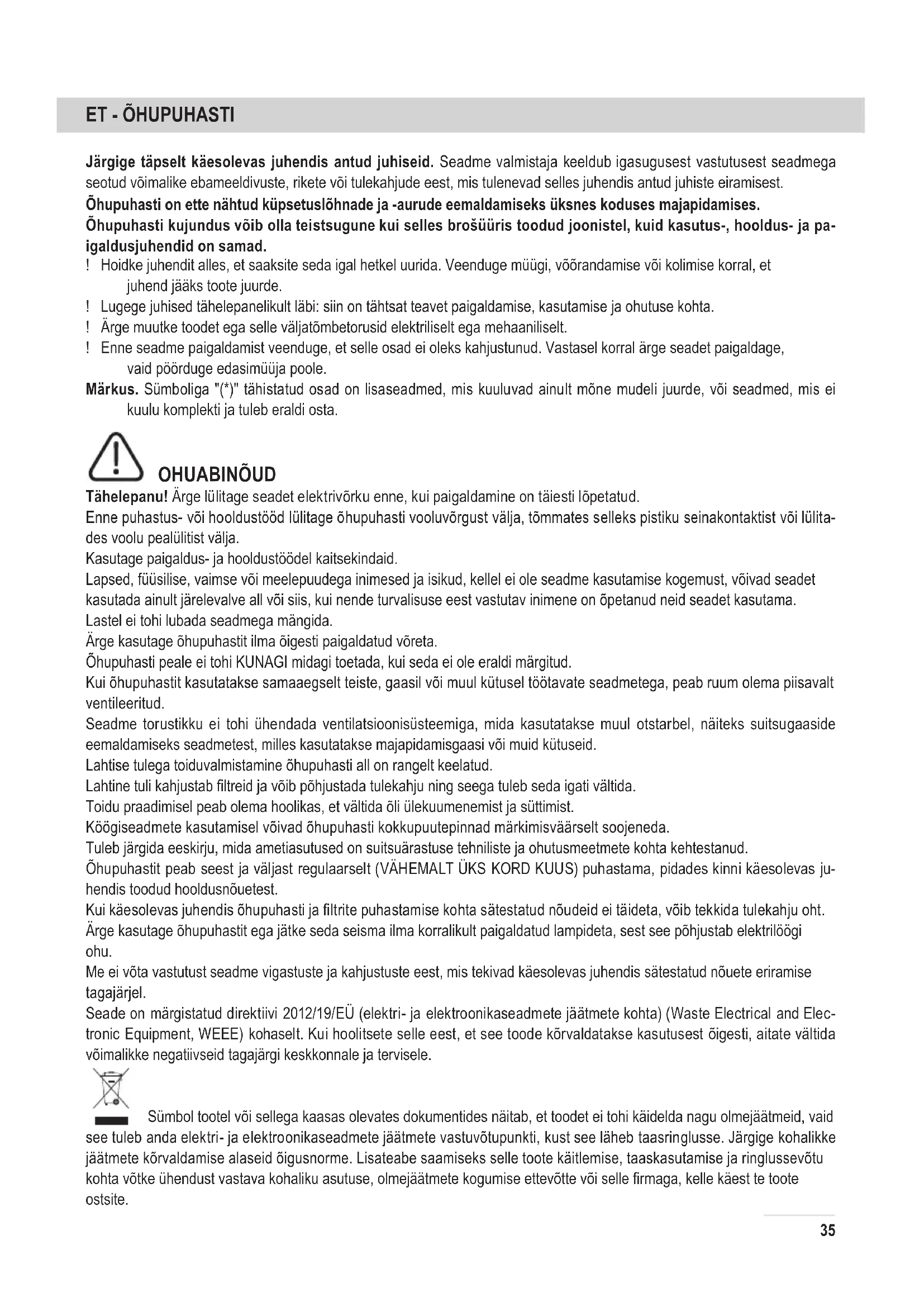 Järgige täpselt käesolevas juhendis antud juhiseid. Seadme valmistaja keeldub igasugusest vastutusest seadmega seotud võimalike ebameeldivuste, rikete või tulekahjude eest, mis tulenevad selles juhendis antud juhiste eiramisest. Õhupuhasti on ette nähtud küpsetuslõhnade ja -aurude eemaldamiseks üksnes koduses majapidamises. Õhupuhasti kujundus võib olla teistsugune kui selles brošüüris toodud joonistel, kuid kasutus-, hooldus- ja pa- igaldusjuhendid on samad. ! Hoidke juhendit alles, et saaksite seda igal hetkel uurida. Veenduge müügi, võõrandamise või kolimise korral, et juhend jääks toote juurde. ! Lugege juhised tähelepanelikult läbi: siin on tähtsat teavet paigaldamise, kasutamise ja ohutuse kohta. ! Ärge muutke toodet ega selle väljatõmbetorusid elektriliselt ega mehaaniliselt. ! Enne seadme paigaldamist veenduge, et selle osad ei oleks kahjustunud. Vastasel korral ärge seadet paigaldage, vaid pöörduge edasimüüja poole. Märkus. Sümboliga "(*)" tähistatud osad on lisaseadmed, mis kuuluvad ainult mõne mudeli juurde, või seadmed, mis ei kuulu komplekti ja tuleb eraldi osta. OHUABINÕUD Tähelepanu! Ärge lülitage seadet elektrivõrku enne, kui paigaldamine on täiesti lõpetatud. Enne puhastus- või hooldustööd lülitage õhupuhasti vooluvõrgust välja, tõmmates selleks pistiku seinakontaktist või lülita- des voolu pealülitist välja. Kasutage paigaldus- ja hooldustöödel kaitsekindaid. Lapsed, füüsilise, vaimse või meelepuudega inimesed ja isikud, kellel ei ole seadme kasutamise kogemust, võivad seadet kasutada ainult järelevalve all või siis, kui nende turvalisuse eest vastutav inimene on õpetanud neid seadet kasutama. Lastel ei tohi lubada seadmega mängida. Ärge kasutage õhupuhastit ilma õigesti paigaldatud võreta. Õhupuhasti peale ei tohi KUNAGI midagi toetada, kui seda ei ole eraldi märgitud. Kui õhupuhastit kasutatakse samaaegselt teiste, gaasil või muul kütusel töötavate seadmetega, peab ruum olema piisavalt ventileeritud. Seadme torustikku ei tohi ühendada ventilatsioonisüsteemiga, mida kasutatakse muul otstarbel, näiteks suitsugaaside eemaldamiseks seadmetest, milles kasutatakse majapidamisgaasi või muid kütuseid. Lahtise tulega toiduvalmistamine õhupuhasti all on rangelt keelatud. Lahtine tuli kahjustab ltreid ja võib põhjustada tulekahju ning seega tuleb seda igati vältida. Toidu praadimisel peab olema hoolikas, et vältida õli ülekuumenemist ja süttimist. Köögiseadmete kasutamisel võivad õhupuhasti kokkupuutepinnad märkimisväärselt soojeneda. Tuleb järgida eeskirju, mida ametiasutused on suitsuärastuse tehniliste ja ohutusmeetmete kohta kehtestanud. Õhupuhastit peab seest ja väljast regulaarselt (VÄHEMALT ÜKS KORD KUUS) puhastama, pidades kinni käesolevas ju- hendis toodud hooldusnõuetest. Kui käesolevas juhendis õhupuhasti ja ltrite puhastamise kohta sätestatud nõudeid ei täideta, võib tekkida tulekahju oht. Ärge kasutage õhupuhastit ega jätke seda seisma ilma korralikult paigaldatud lampideta, sest see põhjustab elektrilöögi ohu. Me ei võta vastutust seadme vigastuste ja kahjustuste eest, mis tekivad käesolevas juhendis sätestatud nõuete eriramise tagajärjel. Seade on märgistatud direktiivi 2012/19/EÜ (elektri- ja elektroonikaseadmete jäätmete kohta) (Waste Electrical and Elec- tronic Equipment, WEEE) kohaselt. Kui hoolitsete selle eest, et see toode kõrvaldatakse kasutusest õigesti, aitate vältida võimalikke negatiivseid tagajärgi keskkonnale ja tervisele. Sümbol tootel või sellega kaasas olevates dokumentides näitab, et toodet ei tohi käidelda nagu olmejäätmeid, vaid see tuleb anda elektri- ja elektroonikaseadmete jäätmete vastuvõtupunkti, kust see läheb taasringlusse. Järgige kohalikke jäätmete kõrvaldamise alaseid õigusnorme. Lisateabe saamiseks selle toote käitlemise, taaskasutamise ja ringlussevõtu kohta võtke ühendust vastava kohaliku asutuse, olmejäätmete kogumise ettevõtte või selle rmaga, kelle käest te toote ostsite.36 Seade on välja töötatud, testitud ja toodetud vastavalt: