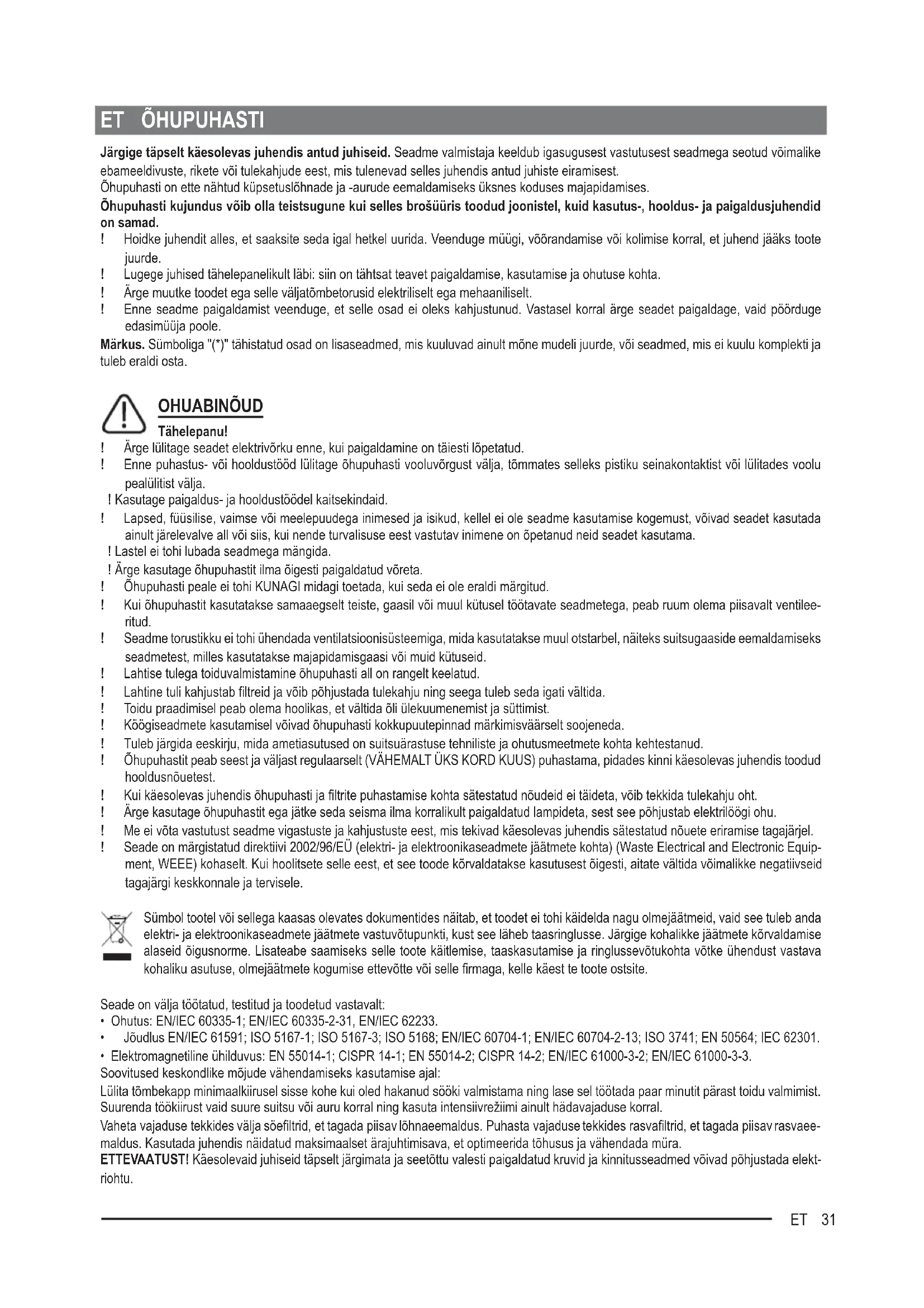 - Elektromagnetiline ühilduvus: EN 55014-1; CISPR 14-1; EN 55014-2; CISPR 14-2; EN/IEC 61000-3-2; EN/IEC 61000-3-3. Soovitused keskondlike mõjude vähendamiseks kasutamise ajal: Lülita tõmbekapp minimaalkiirusel sisse kohe kui oled hakanud sööki valmistama ning lase sel töötada paar minutit pärast toidu valmimist. Suurenda töökiirust vaid suure suitsu või auru korral ning kasuta intensiivrežiimi ainult hädavajaduse korral. Vaheta vajaduse tekkides välja söeltrid, et tagada piisav lõhnaeemaldus. Puhasta vajaduse tekkides rasvaltrid, et tagada piisav rasvaee- maldus. Kasutada juhendis näidatud maksimaalset ärajuhtimisava, et optimeerida tõhusus ja vähendada müra. ETTEVAATUST! Käesolevaid juhiseid täpselt järgimata ja seetõttu valesti paigaldatud kruvid ja kinnitusseadmed võivad põhjustada elekt- riohtu.32 ET KASUTAMINE Õhupuhasti on valmistatud nii, et seda saaks kasutada nii väljatõmberežiimis kui ka õhku ltreeriva toasisese tsirkulatsiooniga režiimis. Väljatõmberežiim Aur viiakse välja ühendusääriku külge kinnitatud väljatõmbetoru abil. Väljatõmbetoru diameeter peab olema sama suur kui ühendusvõru oma. Tähelepanu! Väljatõmbetoru ei kuulu komplekti ja tuleb ise osta. Toru horisontaalne lõik peab olema kergelt ülespoole kaldu (umbes 10°), et õhku kergemini väliskeskkonda viia. Kui õhupuhastil on söeltrid, tuleb need eemaldada. Ühendage õhupuhasti väljatõmbetorude ja seinal asuvate väljalaskeavadega, mille diameeter on võrdne õhupuhasti väljalaskeava (ühen- dusäärikuga) omaga. Peenemate torude ja väiksemate seinal asuvate väljalaskeavade kasutamisel väheneb tõmme ja suureneb oluliselt müra. Seetõttu ei võta meie sellisel juhul endale mingit vastutust. ! Kasutage minimaalse vajaliku pikkusega toru. ! Kasutage võimalikult väheste põlvedega toru (torupõlve maksimaalne nurk: 90°). ! Vältige toru ristlõike olulist muutumist. ! Kasutage võimalikult sileda sisepinnaga toru. ! Toru materjal peab olema standarditega heaks kiidetud. Filtreeriv versioon Välja tõmmatud õhk puhastatakse rasvast ja lõhnatustatakse, enne kui see tagasi siseruumidesse juhitakse. Sellel režiimil kasutamiseks tuleb paigaldada täiendav aktiivsöega ltreerimissüsteem. PAIGALDAMINE Minimaalne vahekaugus pliidi pinna ja köögi õhupuhasti alumise ääre vahel ei tohi elektripliidi puhul olla väiksem kui 55cm ning gaasi- või kombineeritud pliidi puhul väiksem kui 65cm. Kui gaasipliidi paigaldusjuhendis nõutakse suuremat vahekaugust, tuleb seda arvesse võtta. Elektriühendus Võrgupinge peab vastama õhupuhasti sees asuval andmesildil toodud pingele. Kui õhupuhastil on pistik, ühendage see kehtivatele eeskir- jadele vastavasse pistikupessa, mis asub ka pärast õhupuhasti paigaldamist ligipääsetavas kohas. Kui õhupuhastil pistikut ei ole (puhasti on otse võrku ühendatud) või kui pistik ei asu kohas, mis jääks ka pärast õhupuhasti paigaldamist ligipääsetavaks, paigaldage nõueteko- hane kahepooluseline lüliti, mis kindlustaks vastavalt paigalduseeskirjadele III kategooria liigpinge korral täieliku eraldamise vooluvõrgust. Tähelepanu! Enne kui lülitate õhupuhasti uuesti elektrivõrku ja kontrollite, kas see töötab korralikult, kontrollige alati, kas võrgukaabel on korralikult monteeritud. Õhupuhastil on spetsiaalne toitekaabel; kui kaabel on kannatada saanud, pöörduge tehnoabi poole. Paigaldamine Kuna õhupuhasti on väga raske, siis peavad seda liigutama ja paigaldama vähemalt kaks inimest. Enne paigaldamise algust: