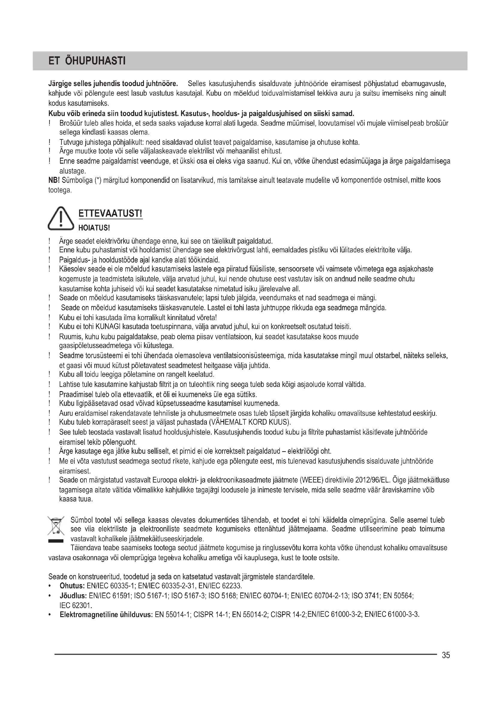Järgige selles juhendis toodud juhtnööre. Selles kasutusjuhendis sisalduvate juhtnööride eiramisest põhjustatud ebamugavuste, kahjude või põlengute eest lasub vastutus kasutajal. Kubu on mõeldud toiduvalmistamisel tekkiva auru ja suitsu imemiseks ning ainult kodus kasutamiseks. Kubu võib erineda siin toodud kujutistest. Kasutus-, hooldus- ja paigaldusjuhised on siiski samad. ! Brošüür tuleb alles hoida, et seda saaks vajaduse korral alati lugeda. Seadme müümisel, loovutamisel või mujale viimisel peab brošüür sellega kindlasti kaasas olema. ! Tutvuge juhistega põhjalikult: need sisaldavad olulist teavet paigaldamise, kasutamise ja ohutuse kohta. ! Ärge muutke toote või selle väljalaskeavade elektrilist või mehaanilist ehitust. ! Enne seadme paigaldamist veenduge, et ükski osa ei oleks viga saanud. Kui on, võtke ühendust edasimüüjaga ja ärge paigaldamisega alustage. NB! Sümboliga (*) märgitud komponendid on lisatarvikud, mis tarnitakse ainult teatavate mudelite võ i komponentide ostmisel, mitte koos tootega. ETTEVAATUST! HOIATUS! ! Ärge seadet elektrivõrku ühendage enne, kui see on täielikult paigaldatud. ! Enne kubu puhastamist või hooldamist ühendage see elektrivõrgust lahti, eemaldades pistiku või lülitades elektritoite välja. ! Paigaldus- ja hooldustööde ajal kandke alati töökindaid. ! Käesolev seade ei ole mõeldud kasutamiseks lastele ega piiratud füüsiliste, sensoorsete või vaimsete võimetega ega asjakohaste kogemuste ja teadmisteta isikutele, välja arvatud juhul, kui nende ohutuse eest vastutav isik on andnud neile seadme ohutu kasutamise kohta juhiseid või kui seadet kasutatakse nimetatud isiku järelevalve all. ! Seade on mõeldud kasutamiseks täiskasvanutele; lapsi tuleb jälgida, veendumaks et nad seadmega ei mängi. ! Seade on mõeldud kasutamiseks täiskasvanutele. Lastel ei tohi lasta juhtnuppe rikkuda ega seadmega mängida. ! Kubu ei tohi kasutada ilma korralikult kinnitatud võreta! ! Kubu ei tohi KUNAGI kasutada toetuspinnana, välja arvatud juhul, kui on konkreetselt osutatud teisiti. ! Ruumis, kuhu kubu paigaldatakse, peab olema piisav ventilatsioon, kui seadet kasutatakse koos muude gaasipõletusseadmetega või kütustega. ! Seadme torusüsteemi ei tohi ühendada olemasoleva ventilatsioonisüsteemiga, mida kasutatakse mingil muul otstarbel, näiteks selleks, et gaasi või muud kütust põletavatest seadmetest heitgaase välja juhtida. ! Kubu all toidu leegiga põletamine on rangelt keelatud. ! Lahtise tule kasutamine kahjustab filtrit ja on tuleohtlik ning seega tuleb seda kõigi asjaolude korral vältida. ! Praadimisel tuleb olla ettevaatlik, et õli ei kuumeneks üle ega süttiks. ! Kubu ligipääsetavad osad võivad küpsetusseadme kasutamisel kuumeneda. ! Auru eraldamisel rakendatavate tehniliste ja ohutusmeetmete osas tuleb täpselt järgida kohaliku omavalitsuse kehtestatud eeskirju. ! Kubu tuleb korrapäraselt seest ja väljast puhastada (VÄHEMALT KORD KUUS). ! See tuleb teostada vastavalt lisatud hooldusjuhistele. Kasutusjuhendis toodud kubu ja filtrite puhastamist käsitlevate juhtnööride eiramisel tekib põlenguoht. ! Ärge kasutage ega jätke kubu selliselt, et pirnid ei ole korrektselt paigaldatud – elektrilöögi oht. ! Me ei võta vastutust seadmega seotud rikete, kahjude ega põlengute eest, mis tulenevad kasutusjuhendis sisalduvate juhtnööride eiramisest. ! Seade on märgistatud vastavalt Euroopa elektri- ja elektroonikaseadmete jäätmete (WEEE) direktiivile 2012/96/EL. Õige jäätmekäitluse tagamisega aitate vältida võimalikke kahjulikke tagajä rgi loodusele ja inimeste tervisele, mida selle seadme väär äraviskamine võib kaasa tuua. Sümbol tootel või sellega kaasas olevates dokumentides tähendab, et toodet ei tohi käidelda olmeprügina. Selle asemel tuleb see viia elektriliste ja elektrooniliste seadmete kogumiseks ettenähtud jäätmejaama. Seadme utiliseerimine peab toimuma vastavalt kohalikele jäätmekäitluseeskirjadele. Täiendava teabe saamiseks tootega seotud jäätmete kogumise ja ringlussevõtu korra kohta võtke ühendust kohaliku omavalitsuse vastava osakonnaga või olemprügiga tegel eva kohaliku ametiga või kauplusega, kust te toote ostsite. Seade on konstrueeritud, toodetud ja seda on katsetatud vastavalt järgmistele standarditele.
