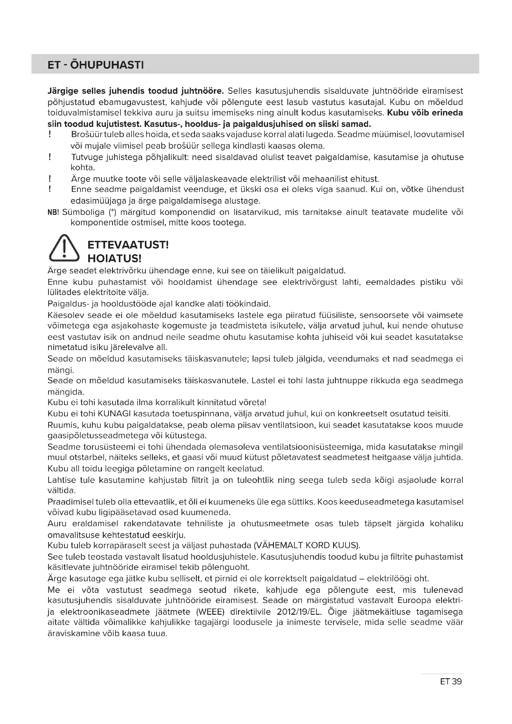 - Kubuga on kaasas jämenevad seinatüüblid, millega saab kubu peaaegu igat tüüpi seinale/lakke kinnitada. Kvalifi tseeritud tehnik peab siiski kontrollima, kas materjalid seina/lae tüübile sobivad. Sein/lagi peab olema piisavalt tugev, et kubu raskust kanda. Seadme seina kinnitamiseks ei tohi kasutada plaate, krohvi ega silikooni. Ainult pindmontaaž. TÖÖTAMINE Kontsentreeritud köögiaurude korral kasutage kõrget imemiskiirust. Kubu imemisfunktsioon on soovitatav enne toitu valmistama asumist 5 minutiks sisse lülitada ja lasta sel töötada toiduvalmistamise ajal ja umbes 15 minutit pärast seda. Kubu funktsioonide valimiseks tuleb juhtnuppe lihtsat kergelt puudutada ja neil sõrme hoida. T1. Ooterežiim (juhtpaneel VÄLJAS, kõik funktsioonid välja lülitatud / SEES (juhtpaneel sisse lülitatud) Märkus: kui kubu (imemisfunktsioon ja tuled) umbes minuti ei ole töötanud, siis lülitub see automaatselt ooterežiimi. T2. Tuled SEES/VÄLJAS Väljalülitamiseks vajutage nuppu uuesti. T3. SEES/VÄLJAS Automaatne funktsioon „AdaptTech“ Kubu määrab automaatselt imemiskiiruse (võimsuse) suuremaks, kui andurid tuvastavad vastavad keskkonnatingimused.ET42 Kui keskkonnatingimused ei muutu, siis kubu lülitub 10 minuti pärast välja (kui kubu imemiskiirus (võimsus) on juba 1). Märkus: selle funktsiooni õigeks kasutamiseks tuleb kõigepealt seadistada automaatse toimimise parameetrid (vt vastavat jaotist). Märkus: automaatse toimimise ajal muude kiirust reguleerivate funktsioonide kasutamisel lülitub automaatne ventilatsioon välja. T4. Imemiskiiruse (võimsuse) käsitsi valimine: L1: imemiskiirus (võimsus) 1 L2: imemiskiirus (võimsus) 2 L3: imemiskiirus (võimsus) 3 Kubu väljalülitamiseks vajutage nuppu (VÄLJAS, OFF) uuesti. Märkus: käsitsi valimine välistab igasugused muud imemisega seotud seadistatud funktsioonid. T5. SEES/VÄLJAS Intensiivne imemiskiirus (võimsus) „VÕIMSUSE SUURENDAMINE“ (POWER BOOST) (ajastatud) Märkus: kui kubu on 5 minutit töötanud, siis naaseb see eelnenud olekusse. T6. SEES/VÄLJAS Töörežiim „Värskendamine“ (Refresh) Kui kubu ei ole 50 minutit töötanud, siis lülitub imemiskiirus (võimsus) 1 10 minutiks sisse. T7. SEES/VÄLJAS Imemiskiiruse (võimsuse) viitlülitus (umbes 30 minuti pärast) Märkus: seda funktsiooni saab kasutada nupuga T4 valitavate kiiruste puhul. T8. Filtri küllastuse näidik ja selle lähtestamine Nupp süttib automaatselt põlema, kui rasvafilter vajab hooldamist. Nupus süttib automaatselt vilkuv tuli, kui söefilter vajab hooldamist. Kui kubu on pärast hooldamist välja lülitatud ja nupp on aktiivne, vajutage nuppu kauem kui 3 sekundit, et filtri küllastuse näidik lähtestada; vajaduse korral korrake (näiteks kui mõlemad filtrid on küllastunud). Söefiltri küllastuse näidiku aktiveerimine Söefiltri küllastuse näidik on tavaolekus välja lülitatud. Aktiveerimiseks toimige järgmiselt: kui paneel on sisse lülitatud (SEES, ON) ja imemisfunktsioon väljas (VÄLJAS, OFF), vajutage samal ajal rohkem kui 3 sekundi jooksul nuppe T7 ja T8; nupus T8 põleb umbes 5 sekundit tuli, mis näitab funktsiooni aktiveerimist. Selle välja lülitamiseks korrake toimingut; nupp T8 vilgub umbes 5 sekundit (näitab väljalülitumist). Nupud T7 ja T8 pole selles etapis nähtavad (mõnel mudelil). Need on nähtavad ainult vastavalt käsiraamatu tööjaotises kirjeldatule. Nupu T7 ligikaudne kaugus T6-st on 16 mm ja nupu T8 kaugus T7-st on 26 mm. Automaatrežiimi parameetrite seadistamine Automaatrežiimi korrektseks toimimiseks tuleb kubu kalibreerida. Kubu kalibreerimine Kui paneel on sisse lülitatud (SEES, ON) ja imemisfunktsioon väljas (VÄLJAS, OFF), vajutage 5 sekundi jooksul nuppu T3. Imemiskiirus (võimsus) 1 lülitub sisse ja nupp T3 hakkab vilkuma, mis näitab kubu kalibreerimist (kestab umbes 5 minutit). Märkus: kalibreerimise katkestamiseks vajutage 5 sekundit nuppu T3; kalibreerimise käsk tühistatakse ja seega tuleb seda korrata. HOOLDUS TÄHELEPANU! Enne hooldust isoleerige kubu elektritoitest, lülitades konnektori välja ja eemaldades selle kaitsme. Kui kubu on ühendatud pistiku ja pesaga, siis eemaldage pistik pesast. Puhastamine Kubu tuleb korrapäraselt seest ja väljast puhastada (vähemalt sama sageli, kui te rasvafiltreid hooldate). Kasutage puhastamiseks neutraalses pesuvedelikus niisutatud lappi. Ärge kasutage abrasiivseid vahendeid. ALKOHOLI EI TOHI KASUTADA! HOIATUS: kui kubu vastavalt soovitustele ei puhastata ja filtreid ei asendata, võib tekkida põlengu oht. Seetõttu soovitame juhtnööre järgida. Tootja ei vastuta mootori kahjustuste ega põlengute eest, kui nende põhjuseks on vale hooldamine või eespool kirjeldatud ohutussoovituste eiramine. T6 T7 T8 16 mm 26 mmET43 Rasvafilter Püüab kinni toidu valmistamisel tekkivad rasvaosakesed. Rasvafiltrit peab puhastama kord kuus nõrgatoimelise pesuvahendiga või käsitsi või nõudepesumasinas madalal temperatuuril ja kasutades lühikest tsüklit. Nõudepesumasinas pesemisel võib rasvafilter värvi muuta, kuid see ei mõjuta selle filtrimisomadusi. Rasvafiltri eemaldamiseks vajutage sellele ja tõmmake seda allapoole. Söefilter (ainult filtriga versioon) Imab toidu valmistamisel tekkivad ebameeldivad lõhnad. Pikemaajalisel kasutamisel söefilter ummistub, sõltuvalt toiduvalmistamise viisidest ja rasvafiltri puhastamise sagedusest. Igal juhul tuleb salv vähemalt kord nelja kuu jooksul välja vahetada. Söefiltrit EI TOHI pesta ega regenereerida. Asenduslambid Pliidikubu on varustatud LED-tehnoloogial põhineva valgustussüsteemiga. LED-lambid tagavad optimaalse valgustuse ja kestavad tavapäraste pirnidega võrreldes kuni 10 korda kauem ning võimaldavad säästa 90% elektrienergiast. Asendamiseks pöörduge tehnilise hoolduskeskuse poole.FR - HOTTE FR44