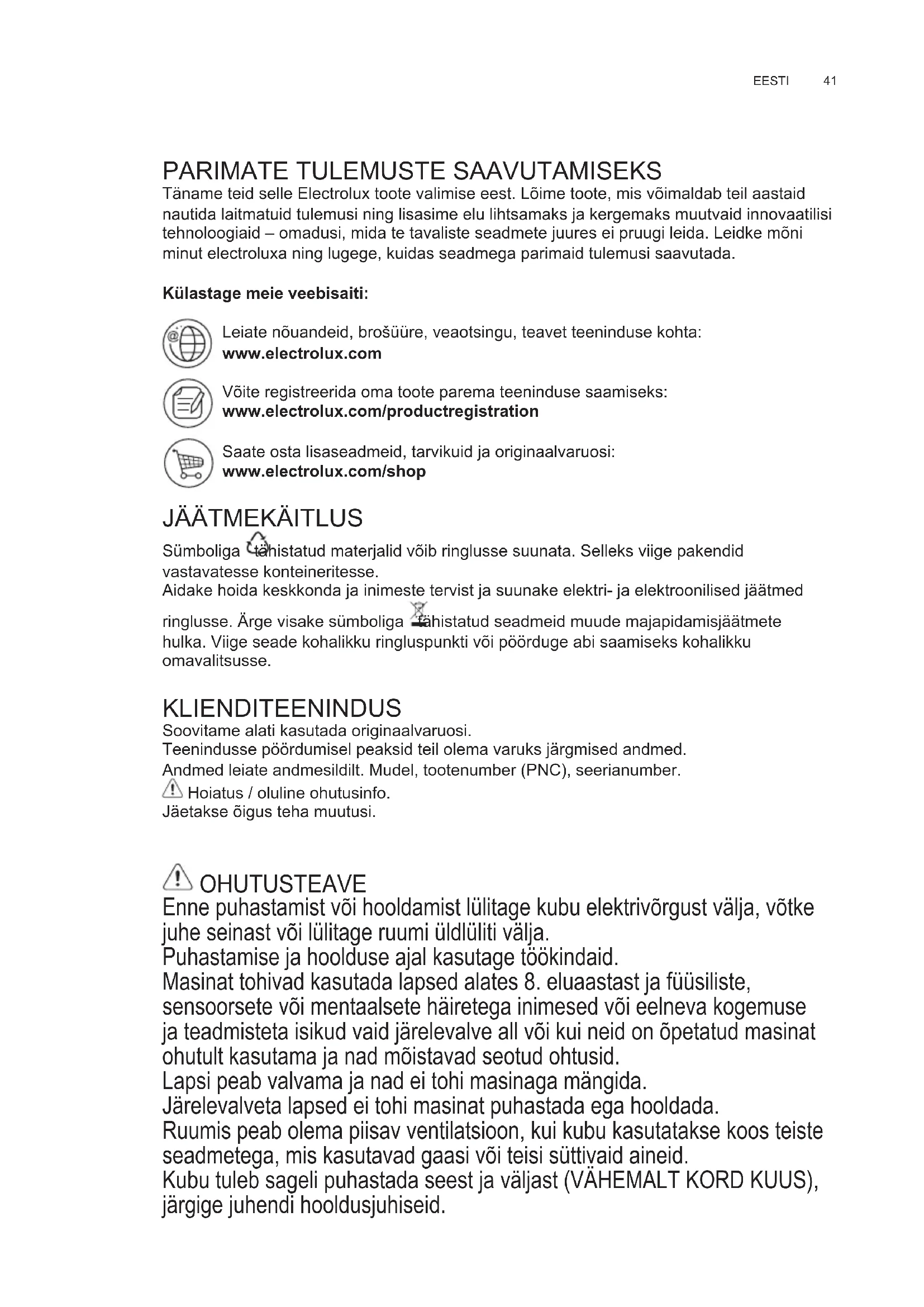Täname teid selle Electrolux toote valimise eest. Lõime toote, mis võimaldab teil aastaid nautida laitmatuid tulemusi ning lisasime elu lihtsamaks ja kergemaks muutvaid innovaatilisi tehnoloogiaid – omadusi, mida te tavaliste seadmete juures ei pruugi leida Leidke mõni minut electroluxa ning lugege, kuidas seadmega parimaid tulemusi saavutada Külastage meie veebisaiti: Leiate nõuandeid, brošüüre, veaotsingu, teavet teeninduse kohta: www.electrolux.com Võite registreerida oma toote parema teeninduse saamiseks: www.electrolux.com/productregistration Saate osta lisaseadmeid, tarvikuid ja originaalvaruosi: www.electrolux.com/shop
