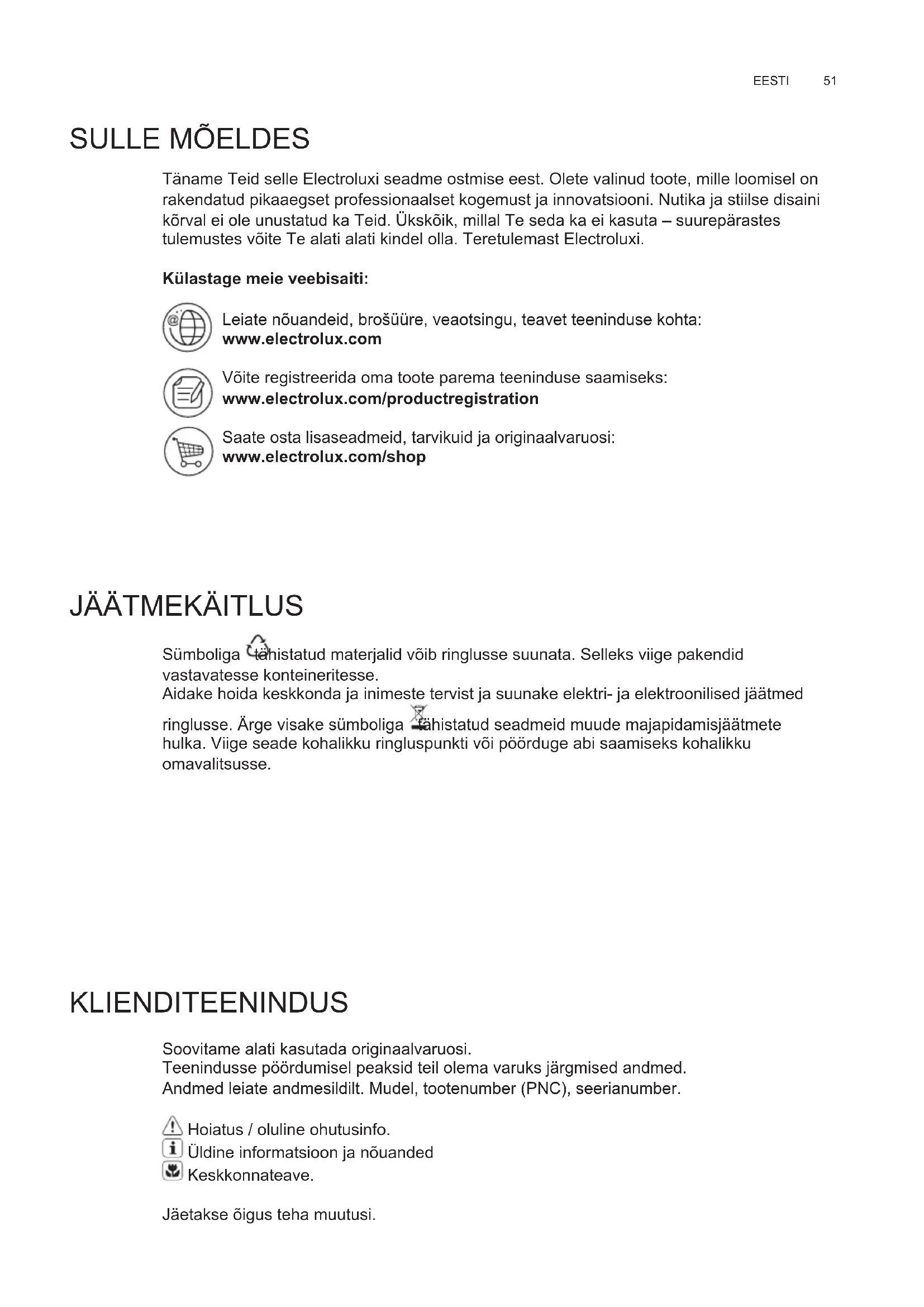 Sümboliga tähistatud materjalid võib ringlusse suunata. Selleks viige pakendid vastavatesse konteineritesse. Aidake hoida keskkonda ja inimeste tervist ja suunake elektri- ja elektroonilised jäätmed ringlusse. Ärge visake sümboliga tähistatud seadmeid muude majapidamisjäätmete hulka. Viige seade kohalikku ringluspunkti või pöörduge abi saamiseks kohalikku omavalitsusse. KLIENDITEENINDUS Soovitame alati kasutada originaalvaruosi. Teenindusse pöördumisel peaksid teil olema varuks järgmised andmed. Andmed leiate andmesildilt. Mudel, tootenumber (PNC), seerianumber. Hoiatus / oluline ohutusinfo. Üldine informatsioon ja nõuanded Keskkonnateave. Jäetakse õigus teha muutusi. ET KASUTUSJUHENDwww.electrolux.com