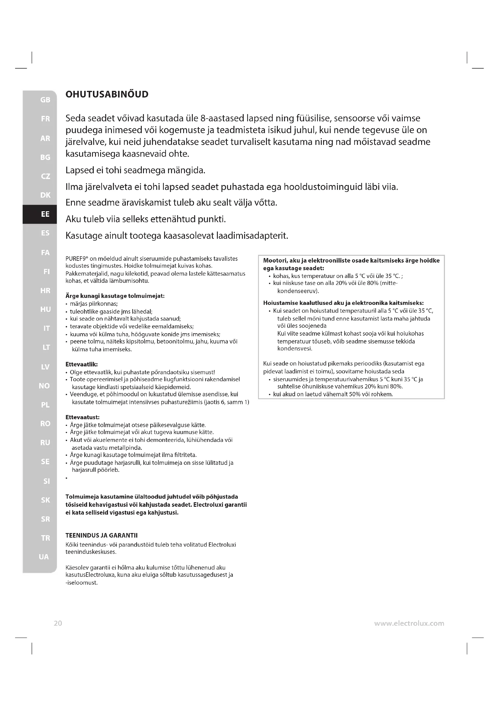 Kőiki teenindus- vői parandustöid tuleb teha volitatud Electroluxi teeninduskeskuses. Käesolev garantii ei hőlma aku kulumise tőttu lühenenud aku kasutusElectroluxa, kuna aku eluiga sőltub kasutussagedusest ja -iseloomust.TR