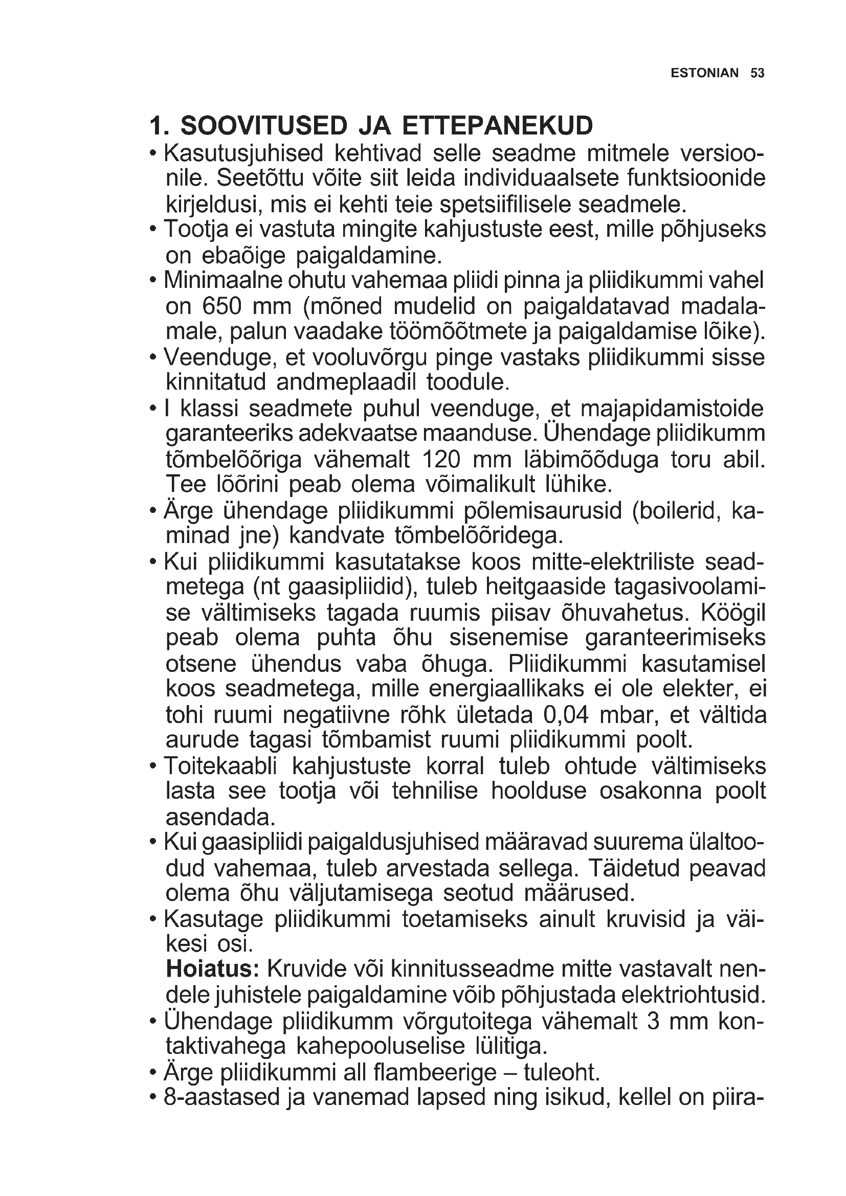 - Minimaalne ohutu vahemaa pliidi pinna ja pliidikummi vahel on 650 mm (mõned mudelid on paigaldatavad madala- male, palun vaadake töömõõtmete ja paigaldamise lõike).