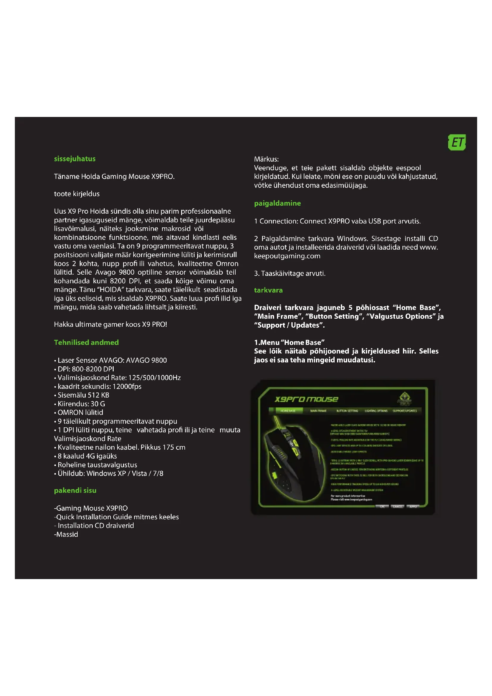 tarkvara Draiveri tarkvara jaguneb 5 põhiosast “Home Base”, “Main Frame”, “Button Setting”, “Valgustus Options” ja “Support / Updates”. 1.Menu “Home Base” See lõik näitab põhijooned ja kirjeldused hiir. Selles jaos ei saa teha mingeid muudatusi.ET 2.Pro les In X9PRO saame säästa 5 erineva pro iliga. Pro ili vahetamiseks sa lihtsalt vajutage nupule “MODE” ja te muudate pro ili soovite.LED näitab, milline pro il olete sisse saate aktiveerida ka konto, klõpsates seda ja “Apply”. Saate luua varukoopia oma andmeid, klõpsates “Salvesta” variant. Võite taastada varukoopia oma pro ili klõpsates “Load” variant. 3.Menu “Main kontrolli See võimaldab teil muuta hiire tundlikkust, kiirus ja kiirendus. Siin saab muuta ka kiirus, millega ratas nupp töötab “Leidke” ja double-click kiirus. “X” ja “Y” teljel saab reguleerida sõltumatult. 4.Menu “Button Setting” Selles osas me muuta ja luua makrosid, et see sobiks meie vajadustele. Me võime muuta ka DPI tasandil vaikimisi hiire reset koormus või salvestada pro ili. X9PRO seadnud 11 default meetmete seadistada vastavalt täht näitab selle funktsiooni. Mõni neist nupud saab seadistada.ET Kui me tahame midagi muuta need 11 meedet, peame klõpsa sellel ja kas määrata makro või määrata ükskõik palju võimalusi, et tarkvara pakub. MACRO PLANEERIMINE - Klõpsake nuppu tarkvara, mida me tahame muuta - Valige “Macro Programming” variant. - Vajuta “Start Record”. - Sisestage soovitud klahvikombinatsioon. - Vaju ta “Stop Record” ja seejärel “OK”. Seadmiseks tagasi vaikimisi, klõpsake “Taasta vaikimisi”.