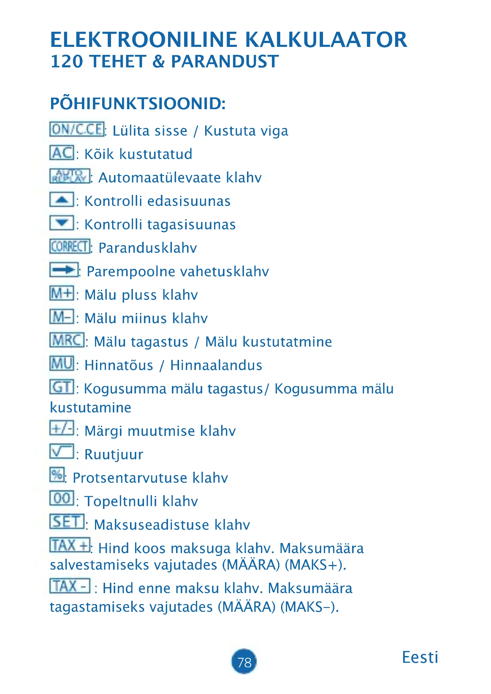 . ADD2 : see näitab, et komakohtade arv on automaatselt 2. (näiteks, kui sisestate “.”, siis see asukoht on aluseks). Seda omadust saab tõhusalt kasutada vaid liitmisel ja lahutamisel. LCD EKRAANI KIRJELDUS: GT : KOGUSUMMA märk, mis näitab, et kogusumma (GT) mälu on toimiv. M : Sõltumatu mälu märk näitab, et sõltumatu mälu on toimiv. - : Miinusmärk. E : Vea märk, kui ekraanile ilmub “E”, võite vajutada klahvile , et viga kustutada.80 TEHE: