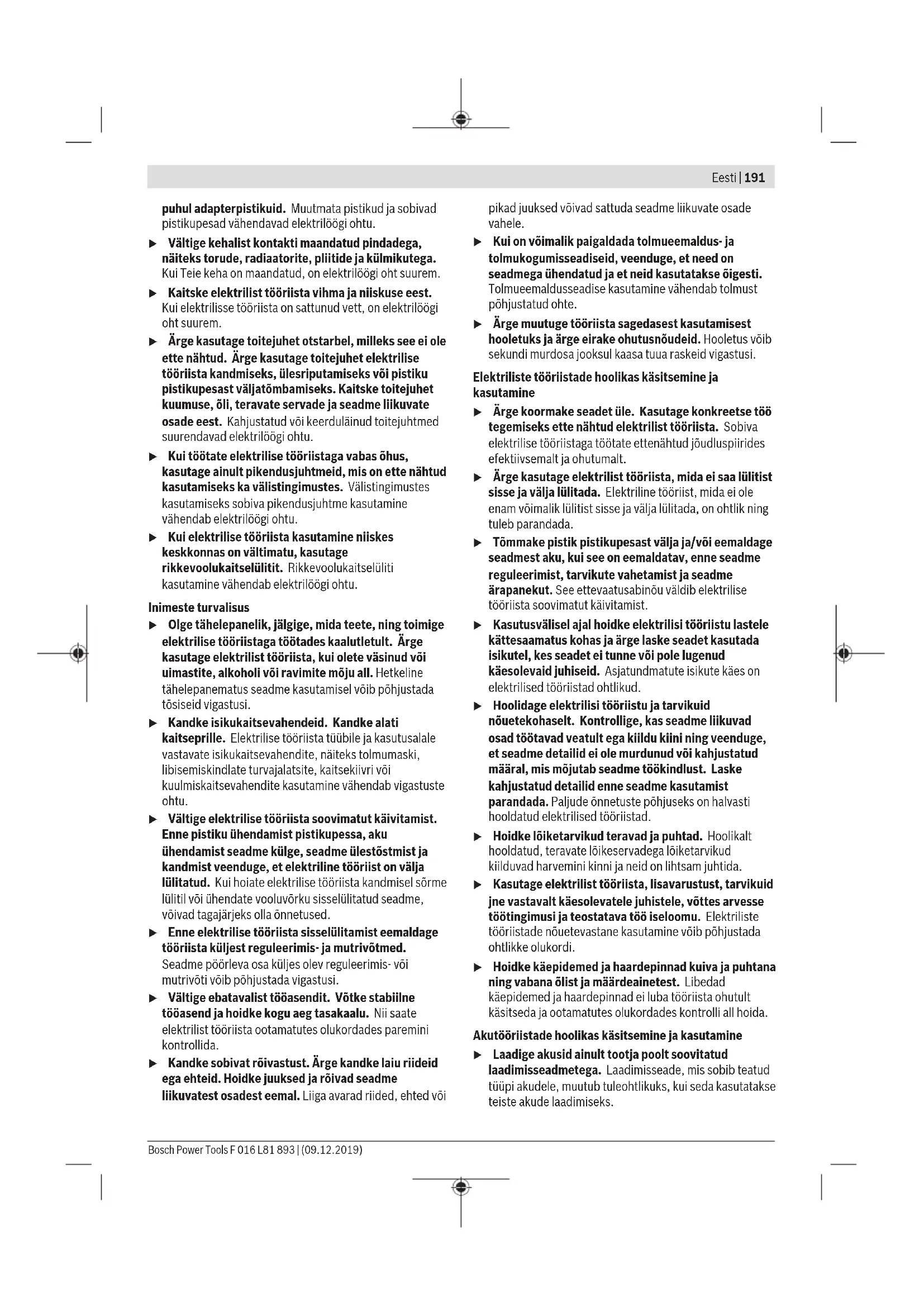 Pritisnite tipku za deblokiranje (12) i pomaknite pokrov (5) prema natrag. Skinite pokrov (5) s kućišta. Preklopite rezni nož (6)/(7) prema gore, a zatim izvadite rezni nož (6)/(7). Usmjerite izreze na reznom nožu (6)/(7) prema zaticima za držanje, a zatim preklopite rezni nož (6)/(7) prema dolje. Ponovno stavite pokrov (5), a zatim ga pomaknite prema naprijed dok se ne uglavi. Rad u Pobrinite se za to da je pokrov USB utičnice (2) tijekom rada zatvoren. Tako ćete izbjeći ulazak prašine. u Ne rabite oštećene noževe (npr. bez pukotina itd.). Odmah zamijenite oštećene noževe. Uključivanje/isključivanje (vidi sliku D) Pritisnite uklopni zapor (4) i u pritisnutom stanju pritisnite sklopku za uključivanje/isključivanje (3). Pustite uklopni zapor (4). Kada pritisnite sklopku za uključivanje/isključivanje (3), žaruljica svijetli zeleno. Pokazivač napunjenosti akumulatora Žaruljica Kapacitet Žaruljica svijetli zeleno 33−100% Žaruljica Kapacitet Žaruljica svijetli crveno kada je sklopka za uključivanje/ isključivanje napola pritisnuta 0−33% Rezanje živice (samo škare za grmlje) u Pobrinite se za to da je prilikom uklanjanja odrezanog materijala ili servisiranja proizvod isključen. Nenamjerno uključivanje može uzrokovati teške ozljede. Prije početka rada provjerite postoje li skrivena strana tijela u živici kao što su npr. vrtne ograde. Moguće je rezati grane debljine maks. 8 mm. Pomičite proizvod jednoliko po liniji rezanja kako biste grane dovoditi reznom nožu. Dvostrani nosač noža omogućava rezanje u oba smjera ili njišućim pokretima od jedne do druge strane. Nakon uporabe stavite štitnik reznog noža. Preporučena godišnja doba Bjelogorične živice režite u lipnju i listopadu. Crnogorične živice režite u travnju i kolovozu. Četinjače i druge brzorastuće živice režite počevši od svibnja cca. svakih 6tjedana. Rezanje rubova (samo škare za travu) Vodite proizvod duž ruba travnjaka. Izbjegavajte da rezni nož dođe u kontakt s popločenim podovima, kamenjem ili vrtnim zidovima jer to znatno skraćuje vijek trajanja reznog noža. Nakon uporabe stavite štitnik reznog noža. Otklanjanje pogrešaka Simptomi Mogući uzrok Rješenje Kratko trajanje rezanja po punjenju akumulatora Akumulator se približava kraju svog vijeka trajanja Obratite se servisnoj službi. Pokazivač punjenja akumulatora svijetli crveno i vrtni uređaj nije moguće uključiti. Temperatura akumulatora je previsoka Okolna temperatura je previsoka. Ne izlažite vrtni uređaj izravnoj sunčanoj svjetlosti. Pričekajte 10-15 minuta kako bi se akumulator mogao ohladiti. Održavanje i servisiranje Održavanje, čišćenje i skladištenje u Električni alat i otvore za hlađenje održavajte čistima kako bi se moglo dobro i sigurno raditi. u Održavajte proizvod čistim kako biste mogli dobro i sigurno raditi. Ne stavljajte druge predmete na vrtni uređaj. Održavajte proizvod i ventilacijske proreze čistima kako biste mogli dobro i sigurno raditi. Nikada ne prskajte proizvod vodom. Nikada ne uranjajte proizvod u vodu. Skladištite proizvod na sigurnom, suhom mjestu i izvan dosega djece. Ne stavljajte druge predmete na proizvod. Pobrinite se za to da su sve matice, svornjaci i vijci učvršćeni kako bi bilo moguće sigurno raditi proizvodom. Provjerite proizvod i radi sigurnosti zamijenite istrošene ili oštećene dijelove. Pobrinite se za to da je rezervne dijelove proizvela tvrtka Bosch. Servisna služba i savjeti o uporabi www.bosch-garden.com Bosch Power Tools F 016 L81 893 | (09.12.2019)190 | Eesti Prilikom naručivanja rezervnih dijelova i kod svih upita molimo svakako navedite 10-znamenkasti broj artikla prema označnoj pločici proizvoda. Hrvatski Robert Bosch d.o.o PT/SHR-BSC Kneza Branimira 22 10040 Zagreb Tel.: +385 12 958 051 Fax: +385 12 958 050 E-Mail: RBKN-bsc@hr.bosch.com www.bosch.hr Bosnia Elektro-Servis Vl. Mehmed Nalić Dzemala Bijedića bb 71000 Sarajevo Tel./Fax: +387 33454089 E-Mail: bosch@bih.net.ba Transport Litij-ionske aku-baterije podliježu zakonu o transportu opasnih tvari. Korisnik bez ikakvih preduvjeta može transportirati aku-baterije cestovnim transportom. Ako transport obavlja treća strana (npr. transport zrakoplovom ili špedicija), treba se pridržavati posebnih zahtjeva za ambalažu i označavanje. Kod pripreme ovakvih pošiljki za transport prethodno se treba savjetovati sa stručnjakom za transport opasnih tvari. Zbrinjavanje Proizvode, akumulatore, pribor i pakiranja potrebno je odnijeti na ekološko recikliranje. Ne bacajte proizvode i akumulatore/baterije u kućni otpad! Samo za zemljeEU: U skladu s Europskom direktivom 2012/19/EU nefunkcionalne proizvode, a u skladu s Europskom direktivom 2006/66/EZ neispravne ili istrošene akumulatore/baterije potrebno je odvojeno prikupiti i ekološki zbrinuti. Aku-baterije/baterije: Litij-ionske: Pridržavajte se uputa u poglavlju Transport (vidi „Transport“, Stranica190). u Integrirane akumulatore smije zbrinjavati samo stručno osoblje. Otvaranjem obloge kućišta proizvod se može uništiti. Kako biste izvadili akumulator iz proizvoda, aktivirajte proizvod dok se akumulator potpuno ne isprazni. Odvrnite vijke na kućištu i skinite ljusku kućišta kako biste izvadili akumulator. Kako biste izbjegli kratki spoj, redom pojedinačno odvajajte priključke na akumulatoru, a zatim izolirajte polove. Čak i kada je potpuno ispražnjen, u akumulatoru postoji preostali kapacitet koji se može osloboditi u slučaju kratkog spoja. Eesti Ohutusnõuded Sümbolite selgitus Lugege kasutusjuhend läbi. Veenduge, et eemale paiskuvad võõrkehad ei vigasta läheduses viibivaid inimesi. Hoiatus: Hoidke töötavast seadmest ohutusse kaugusse. Ärge kasutage seadet vihmase ilmaga ega jätke seda vihma kätte. Tähelepanu: Lõiketera pöörleb edasi ka pärast tööriista väljalülitamist! Hoidke käed lõiketeradest eemal. Üldised ohutusnõuded elektriliste tööriistade kasutamisel HOIATUS Lugeg