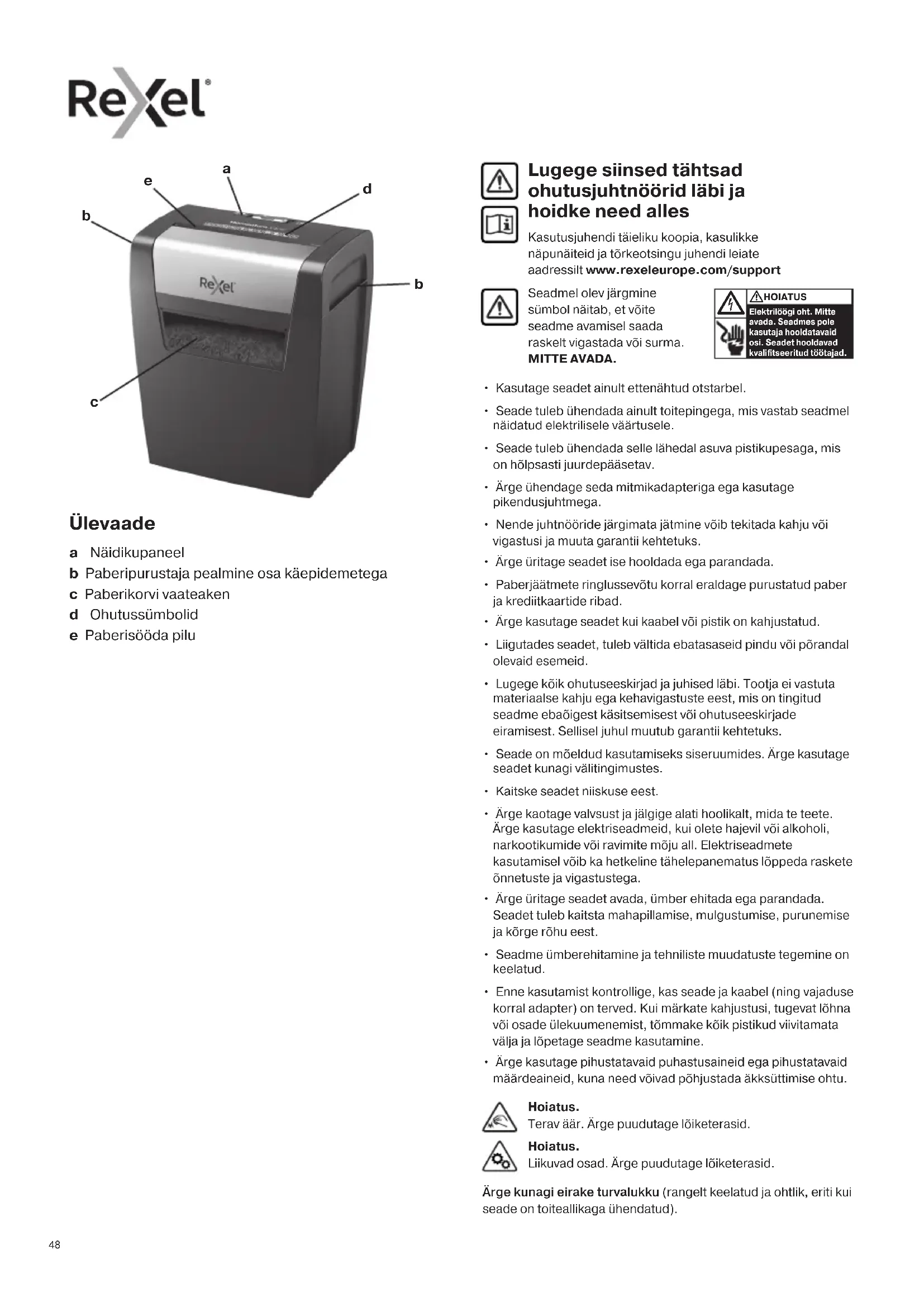 Lugege siinsed tähtsad ohutusjuhtnöörid läbi ja hoidke need alles Kasutusjuhendi täieliku koopia, kasulikke näpunäiteid ja tõrkeotsingu juhendi leiate aadressilt www.rexeleurope.com/support Ülevaade a Näidikupaneel b Paberipurustaja pealmine osa käepidemetega c Paberikorvi vaateaken d Ohutussümbolid e Paberisööda pilu
