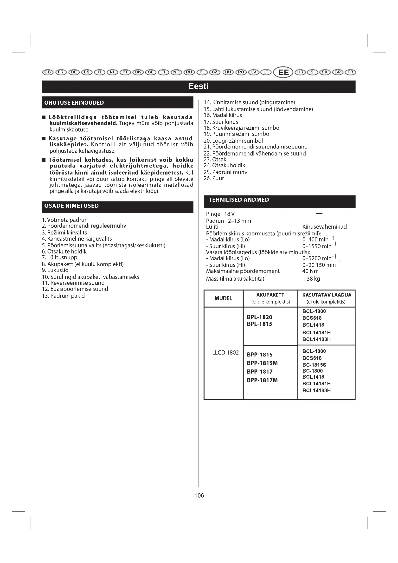 TEHNILISED ANDMED Pinge 18 V Padrun 2–13 mm Lüliti Kiirusevahemikud Pöörlemiskiirus koormuseta (puurimisrežiimil): - Madal kiirus (Lo) 0–400 min