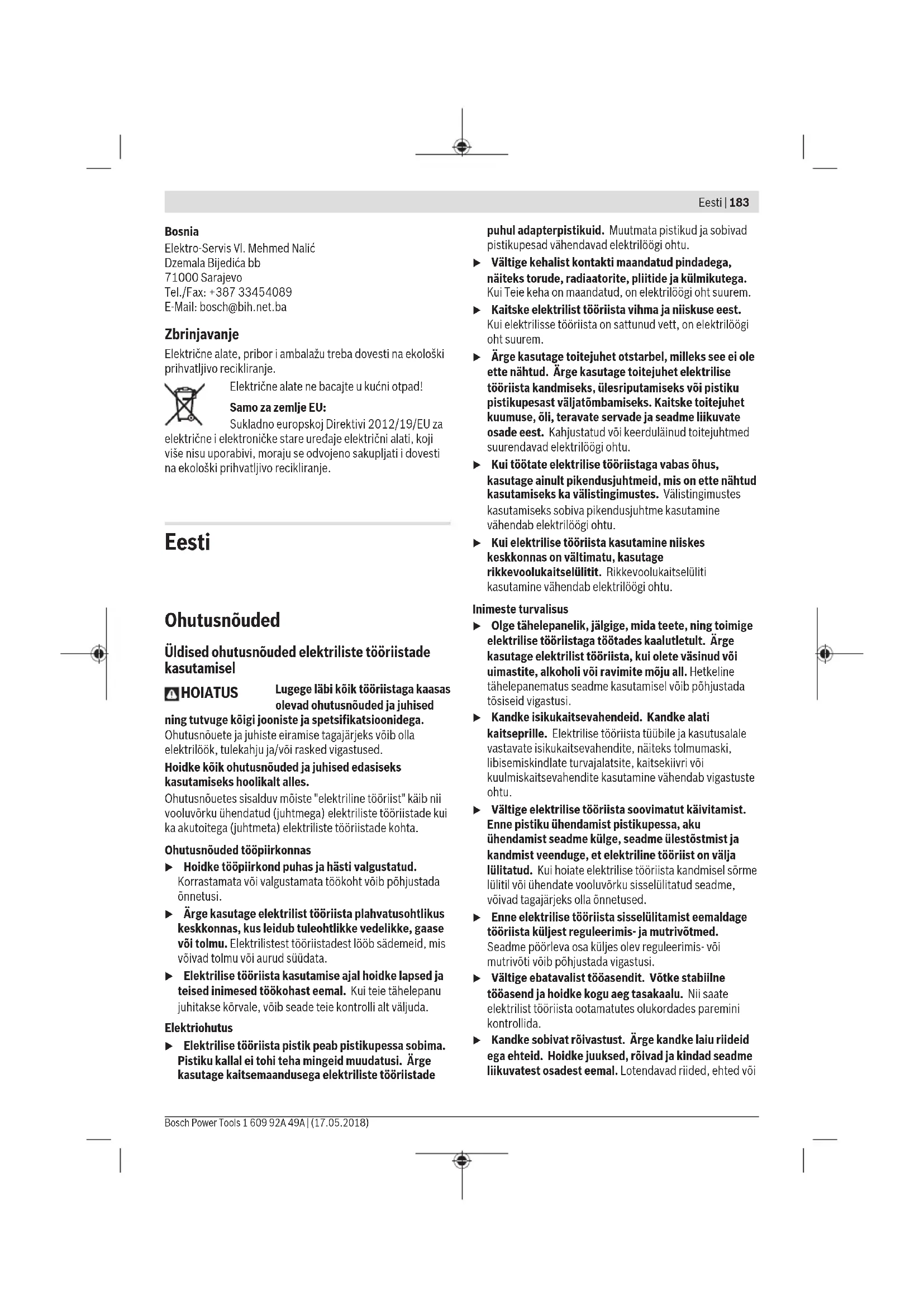 Lihvpaberi vahetamine (vt jn A) Lihvpaberi (10) eemaldamiseks kergitage seda servast ja tõmmake lihvtaldrikult (8) maha. Eemaldage enne uue lihvpaberi paigaldamist lihvtaldrikult (8) mustus ja tolm, nt pintsliga. Lihvtaldriku (8) pealispind koosneb takjakangast, millele saate takjakinnitusega lihvpaberid kiiresti ja lihtsalt kinnitada. Suruge lihvpaber (10) tugevalt lihvtaldriku (8) alaküljele. Tolmu optimaalse äraimemise tagamiseks jälgige, et väljastantsitud kohad lihvpaberil kattuksid lihvtaldriku avadega.Lihvtaldriku valik Sõltuvalt konkreetsest tööst saab elektrilise tööriista varustada erineva kõvadusega lihvtaldrikutega: – Eriti pehme lihvtaldrik: sobib poleerimiseks ja tundlikuks lihvimiseks, ka kumerate pindade korral. – Pehme lihvtaldrik: sobib kõikideks lihvimistöödeks, universaalselt kasutatav. – Kõva lihvtaldrik: sobib tasaste pindade suuremahuliseks lihvimiseks. Lihvtaldriku vahetamine (vt jn B) Märkus: Vahetage vigastatud lihvtaldrik (8) kohe uue vastu. Tõmmake lihvleht või poleerimistööriist maha. Keerake kruvi (11) täiesti välja ja võtke lihvtaldrik (8) ära. Asetage uus lihvtaldrik (8) kohale ja pingutage kruvi uuesti. Märkus: Jälgige lihvtaldriku kohaleasetamisel, et kaasavõtja hambad haarduksid lihvtaldriku väljalõigetega. Märkus: Vigastatud lihvtaldriku kandurit tohib vahetada lasta ainult Boschi elektritööriistade volitatud klienditeenindusasutuses. Tolmu/saepuru äratõmme Pliisisaldusega värvide, teatud puiduliikide, mineraalide ja metalli tolm võib kahjustada tervist. Tolmuga kokkupuude ja tolmu sissehingamine võib põhjustada seadme kasutajal või läheduses viibivatel inimestel allergilisi reaktsioone ja/või hingamisteede haigusi. Teatud tolm, näiteks tamme- ja pöögitolm, on vähkitekitava toimega, iseäranis kombinatsioonis puidutöötlemisel kasutatavate lisaainetega (kromaadid, puidukaitsevahendid). Asbesti sisaldavat materjali tohivad töödelda üksnes vastava ala asjatundjad. – Kasutage konkreetse materjali eemaldamiseks sobivat tolmuimejat. – Tagage töökohas hea ventilatsioon. – Soovitav on kasutada hingamisteede kaitsemaski filtriga P2. Pidage kinni töödeldavate materjalide suhtes Teie riigis kehtivatest eeskirjadest. u Vältige tolmu kogunemist töökohta. Tolm võib kergesti süttida. Iseimemine tolmukarbiga (vt jooniseid C–G) Lükake tolmukarp (7) väljapuhkeotsakule (12). Keerake sealjuures tolmukarpi nii, et väljalõiked tolmukarbis ühtivad väljapuhkeotsaku nagadega ja tolmukarp fikseerub tuntavalt. Tolmukarbi (7) täitetaset saab läbipaistvas anumas kergesti kontrollida. Tolmukarbi (7) tühjendamiseks tõmmake see veidi pöörates tahapoole maha. Kruvige filterelement (6) lahti ja tõmmake tolmukarbist (7) välja. Tühjendage tolmukarp. Koputage filtrielementi(6) tolmu lahtilöömiseks kergelt vastu kõva aluspinda. Puhastage filtrielemendi (6) lamellid pehme harjaga. Suunis: Optimaalse tolmueemaldamise tagamiseks tühjendage tolmukarp (7) õigeaegselt ja puhastage filtrielementi (6) korrapäraselt. Hoidke elektrilist tööriista vertikaalsete pindade töötlemisel alati nii, et tolmukarp (7) oleks alla suunatud. Väljast tolmueemaldus (vt jn H) Ühendage imivoolik (13) väljapuhkeotsakuga (12). Lükake imivoolik (joonisel kujutatud viisil) väljapuhkeotsakule, nii et väljapuhkeotsaku külgmised avad jäävad vabaks. Sel juhul ei ime elektriline tööriist ennast lihvimise ajal töödeldava detaili külge ega mõjuta pinna kvaliteeti. Ühendage imivoolik (13) tolmuimejaga (lisavarustus). Ülevaate erinevate tolmuimejatega ühendamise võimalustest leiate selle juhendi lõpust. Tolmuimeja peab töödeldava materjali tolmu imemiseks sobima. Tervistkahjustava, kantserogeense ja kuiva tolmu eemaldamiseks kasutage spetsiaaltolmuimejat. Horisontaalsete pindade töötlemisel hoidke seadet nii, et imivoolik on suunatud alla. Lisakäepide Lisakäepide (1) võimaldab mugavat käsitsemist ja optimaalset jõujaotust, eelkõige rohke materjali eemaldamise korral. Kinnitage lisakäepide (1) korpusele kruviga (2). Kasutus Kasutuselevõtt u Pöörake tähelepanu võrgupingele! Vooluallika pinge peab ühtima elektrilise tööriista andmesildil märgitud pingega. Andmesildil toodud 230V seadmeid võib kasutada ka 220V võrgupinge korral. Sisse-/väljalülitamine u Veenduge, et saate lülitit (sisse/välja) käsitseda, ilma et lasete käepidemest lahti. Elektrilise tööriista sisselülitamiseks vajutage sisse-/ väljalülitit (4). Fikseerimiseks hoidke sisse-/väljalülitit (4) surutult ning vajutage täiendavalt fikseerimisnuppu (5). Elektrilise tööriista väljalülitamiseks vabastage sisse-/ väljalüliti (4). Fikseeritud sisse-/väljalüliti (4) korral kõigepealt vajutage seda ja seejärel vabastage. Võnkumiskiiruse eelvalimine Võnkumiskiiruse eelvalikurattaga (3) saate vajaliku võnkumiskiiruse eelvalida ka töötamise ajal. 1 – 2 madal võnkumiskiirus 3 – 4 keskmine võnkumiskiirus 5 – 6 suur võnkumiskiirus Vajalik võnkumiskiirus oleneb materjalist ja töötingimustest ning see tuleb kindlaks teha praktilise katse käigus. Eesti | 187 Bosch Power Tools 1 609 92A 49A | (17.05.2018)188 | Eesti 1 609 92A 49A | (17.05.2018) Bosch Power Tools Pärast pikemaajalist tööd madalal võnkumiskiirusel tuleks elektrilisel tööriistal lasta jahtumiseks töötada umbes 3 minutit tühikäigul maksimaalse võnkumiskiirusega. Lihvtaldriku pidur Integreeritud lihvtaldriku pidur alandab tühikäigul võnkumiskiirust, et elektrilise tööriista asetamisel töödeldavale detailile ei tekiks sooni. Kui tühikäigu võnkumiskiirus aja jooksul pidevalt tõuseb, on lihvtaldrik kahjustatud ja tuleb välja vahetada või on lihvtaldriku pidur kulunud. Kulunud lihvtaldriku pidur tuleb lasta välja vahetada Boschi elektriliste tööriistade volitatud klienditeenindusasutuses. Tööjuhised u Enne mistahes tööde teostamist elektrilise tööriista kallal tõmmake pistik pistikupesast välja. u Enne käestpanekut ood