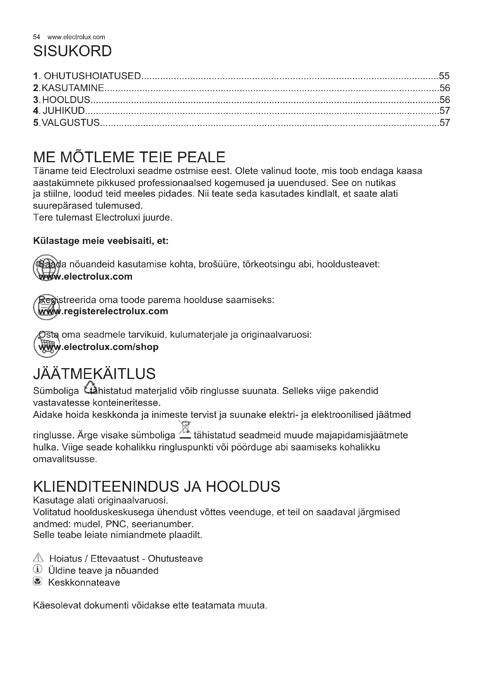 Täname teid Electroluxi seadme ostmise eest. Olete valinud toote, mis toob endaga kaasa aastakümnete pikkused professionaalsed kogemused ja uuendused. See on nutikas ja stiilne, loodud teid meeles pidades. Nii teate seda kasutades kindlalt, et saate alati suurepärased tulemused. Tere tulemast Electroluxi juurde. Külastage meie veebisaiti, et: Saada nõuandeid kasutamise kohta, brošüüre, tõrkeotsingu abi, hooldusteavet: www.electrolux.com Registreerida oma toode parema hoolduse saamiseks: www.registerelectrolux.com Osta oma seadmele tarvikuid, kulumaterjale ja originaalvaruosi: www.electrolux.com/shop