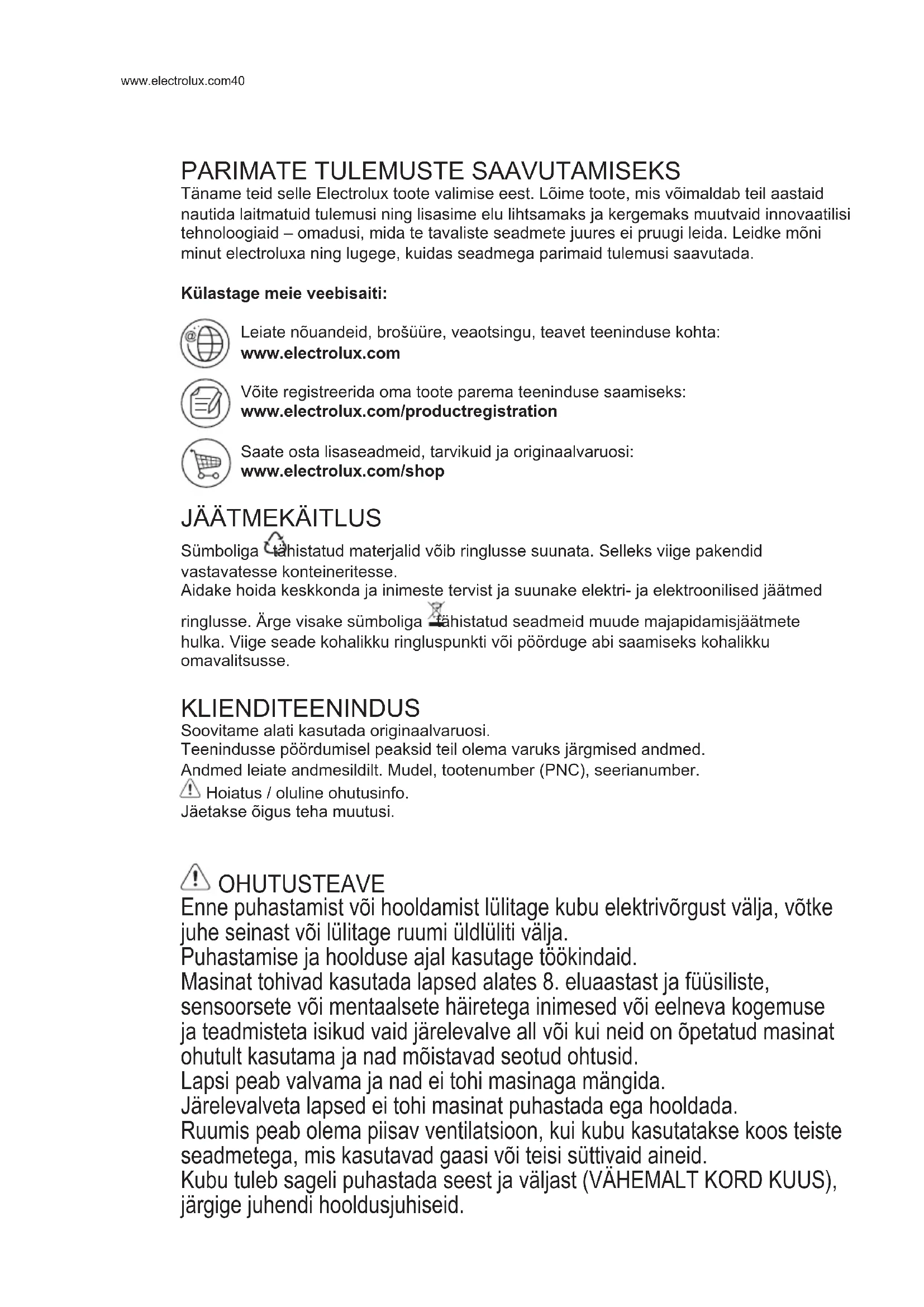 Täname teid selle Electrolux toote valimise eest. Lõime toote, mis võimaldab teil aastaid nautida laitmatuid tulemusi ning lisasime elu lihtsamaks ja kergemaks muutvaid innovaatilisi tehnoloogiaid – omadusi, mida te tavaliste seadmete juures ei pruugi leida Leidke mõni minut electroluxa ning lugege, kuidas seadmega parimaid tulemusi saavutada Külastage meie veebisaiti: Leiate nõuandeid, brošüüre, veaotsingu, teavet teeninduse kohta: www.electrolux.com Võite registreerida oma toote parema teeninduse saamiseks: www.electrolux.com/productregistration Saate osta lisaseadmeid, tarvikuid ja originaalvaruosi: www.electrolux.com/shop