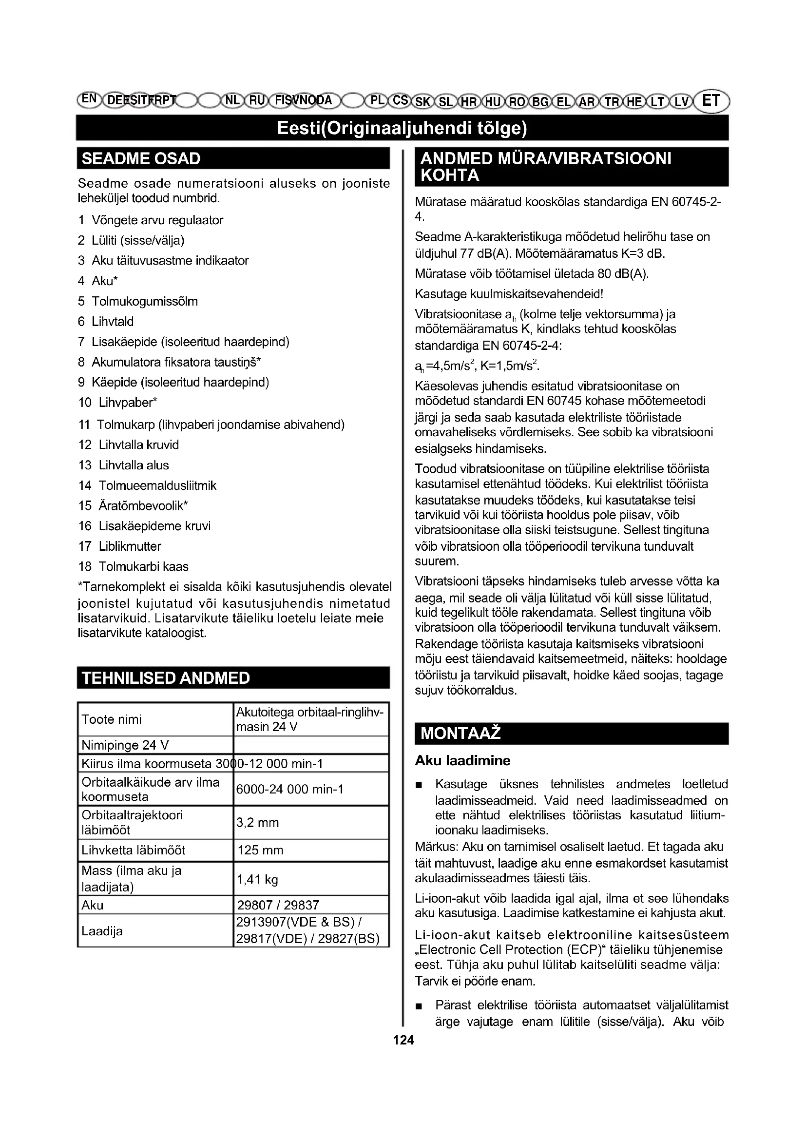SEADME OSAD Seadme osade numeratsiooni aluseks on jooniste leheküljel toodud numbrid. 1 Võngete arvu regulaator 2 Lüliti (sisse/välja) 3 Aku täituvusastme indikaator 4 Aku* 5 Tolmukogumissõlm 6 Lihvtald 7 Lisakäepide (isoleeritud haardepind) 8 Akumulatora ksatora taustiņš* 9 Käepide (isoleeritud haardepind) 10 Lihvpaber* 11 Tolmukarp (lihvpaberi joondamise abivahend) 12 Lihvtalla kruvid 13 Lihvtalla alus 14 Tolmueemaldusliitmik 15 Äratõmbevoolik* 16 Lisakäepideme kruvi 17 Liblikmutter 18 Tolmukarbi kaas *Tarnekomplekt ei sisalda kõiki kasutusjuhendis olevatel joonistel kujutatud või kasutusjuhendis nimetatud lisatarvikuid. Lisatarvikute täieliku loetelu leiate meie lisatarvikute kataloogist. TEHNILISED ANDMED Toote nimi Akutoitega orbitaal-ringlihv- masin 24 V Nimipinge 24 V Kiirus ilma koormuseta 3000-12 000 min-1 Orbitaalkäikude arv ilma koormuseta 6000-24 000 min-1 Orbitaaltrajektoori läbimõõt 3,2 mm Lihvketta läbimõõt 125 mm Mass (ilma aku ja laadijata) 1,41 kg Aku 29807 / 29837 Laadija 2913907(VDE & BS) / 29817(VDE) / 29827(BS)