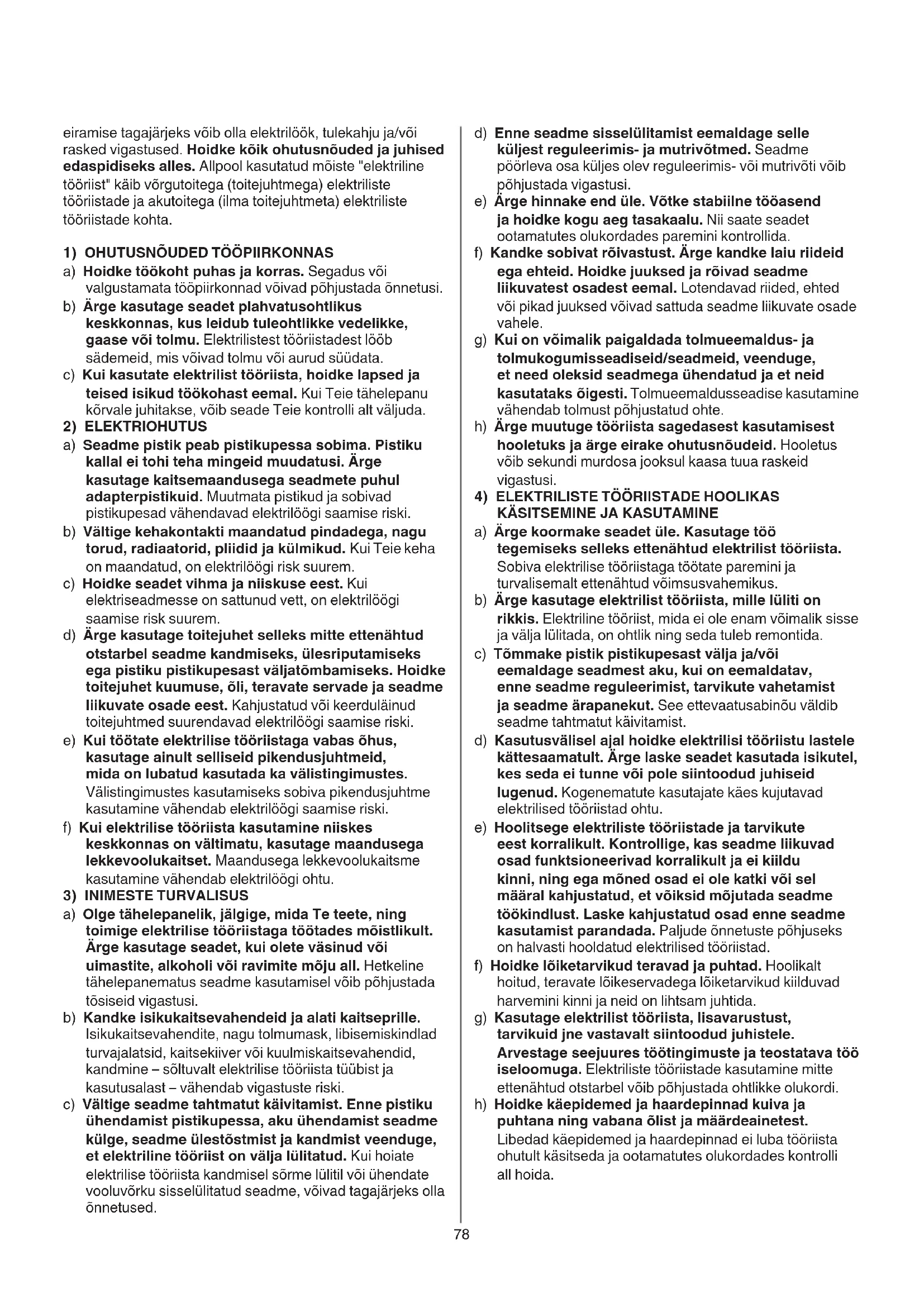 a) Olge tähelepanelik, jälgige, mida Te teete, ning toimige elektrilise tööriistaga töötades mõistlikult. Ärge kasutage seadet, kui olete väsinud või uimastite, alkoholi või ravimite mõju all. Hetkeline tähelepanematus seadme kasutamisel võib põhjustada tõsiseid vigastusi. b) Kandke isikukaitsevahendeid ja alati kaitseprille. Isikukaitsevahendite, nagu tolmumask, libisemiskindlad turvajalatsid, kaitsekiiver või kuulmiskaitsevahendid, kandmine – sõltuvalt elektrilise tööriista tüübist ja kasutusalast – vähendab vigastuste riski. c) Vältige seadme tahtmatut käivitamist. Enne pistiku ühendamist pistikupessa, aku ühendamist seadme külge, seadme ülestõstmist ja kandmist veenduge, et elektriline tööriist on välja lülitatud. Kui hoiate elektrilise tööriista kandmisel sõrme lülitil või ühendate vooluvõrku sisselülitatud seadme, võivad tagajärjeks olla õnnetused.79