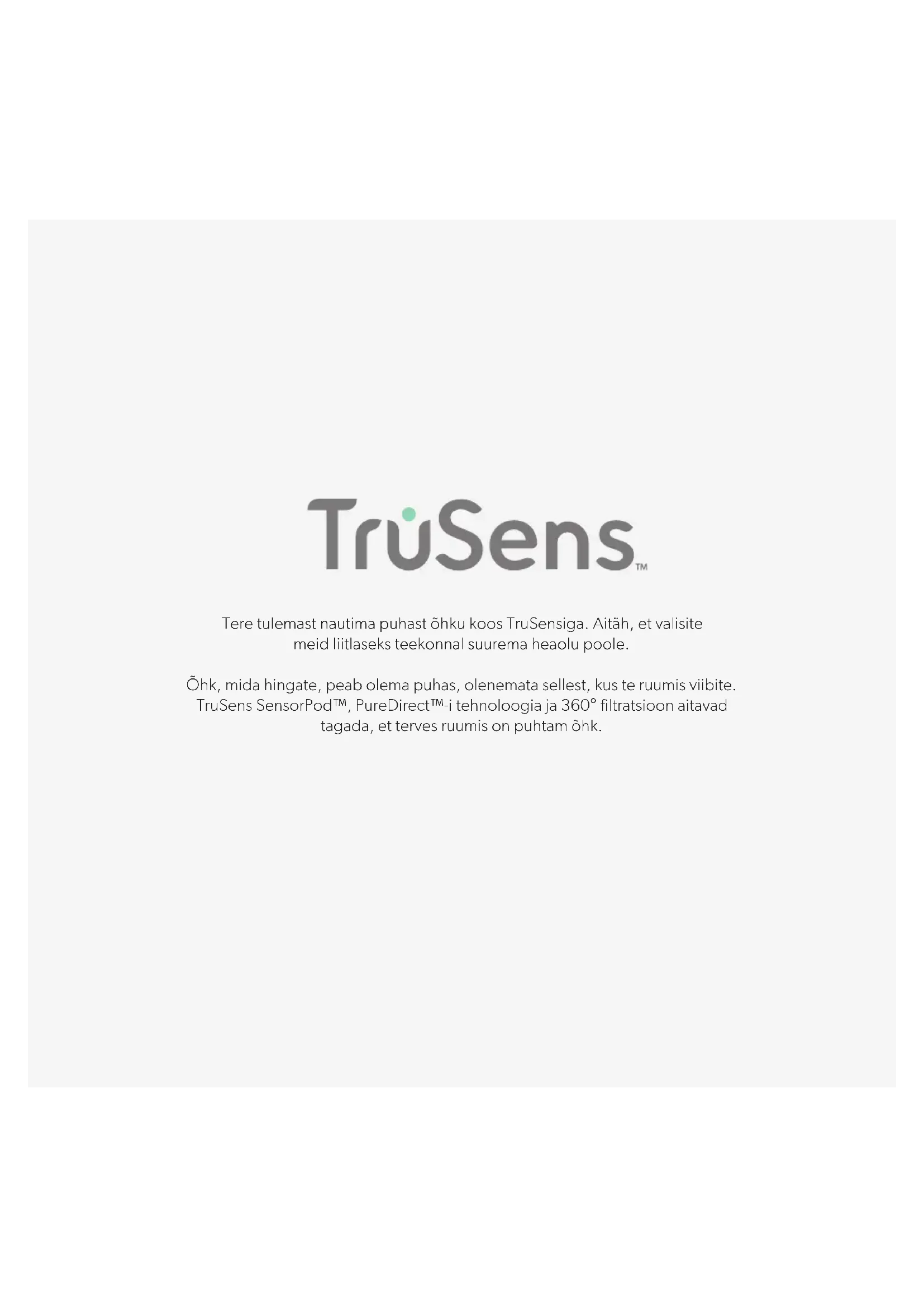 GARANTII Sellele seadmele kehtib tavapärase kasutuse korral tootja antav garantii kahe aasta jooksul alates ostukuupäevast. Garantiiperioodil võib ACCO defektse seadme omal äranägemisel tasuta ära parandada või asendada. Seadme väärkasutusest või ebasobival eesmärgil kasutusest tulenevad defektid garantii alla ei kuulu.Nõutav on ostukuupäeva tõendamine. Ettevõtte ACCO volitamata isikute tehtud remont või muudatused teevad garantii kehtetuks. Meie eesmärk on tagada, et meie seadmed vastaksid märgitud spetsifikatsioonidele. Siinne garantii ei mõjuta seaduslikke õigusi, mis tarbijatel on kauba müüki reguleerivate siseriiklike kehtivate õigusaktide alusel. TUGI Täname, et valisite oma koju TruSens™-i toote. Meie kliendid on meie jaoks kõige tähtsamad ning me püüame luua tooteid, mis sobituvad teie elustiiliga. Kui teil on küsimusi või kommentaare, võtke meiega ühendust! Külastage meie veebisaiti: www.leitz.com/trusens Kirjutage meile: baltic@acco.com Helistage meile: + 46 (0)8705 15 62 or + 358 9 7510 4200 Garantii registreerimiseks ja aktiveerimiseks minge aadressile: www.leitz.com/registerLaipni lūdzam tīrā gaisā ar TruSens. Pateicamies, ka ļāvāt mums pievienoties jūsu ceļojumā pretim labklājībai. Gaisam, kuru elpojat, ir jābūt tīram, neraugoties uz to, kurā telpas vietā atrodaties. TruSens SensorPod™, PureDirect™ tehnoloģija un filtrēšana 360°lenķī nodrošina, ka visa telpa iegūst tīrāku gaisu.208