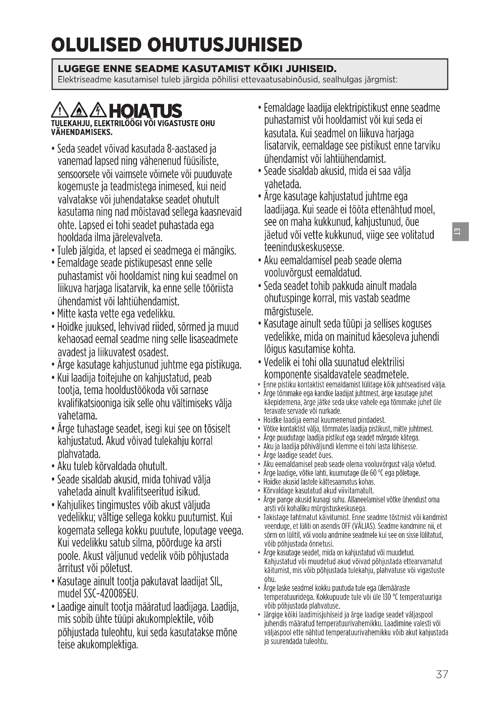 - Kasutage ainult tootja pakutavat laadijat SIL, mudel SSC-420085EU.