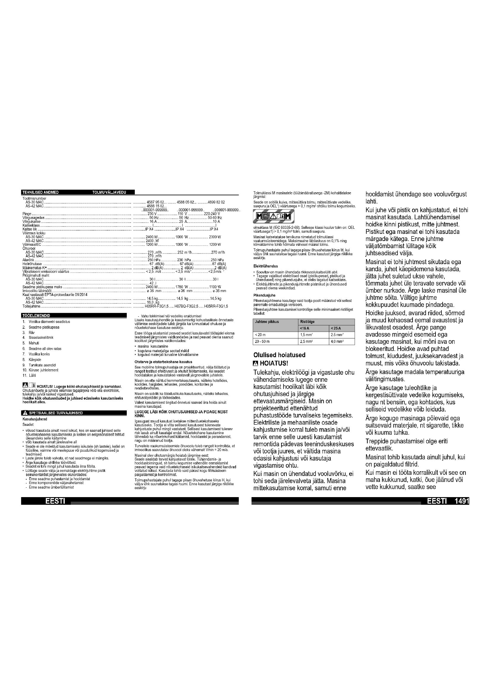 - kogutud materjali turvaline kõrvaldamine Otstarve ja otstarbekohane kasutus See mobiilne tolmupuhastaja on projekteeritud, välja töötatud ja rangelt testitud efektiivselt ja ohutult töötamiseks, kui seadet hooldatakse ja kasutatakse vastavalt järgnevatele juhistele. Masin on ette nähtud kommertskasutuseks, näiteks hotellides, koolides, haiglates, tehastes, poodides, kontorites ja rendiettevõtetes. Masin on sobilik ka tööstuslikuks kasutuseks, näiteks tehastes, ehitusobjektidel ja töökodades. Valest kasutamisest tingitud õnnetusi saavad ära hoida ainult masina kasutajad. LUGEGE LÄBI KÕIK OHUTUSJUHISED JA PIDAGE NEIST KINNI. Igasugust muud kasutust loetakse mittenõuetekohaseks kasutuseks. Tootja ei võta sellisest kasutusest tulenevate kahjustuste puhul mingit vastutust. Sellisest kasutamisest tulenev risk lasub ainult kasutajal endal. Nõuetekohane kasutamine tähendab ka nõuetekohast käitamist, hooldamist ja parandamist, nagu on määranud tootja. Turvaliste vaakumsüsteemide õhuvoolu tuleb rangelt kontrollida, et imivoolikus saavutatav õhuvool oleks vähemalt Vmin = 20 m/s. Masinal olev ohutusmärgis hoiatab järgmise eest: Seade sisaldab tervist kahjustavat tolmu. Tühjendamis- ja hooldustoiminguid, sh tolmu kogumise vahendite eemaldamist peavad tegema vaid nõuetekohaseid isikukaitsevahendeid kandvad volitatud isikud. Kasutada tohib vaid pärast kogu fi ltrisüsteem paigaldamist ja kontrollimist. Tolmupuhastajate puhul tagage piisav õhuvahetuse kiirus H, kui väljuv õhk suunatakse tagasi ruumi. Enne kasutust järgige riiklikke eeskirju Tolmuklassi M masinatele (tüübimääratlusega -2M) kohaldatakse järgmist: Seade on sobilik kuiva, mittesüttiva tolmu, mittesüttivate vedelike, saepuru ja OEL