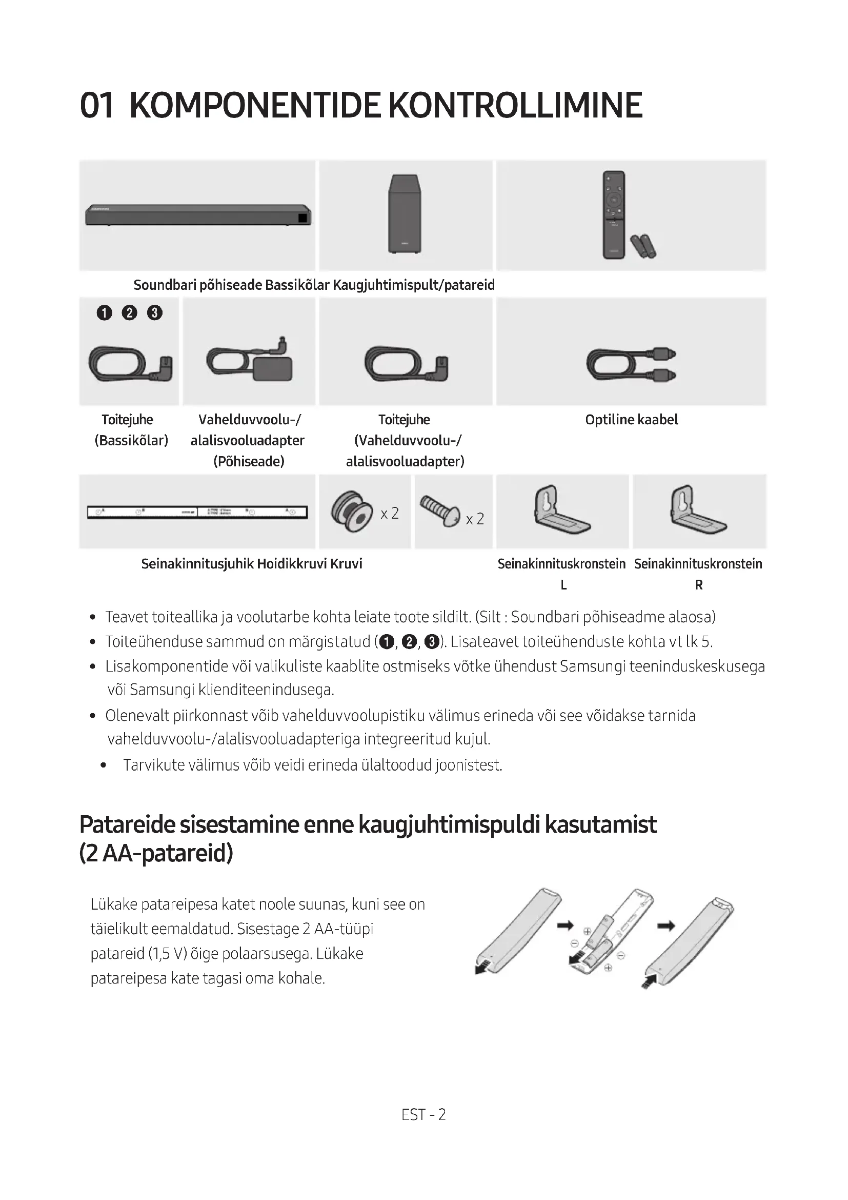 TÄIELIKUST KASUTUSJUHENDIST pääsete juurde Samsungi veebipõhises klienditoekeskuses, skannides QR-koodi. Juhendi vaatamiseks arvutis või mobiilsideseadmes laadige see dokumendi vormingus Samsungi veebisaidilt alla. (http://www.samsung.com/support) Disain ja tehnilised andmed võivad muutuda ilma ette teatamata.EST - iv SISUKORD 01 Komponentide Kontrollimine 2 Patareide sisestamine enne kaugjuhtimispuldi kasutamist (2 AA-patareid) ------------------------- 2 02 Toote Ülevaade 3 Soundbari esipaneel / parempoolne paneel